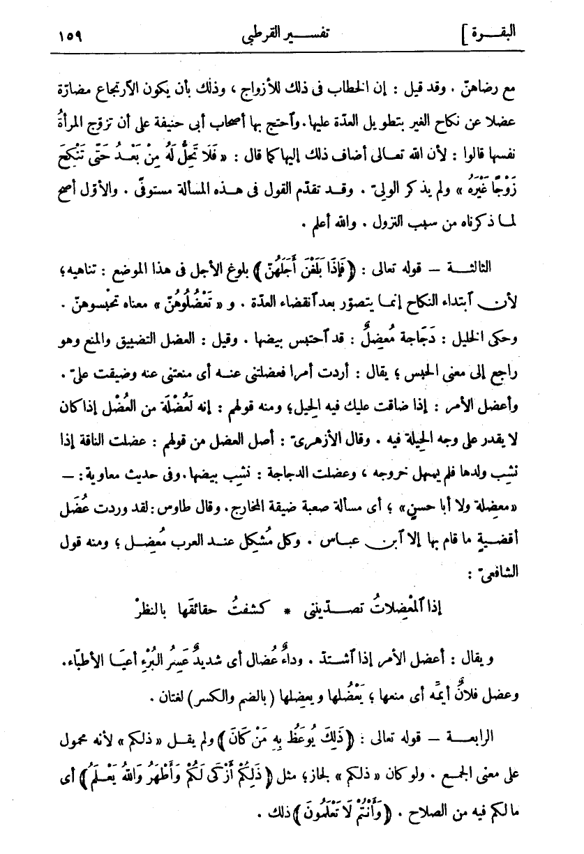 مَعَ رِضَاهُنَّ. وَقَدْ قِيلَ: إِنَّ الْخِطَابَ فِي ذَلِكَ لِلْأَزْوَاجِ، وَذَلِكَ بِأَنْ يَكُونَ الِارْتِجَاعُ مُضَارَّةً عَضْلًا عَنْ نِكَاحِ الْغَيْرِ بِتَطْوِيلِ الْعِدَّةِ عَلَيْهَا. وَاحْتَجَّ بِهَا أَصْحَابُ أَبِي حَنِيفَةَ عَلَى أَنْ تُزَوِّجَ الْمَرْأَةُ نَفْسَهَا قَالُوا: لِأَنَّ اللَّهَ تَعَالَى أَضَافَ ذَلِكَ إِلَيْهَا كَمَا قَالَ:" فَلا تَحِلُّ لَهُ مِنْ بَعْدُ حَتَّى تَنْكِحَ زَوْجاً غَيْرَهُ" وَلَمْ يَذْكُرِ الْوَلِيَّ. وَقَدْ تَقَدَّمَ الْقَوْلُ فِي هَذِهِ الْمَسْأَلَةِ مُسْتَوْفًى. وَالْأَوَّلُ أَصَحُّ لِمَا ذَكَرْنَاهُ مِنْ سَبَبِ النُّزُولِ. وَاللَّهُ أَعْلَمُ. الثَّالِثَةُ- قَوْلُهُ تَعَالَى: (فَبَلَغْنَ أَجَلَهُنَّ) بُلُوغُ الْأَجَلِ فِي هَذَا الْمَوْضِعِ: تَنَاهِيهِ، لِأَنَّ ابْتِدَاءَ النِّكَاحِ إِنَّمَا يُتَصَوَّرُ بَعْدَ انْقِضَاءِ الْعِدَّةِ. وَ" تَعْضُلُوهُنَّ" مَعْنَاهُ تَحْبِسُوهُنَّ. وَحَكَى الْخَلِيلُ: دَجَاجَةٌ مُعْضِلٌ: قَدِ احْتَبَسَ بِيضُهَا. وَقِيلَ: الْعَضْلُ التَّضْيِيقُ وَالْمَنْعُ وَهُوَ رَاجِعٌ إِلَى مَعْنَى الْحَبْسِ، يُقَالُ: أَرَدْتُ أَمْرًا فَعَضَلْتَنِي عَنْهُ أَيْ مَنَعْتَنِي عَنْهُ وَضَيَّقْتَ عَلَيَّ. وَأَعْضَلَ الْأَمْرُ: إِذَا ضَاقَتْ عَلَيْكَ فِيهِ الْحِيَلُ، وَمِنْهُ قَوْلُهُمْ: إِنَّهُ لَعُضْلَةٌ مِنَ الْعُضَلِ إِذَا كَانَ لَا يُقْدَرُ عَلَى وَجْهِ الْحِيلَةِ فِيهِ. وَقَالَ الْأَزْهَرِيُّ: أَصْلُ الْعَضْلِ مِنْ قَوْلِهِمْ: عَضَلَتِ النَّاقَةُ إِذَا نَشِبَ وَلَدُهَا فَلَمْ يَسْهُلْ خُرُوجُهُ، وَعَضَلَتِ الدَّجَاجَةُ: نَشِبَ بِيضُهَا. وَفِي حَدِيثِ مُعَاوِيَةَ:-" مُعْضِلَةٌ وَلَا أَبَا حَسَنٍ"، أَيْ مَسْأَلَةٌ صَعْبَةٌ ضَيِّقَةُ الْمَخَارِجِ. وَقَالَ طَاوُسٌ: لَقَدْ وَرَدَتْ عُضَلُ أَقْضِيَةٍ مَا قَامَ بِهَا إِلَّا ابْنُ عَبَّاسٍ. وَكُلُّ مُشْكِلٍ عِنْدَ الْعَرَبِ مُعْضِلٌ، وَمِنْهُ قَوْلُ الشَّافِعِيِّ: