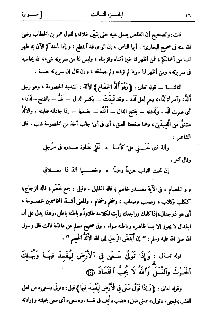 قُلْتُ: وَالصَّحِيحُ أَنَّ الظَّاهِرَ يُعْمَلُ عَلَيْهِ حَتَّى يَتَبَيَّنَ خِلَافُهُ، لِقَوْلِ عُمَرَ بْنِ الْخَطَّابِ رَضِيَ اللَّهُ عَنْهُ فِي صَحِيحِ الْبُخَارِيِّ: أَيُّهَا النَّاسُ، إِنَّ الْوَحْيَ قَدِ انْقَطَعَ، وَإِنَّمَا نَأْخُذُكُمُ الْآنَ بِمَا ظَهَرَ لَنَا مِنْ أَعْمَالِكُمْ، فَمَنْ أَظْهَرَ لَنَا خَيْرًا أَمَّنَّاهُ وَقَرَّبْنَاهُ، وَلَيْسَ لَنَا مِنْ سريرته شي، اللَّهُ يُحَاسِبُهُ فِي سَرِيرَتِهِ، وَمَنْ أَظْهَرَ لَنَا سُوءًا لَمْ نُؤَمِّنْهُ وَلَمْ نُصَدِّقْهُ، وَإِنْ قَالَ إِنَّ سَرِيرَتَهُ حَسَنَةٌ. الثَّالِثَةُ- قَوْلُهُ تَعَالَى: وَهُوَ أَلَدُّ الْخِصامِ الْأَلَدُّ: الشَّدِيدُ الْخُصُومَةِ، وَهُوَ رَجُلٌ أَلَدُّ، وَامْرَأَةٌ لَدَّاءُ، وَهُمْ أَهْلُ لَدَدٍ. وَقَدْ لَدِدْتَ- بِكَسْرِ الدَّالِ- تَلَدُّ- بِالْفَتْحِ- لَدَدًا، أَيْ صِرْتَ أَلَدَّ. وَلَدَدْتُهُ- بِفَتْحِ الدَّالِ- أَلُدُّهُ- بِضَمِّهَا- إِذَا جَادَلْتُهُ فَغَلَبْتُهُ. وَالْأَلَدُّ مُشْتَقٌّ مِنَ اللَّدِيدَيْنِ، وَهُمَا صَفْحَتَا الْعُنُقِ، أَيْ فِي أَيِّ جَانِبٍ أَخَذَ مِنَ الْخُصُومَةِ غَلَبَ. قَالَ الشَّاعِرُ: