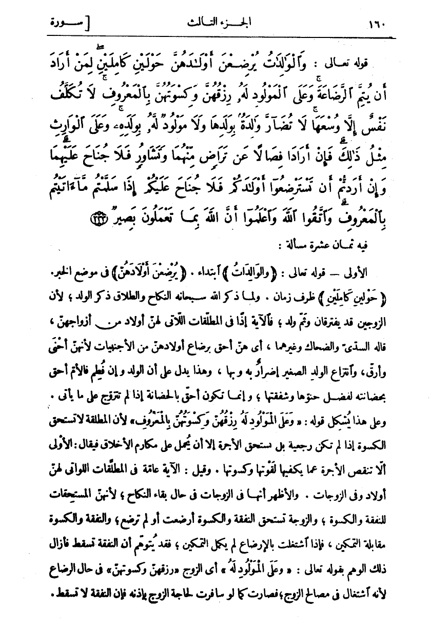 فِيهِ ثَمَانِ عَشْرَةَ مَسْأَلَةً: الْأُولَى- قَوْلُهُ تَعَالَى: (وَالْوالِداتُ) ابْتِدَاءٌ. (يُرْضِعْنَ أَوْلادَهُنَّ) فِي مَوْضِعِ الْخَبَرِ. (حَوْلَيْنِ كامِلَيْنِ) ظَرْفُ زَمَانٍ. وَلَمَّا ذَكَرَ اللَّهُ سُبْحَانَهُ النِّكَاحَ وَالطَّلَاقَ ذَكَرَ الْوَلَدَ، لِأَنَّ الزَّوْجَيْنِ قَدْ يَفْتَرِقَانِ وَثَمَّ وَلَدٌ، فَالْآيَةُ إِذًا فِي الْمُطَلَّقَاتِ اللَّاتِي لَهُنَّ أَوْلَادٌ مِنْ أَزْوَاجِهِنَّ، قال السُّدِّيُّ وَالضَّحَّاكُ وَغَيْرُهُمَا، أَيْ هُنَّ أَحَقُّ بِرَضَاعِ أَوْلَادِهِنَّ مِنَ الْأَجْنَبِيَّاتِ لِأَنَّهُنَّ أَحْنَى وَأَرَقُّ، وَانْتِزَاعُ الْوَلَدِ الصَّغِيرِ إِضْرَارٌ بِهِ وَبِهَا، وَهَذَا يَدُلُّ عَلَى أَنَّ الْوَلَدَ وَإِنْ فُطِمَ فَالْأُمُّ أَحَقُّ بِحَضَانَتِهِ لِفَضْلِ حُنُوِّهَا وَشَفَقَتِهَا، وَإِنَّمَا تَكُونُ أَحَقَّ بِالْحَضَانَةِ إِذَا لَمْ تَتَزَوَّجْ عَلَى مَا يَأْتِي. وَعَلَى هَذَا يُشْكِلُ قَوْلُهُ:" وَعَلَى الْمَوْلُودِ لَهُ رِزْقُهُنَّ وَكِسْوَتُهُنَّ بِالْمَعْرُوفِ" لِأَنَّ الْمُطَلَّقَةَ لَا تَسْتَحِقُّ الْكُسْوَةَ إِذَا لَمْ تَكُنْ رَجْعِيَّةً بَلْ تَسْتَحِقُّ الْأُجْرَةَ إِلَّا أَنْ يُحْمَلَ عَلَى مَكَارِمِ الْأَخْلَاقِ فَيُقَالُ: الْأَوْلَى أَلَّا تَنْقُصَ الْأُجْرَةُ عَمَّا يَكْفِيهَا لِقُوتِهَا وَكِسْوَتِهَا. وَقِيلَ: الْآيَةُ عَامَّةٌ فِي الْمُطَلَّقَاتِ اللَّوَاتِي لَهُنَّ أَوْلَادٌ وَفِي الزَّوْجَاتِ. وَالْأَظْهَرُ أَنَّهَا فِي الزَّوْجَاتِ فِي حَالِ بَقَاءِ النِّكَاحِ، لِأَنَّهُنَّ الْمُسْتَحِقَّاتُ لِلنَّفَقَةِ وَالْكُسْوَةِ، وَالزَّوْجَةُ تَسْتَحِقُّ النَّفَقَةَ وَالْكُسْوَةَ أَرْضَعَتْ أَوْ لَمْ تُرْضِعْ، وَالنَّفَقَةُ وَالْكُسْوَةُ مُقَابِلَةُ التَّمْكِينِ، فَإِذَا اشْتَغَلَتْ بِالْإِرْضَاعِ لَمْ يَكْمُلِ التَّمْكِينُ، فَقَدْ يُتَوَهَّمُ أَنَّ النَّفَقَةَ تَسْقُطُ فَأَزَالَ ذَلِكَ الْوَهْمَ بِقَوْلِهِ تَعَالَى:" وَعَلَى الْمَوْلُودِ لَهُ" أَيِ الزَّوْجِ" رِزْقُهُنَّ وَكِسْوَتُهُنَّ"، فِي حَالِ الرَّضَاعِ لِأَنَّهُ اشْتِغَالٌ فِي مَصَالِحِ الزَّوْجِ، فَصَارَتْ كَمَا لَوْ سَافَرَتْ لِحَاجَةِ الزَّوْجِ بِإِذْنِهِ فَإِنَّ النَّفَقَةَ لَا تسقط.