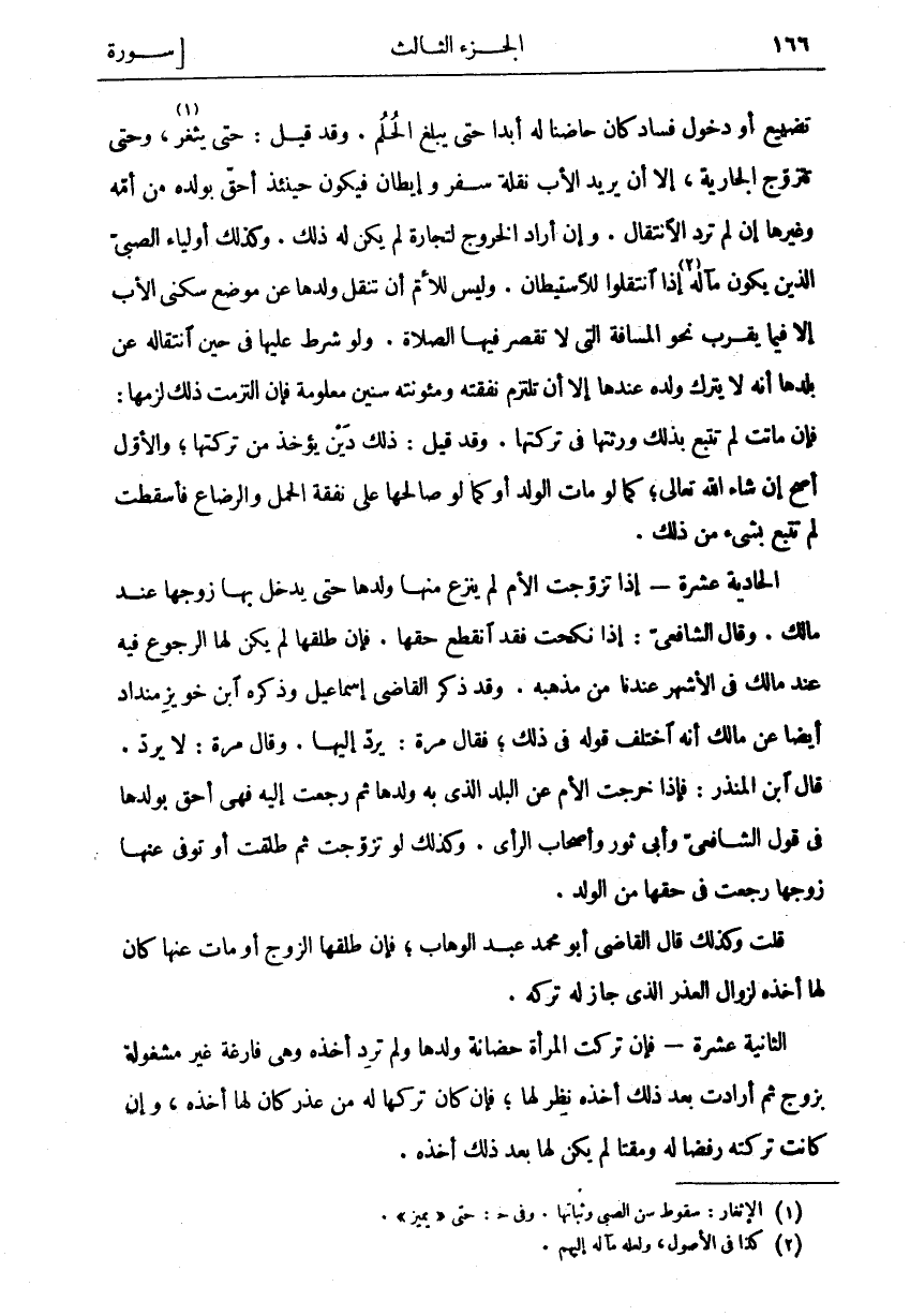 تَضْيِيعٌ أَوْ دُخُولُ فَسَادٍ كَانَ حَاضِنًا لَهُ أَبَدًا حَتَّى يَبْلُغَ الْحُلُمَ. وَقَدْ قِيلَ: حَتَّى يُثْغِرَ «١»، وَحَتَّى تَتَزَوَّجَ الْجَارِيَةُ، إِلَّا أَنْ يُرِيدَ الْأَبُ نَقْلَةَ سَفَرٍ وَإِيطَانٍ فَيَكُونُ حِينَئِذٍ أَحَقَّ بِوَلَدِهِ مِنْ أُمِّهِ وَغَيْرِهَا إِنْ لَمْ تُرِدِ الِانْتِقَالَ. وَإِنْ أَرَادَ الْخُرُوجَ لِتِجَارَةٍ لَمْ يَكُنْ لَهُ ذَلِكَ. وَكَذَلِكَ أَوْلِيَاءُ الصَّبِيِّ الَّذِينَ يَكُونُ مآله «٢» إِذَا انْتَقَلُوا لِلِاسْتِيطَانِ. وَلَيْسَ لِلْأُمِّ أَنْ تَنْقُلَ وَلَدَهَا عَنْ مَوْضِعِ سُكْنَى الْأَبِ إِلَّا فِيمَا يَقْرَبُ نَحْوَ الْمَسَافَةِ الَّتِي لَا تُقْصَرُ فِيهَا الصَّلَاةُ. وَلَوْ شَرَطَ عَلَيْهَا فِي حِينِ انْتِقَالِهِ عَنْ بَلَدِهَا أَنَّهُ لَا يَتْرُكُ وَلَدَهُ عِنْدَهَا إِلَّا أَنْ تَلْتَزِمَ نَفَقَتَهُ وَمَئُونَتَهُ سِنِينَ مَعْلُومَةً فَإِنِ الْتَزَمَتْ ذَلِكَ لَزِمَهَا: فَإِنْ مَاتَتْ لَمْ تُتْبَعْ بِذَلِكَ وَرَثَتُهَا فِي تَرِكَتِهَا. وَقَدْ قِيلَ: ذَلِكَ دَيْنٌ يُؤْخَذُ مِنْ تَرِكَتِهَا، وَالْأَوَّلُ أَصَحُّ إِنْ شَاءَ اللَّهُ تَعَالَى، كَمَا لَوْ مَاتَ الولد أَوْ كَمَا لَوْ صَالَحَهَا عَلَى نَفَقَةِ الْحَمْلِ وَالرَّضَاعِ فَأَسْقَطَتْ لَمْ تُتْبَعْ بِشَيْءٍ مِنْ ذَلِكَ. الْحَادِيَةَ عَشْرَةَ- إِذَا تَزَوَّجَتِ الْأُمُّ لَمْ يُنْزَعْ مِنْهَا وَلَدُهَا حَتَّى يَدْخُلَ بِهَا زَوْجُهَا عِنْدَ مَالِكٍ. وَقَالَ الشَّافِعِيُّ: إِذَا نَكِحَتْ فَقَدِ انْقَطَعَ حقها. فإن طلقها لم يكن له الرُّجُوعُ فِيهِ عِنْدَ مَالِكٍ فِي الْأَشْهَرِ عِنْدَنَا مِنْ مَذْهَبِهِ. وَقَدْ ذَكَرَ الْقَاضِي إِسْمَاعِيلُ وَذَكَرَهُ ابن خويز منداد أَيْضًا عَنْ مَالِكٍ أَنَّهُ اخْتَلَفَ قَوْلُهُ فِي ذَلِكَ، فَقَالَ مَرَّةً: يُرَدُّ إِلَيْهَا. وَقَالَ مَرَّةً: لَا يُرَدُّ. قَالَ ابْنُ الْمُنْذِرِ: فَإِذَا خَرَجَتِ الْأُمُّ عَنِ الْبَلَدِ الَّذِي بِهِ وَلَدُهَا ثُمَّ رَجَعَتْ إِلَيْهِ فَهِيَ أَحَقُّ بِوَلَدِهَا فِي قَوْلِ الشَّافِعِيِّ وَأَبِي ثَوْرٍ وَأَصْحَابِ الرَّأْيِ. وَكَذَلِكَ لَوْ تَزَوَّجَتْ ثُمَّ طُلِّقَتْ أَوْ تُوُفِّيَ عَنْهَا زَوْجُهَا رَجَعَتْ فِي حَقِّهَا مِنَ الْوَلَدِ. قُلْتُ وَكَذَلِكَ قَالَ الْقَاضِي أَبُو مُحَمَّدٍ عَبْدُ الْوَهَّابِ، فَإِنْ طَلَّقَهَا الزَّوْجُ أَوْ مَاتَ عَنْهَا كَانَ لَهَا أَخْذُهُ لِزَوَالِ الْعُذْرِ الَّذِي جَازَ لَهُ تَرْكُهُ. الثَّانِيَةَ عَشْرَةَ- فَإِنْ تَرَكَتِ الْمَرْأَةُ حَضَانَةَ وَلَدِهَا وَلَمْ تُرِدْ أَخْذَهُ وَهِيَ فَارِغَةٌ غَيْرُ مَشْغُولَةٍ بِزَوْجٍ ثُمَّ أَرَادَتْ بَعْدَ ذَلِكَ أَخْذَهُ نُظِرَ لَهَا، فَإِنْ كَانَ تَرْكُهَا لَهُ مِنْ عُذْرٍ كَانَ لَهَا أَخْذُهُ، وَإِنْ كَانَتْ