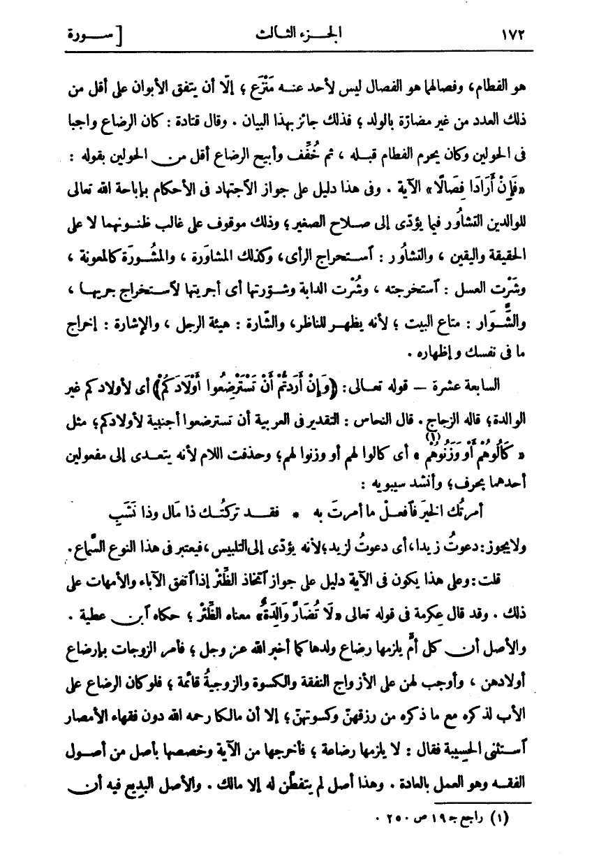 هُوَ الْفِطَامُ، وَفِصَالَهُمَا هُوَ الْفِصَالُ لَيْسَ لِأَحَدٍ عَنْهُ مَنْزَعٌ، إِلَّا أَنْ يَتَّفِقَ الْأَبَوَانِ عَلَى أَقَلَّ مِنْ ذَلِكَ الْعَدَدِ مِنْ غَيْرِ مَضَارَّةٍ بِالْوَلَدِ، فَذَلِكَ جَائِزٌ بِهَذَا الْبَيَانِ. وَقَالَ قَتَادَةُ: كَانَ الرَّضَاعُ وَاجِبًا فِي الْحَوْلَيْنِ وَكَانَ يَحْرُمُ الْفِطَامُ قَبْلَهُ، ثُمَّ خُفِّفَ وَأُبِيحَ الرَّضَاعُ أَقَلَّ مِنَ الْحَوْلَيْنِ بِقَوْلِهِ:" فَإِنْ أَرادا فِصالًا" الْآيَةَ. وَفِي هَذَا دَلِيلٌ عَلَى جَوَازِ الِاجْتِهَادِ فِي الْأَحْكَامِ بِإِبَاحَةِ اللَّهِ تَعَالَى لِلْوَالِدَيْنِ التَّشَاوُرَ فِيمَا يُؤَدِّي إِلَى صَلَاحِ الصَّغِيرِ، وَذَلِكَ مَوْقُوفٌ عَلَى غَالِبِ ظُنُونِهِمَا لَا عَلَى الْحَقِيقَةِ وَالْيَقِينِ، وَالتَّشَاوُرُ: اسْتِخْرَاجُ الرَّأْيِ، وَكَذَلِكَ الْمُشَاوَرَةُ، وَالْمَشُورَةُ كَالْمَعُونَةِ، وَشُرْتُ الْعَسَلَ: اسْتَخْرَجْتُهُ، وَشُرْتُ الدَّابَّةَ وَشَوَّرْتُهَا أَيْ أَجْرَيْتُهَا لِاسْتِخْرَاجِ جَرْيِهَا، وَالشَّوَارُ: مَتَاعُ الْبَيْتِ، لِأَنَّهُ يَظْهَرُ لِلنَّاظِرِ، وَالشَّارَةُ: هَيْئَةُ الرَّجُلِ، وَالْإِشَارَةُ: إِخْرَاجُ مَا فِي نَفْسِكَ وَإِظْهَارُهُ. السَّابِعَةَ عَشْرَةَ- قَوْلُهُ تَعَالَى: (وَإِنْ أَرَدْتُمْ أَنْ تَسْتَرْضِعُوا أَوْلادَكُمْ) أَيْ لِأَوْلَادِكُمْ غَيْرَ الْوَالِدَةِ، قَالَهُ الزَّجَّاجُ. قَالَ النَّحَّاسُ: التَّقْدِيرُ فِي الْعَرَبِيَّةِ أَنْ تَسْتَرْضِعُوا أَجْنَبِيَّةً لِأَوْلَادِكُمْ، مِثْلَ" كالُوهُمْ أَوْ وَزَنُوهُمْ «١» " أَيْ كَالُوا لَهُمْ أَوْ وَزَنُوا لَهُمْ، وَحُذِفَتِ اللَّامُ لِأَنَّهُ يَتَعَدَّى إِلَى مَفْعُولَيْنِ أَحَدَهُمَا بِحَرْفٍ، وَأَنْشَدَ سِيبَوَيْهِ: