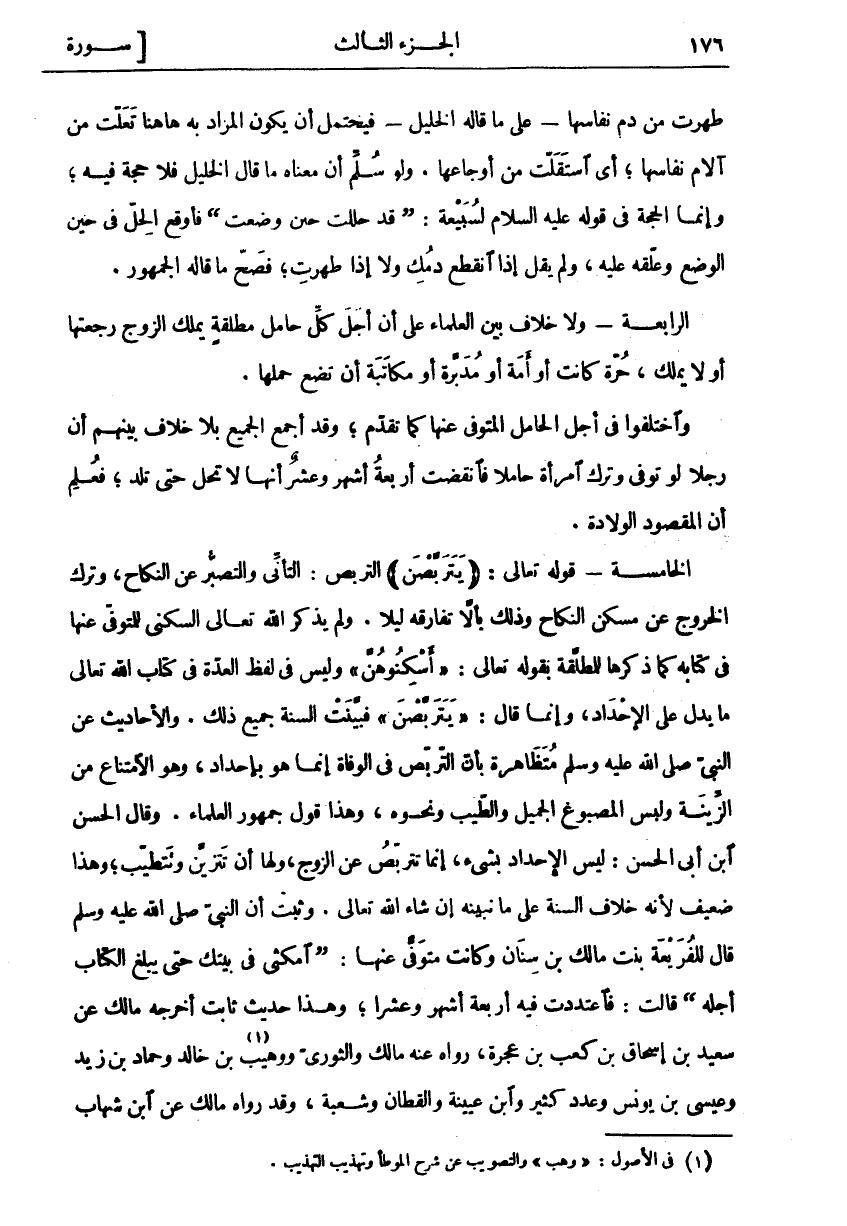 طَهُرَتْ مِنْ دَمِ نِفَاسِهَا- عَلَى مَا قَالَهُ الْخَلِيلُ- فَيُحْتَمَلُ أَنْ يَكُونَ الْمُرَادُ بِهِ هَاهُنَا تَعَلَّتْ مِنْ آلَامِ نِفَاسِهَا، أَيِ اسْتَقَلَّتْ مِنْ أَوْجَاعِهَا. وَلَوْ سَلِمَ أَنَّ مَعْنَاهُ مَا قَالَ الْخَلِيلُ فَلَا حُجَّةَ فِيهِ، وَإِنَّمَا الْحُجَّةُ فِي قَوْلِهِ عَلَيْهِ السَّلَامُ لِسُبَيْعَةَ:" قَدْ حَلَلْتِ حِينَ وَضَعْتِ" فَأَوْقَعَ الْحِلُّ فِي حِينِ الْوَضْعِ وَعَلَّقَهُ عَلَيْهِ، وَلَمْ يَقُلْ إِذَا انْقَطَعَ دَمُكِ وَلَا إِذَا طَهُرْتِ، فَصَحَّ مَا قَالَهُ الْجُمْهُورُ. الرَّابِعَةُ- وَلَا خِلَافَ بَيْنَ الْعُلَمَاءِ عَلَى أَنَّ أَجَلَ كُلِّ حَامِلٍ مُطَلَّقَةٍ يَمْلِكُ الزَّوْجُ رَجْعَتَهَا أَوْ لَا يَمْلِكُ، حُرَّةً كَانَتْ أَوْ أَمَةً أَوْ مُدَبَّرَةً أَوْ مُكَاتَبَةً أَنْ تَضَعَ حَمْلَهَا. وَاخْتَلَفُوا فِي أَجَلِ الْحَامِلِ الْمُتَوَفَّى عَنْهَا كَمَا تَقَدَّمَ، وَقَدْ أَجْمَعَ الْجَمِيعُ بِلَا خِلَافٍ بَيْنَهُمْ أَنَّ رَجُلًا لَوْ تُوُفِّيَ وَتَرَكَ امْرَأَةً حَامِلًا فَانْقَضَتْ أَرْبَعَةُ أَشْهُرٍ وَعَشْرٌ أَنَّهَا لَا تَحِلُّ حَتَّى تَلِدَ، فَعُلِمَ أَنَّ الْمَقْصُودَ الْوِلَادَةُ. الْخَامِسَةُ- قَوْلُهُ تَعَالَى: (يَتَرَبَّصْنَ) التَّرَبُّصُ: التَّأَنِّي وَالتَّصَبُّرُ عَنِ النِّكَاحِ، وَتَرْكُ الْخُرُوجِ عَنْ مَسْكَنِ النِّكَاحِ وَذَلِكَ بِأَلَّا تُفَارِقَهُ لَيْلًا. وَلَمْ يَذْكُرِ اللَّهُ تَعَالَى السُّكْنَى لِلْمُتَوَفَّى عَنْهَا فِي كِتَابِهِ كَمَا ذَكَرَهَا لِلْمُطَلَّقَةِ بِقَوْلِهِ تَعَالَى:" أَسْكِنُوهُنَّ" وَلَيْسَ فِي لَفْظِ الْعِدَّةِ فِي كِتَابِ اللَّهِ تَعَالَى مَا يَدُلُّ عَلَى الْإِحْدَادِ، وَإِنَّمَا قَالَ:" يَتَرَبَّصْنَ" فَبَيَّنَتِ السُّنَّةُ جَمِيعَ ذَلِكَ. وَالْأَحَادِيثُ عَنِ النَّبِيِّ صَلَّى اللَّهُ عَلَيْهِ وَسَلَّمَ مُتَظَاهِرَةٌ بِأَنَّ التَّرَبُّصَ فِي الْوَفَاةِ إِنَّمَا هُوَ بِإِحْدَادٍ، وَهُوَ الِامْتِنَاعُ عَنِ الزِّينَةِ وَلُبْسِ الْمَصْبُوغِ الْجَمِيلِ وَالطِّيبِ وَنَحْوِهِ، وَهَذَا قَوْلُ جُمْهُورِ الْعُلَمَاءِ. وَقَالَ الْحَسَنُ بْنُ أَبِي الْحَسَنِ: لَيْسَ الْإِحْدَادُ بِشَيْءٍ، إِنَّمَا تَتَرَبَّصُ عَنِ الزَّوْجِ، وَلَهَا أَنْ تَتَزَيَّنَ وَتَتَطَيَّبَ، وَهَذَا ضَعِيفٌ لِأَنَّهُ خِلَافُ السُّنَّةِ عَلَى مَا نُبَيِّنُهُ إِنْ شَاءَ اللَّهُ تَعَالَى. وَثَبَتَ أَنَّ النَّبِيَّ صَلَّى اللَّهُ عَلَيْهِ وَسَلَّمَ قَالَ لِلْفُرَيْعَةِ بِنْتِ مَالِكِ بْنِ سِنَانٍ وَكَانَتْ مُتَوَفًّى عَنْهَا:" امْكُثِي فِي بَيْتِكِ حَتَّى يَبْلُغَ الْكِتَابُ أَجَلَهُ" قَالَتْ: فَاعْتَدَدْتُ فِيهِ أَرْبَعَةَ أَشْهُرٍ وَعَشْرًا، وَهَذَا حَدِيثٌ ثَابِتٌ أَخْرَجَهُ مَالِكٌ عَنْ سَعْدِ بْنِ إِسْحَاقَ بْنِ كَعْبِ بْنِ عُجْرَةَ، رَوَاهُ عَنْهُ مَالِكٌ وَالثَّوْرِيُّ وَوُهَيْبُ «١» بْنُ خَالِدٍ وَحَمَّادُ بْنُ زَيْدٍ وَعِيسَى بْنُ يُونُسَ وَعَدَدٌ كَثِيرٌ وَابْنُ عُيَيْنَةَ وَالْقَطَّانُ وَشُعْبَةُ، وَقَدْ رَوَاهُ مَالِكٌ عن ابن شهاب