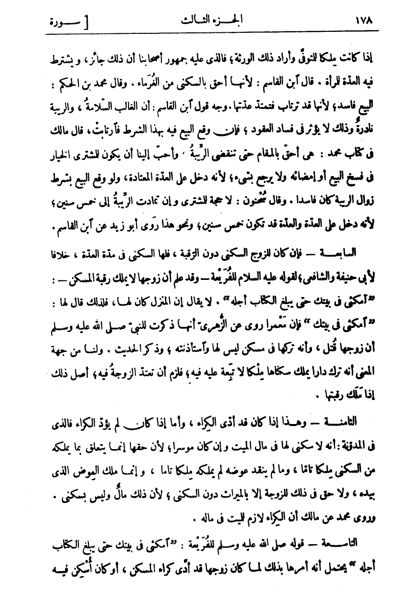 إِذَا كَانَتْ مِلْكًا لِلْمُتَوَفَّى وَأَرَادَ ذَلِكَ الْوَرَثَةُ، فَالَّذِي عَلَيْهِ جُمْهُورُ أَصْحَابِنَا أَنَّ ذَلِكَ جَائِزٌ، وَيُشْتَرَطُ فِيهِ الْعِدَّةُ لِلْمَرْأَةِ. قَالَ ابْنُ الْقَاسِمِ: لِأَنَّهَا أَحَقُّ بِالسُّكْنَى مِنَ الْغُرَمَاءِ. وَقَالَ مُحَمَّدُ بْنُ الْحَكَمِ: الْبَيْعُ فَاسِدٌ، لِأَنَّهَا قَدْ تَرْتَابُ فَتَمْتَدُّ عِدَّتُهَا. وَجْهُ قَوْلِ ابْنِ الْقَاسِمِ: أَنَّ الْغَالِبَ السَّلَامَةُ، وَالرِّيبَةَ نَادِرَةٌ وَذَلِكَ لَا يُؤَثِّرُ فِي فَسَادِ الْعُقُودِ، فَإِنْ وَقَعَ الْبَيْعُ فِيهِ بِهَذَا الشَّرْطِ فَارْتَابَتْ، قَالَ مَالِكٌ فِي كِتَابِ مُحَمَّدٍ: هِيَ أَحَقُّ بِالْمَقَامِ حَتَّى تَنْقَضِيَ الرِّيبَةُ، وَأَحَبُّ إِلَيْنَا أَنْ يَكُونَ لِلْمُشْتَرِي الْخِيَارُ فِي فَسْخِ الْبَيْعِ أَوْ إِمْضَائِهِ وَلَا يَرْجِعُ بِشَيْءٍ، لِأَنَّهُ دَخَلَ عَلَى الْعِدَّةِ الْمُعْتَادَةِ، وَلَوْ وَقَعَ الْبَيْعُ بِشَرْطِ زَوَالِ الرِّيبَةِ كَانَ فَاسِدًا. وَقَالَ سَحْنُونُ: لَا حُجَّةَ لِلْمُشْتَرِي وَإِنْ تَمَادَتِ الرِّيبَةُ إِلَى خَمْسِ سِنِينَ، لِأَنَّهُ دَخَلَ عَلَى الْعِدَّةِ وَالْعِدَّةُ قَدْ تَكُونُ خَمْسَ سِنِينَ، وَنَحْوَ هَذَا رَوَى أَبُو زَيْدٍ عَنِ ابْنِ الْقَاسِمِ. السَّابِعَةُ- فَإِنْ كَانَ لِلزَّوْجِ السُّكْنَى دُونَ الرَّقَبَةِ، فَلَهَا السُّكْنَى فِي مُدَّةِ الْعِدَّةِ، خِلَافًا لِأَبِي حَنِيفَةَ وَالشَّافِعِيِّ، لِقَوْلِهِ عَلَيْهِ السَّلَامُ لِلْفُرَيْعَةِ- وَقَدْ عَلِمَ أَنَّ زَوْجَهَا لَا يَمْلِكُ رَقَبَةَ الْمَسْكَنِ-:" امْكُثِي فِي بَيْتِكِ حَتَّى يَبْلُغَ الْكِتابُ أَجَلَهُ". لَا يُقَالُ إِنَّ الْمَنْزِلَ كَانَ لَهَا، فَلِذَلِكَ قَالَ لَهَا:" امْكُثِي فِي بَيْتِكِ" فَإِنَّ مَعْمَرًا رَوَى عَنِ الزُّهْرِيِّ أَنَّهَا ذَكَرَتْ لِلنَّبِيِّ صَلَّى اللَّهُ عَلَيْهِ وَسَلَّمَ أَنَّ زَوْجَهَا قُتِلَ، وَأَنَّهُ تَرَكَهَا فِي مَسْكَنٍ لَيْسَ لَهَا وَاسْتَأْذَنَتْهُ، وَذَكَرَ الْحَدِيثَ. وَلَنَا مِنْ جِهَةِ الْمَعْنَى أَنَّهُ تَرَكَ دَارًا يَمْلِكُ سُكْنَاهَا مِلْكًا لَا تَبِعَةَ عَلَيْهِ فِيهِ، فَلَزِمَ أَنْ تَعْتَدَّ الزَّوْجَةُ فِيهِ، أَصْلُ ذَلِكَ إِذَا مَلَكَ رَقَبَتَهَا. الثَّامِنَةُ- وَهَذَا إِذَا كَانَ قَدْ أَدَّى الْكِرَاءَ، وَأَمَّا إِذَا كَانَ لَمْ يُؤَدِّ الْكِرَاءَ فَالَّذِي فِي الْمُدَوَّنَةِ: أَنَّهُ لَا سُكْنَى لَهَا فِي مَالِ الْمَيِّتِ وَإِنْ كَانَ مُوسِرًا، لِأَنَّ حَقَّهَا إِنَّمَا يَتَعَلَّقُ بِمَا يَمْلِكُهُ مِنَ السُّكْنَى مِلْكًا تَامًّا، وَمَا لَمْ يَنْقُدْ عِوَضَهُ لَمْ يَمْلِكْهُ مِلْكًا تَامًّا، وَإِنَّمَا مَلَكَ الْعِوَضَ الَّذِي بِيَدِهِ، وَلَا حَقَّ فِي ذَلِكَ لِلزَّوْجَةِ إِلَّا بِالْمِيرَاثِ دُونَ السُّكْنَى، لِأَنَّ ذَلِكَ مَالٌ وَلَيْسَ بِسُكْنَى. وَرَوَى مُحَمَّدٌ عَنْ مَالِكٍ أَنَّ الْكِرَاءَ لَازِمٌ لِلْمَيِّتِ فِي مَالِهِ. التَّاسِعَةُ- قَوْلُهُ صَلَّى اللَّهُ عَلَيْهِ وَسَلَّمَ لِلْفُرَيْعَةِ:" امْكُثِي فِي بَيْتِكِ حَتَّى يَبْلُغَ الْكِتَابُ أَجَلَهُ" يُحْتَمَلُ أَنَّهُ أَمَرَهَا بِذَلِكَ لَمَّا كَانَ زَوْجُهَا قَدْ أَدَّى كِرَاءَ الْمَسْكَنِ، أَوْ كَانَ أُسْكِنَ فِيهِ
