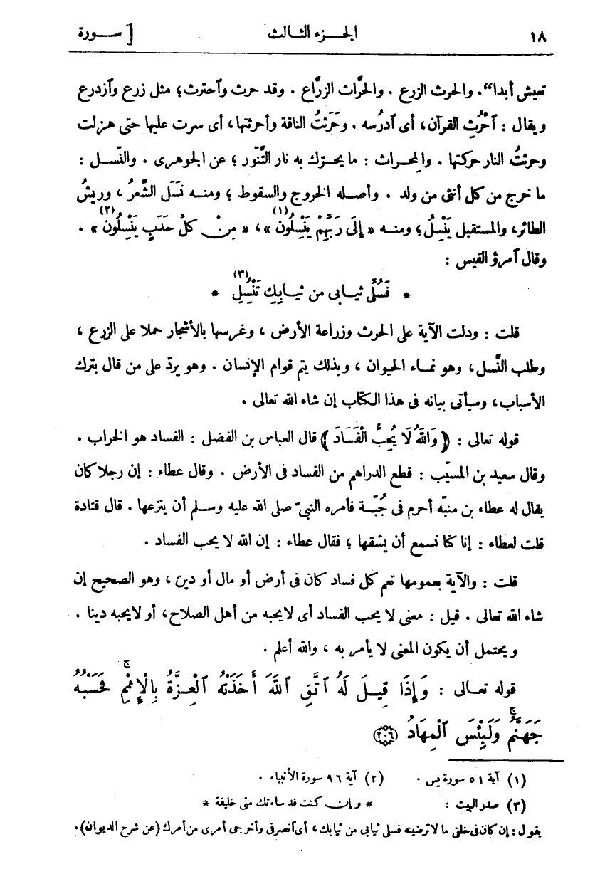 قُلْتُ: وَدَلَّتِ الْآيَةُ عَلَى الْحَرْثِ وَزِرَاعَةِ الْأَرْضِ، وَغَرْسِهَا بِالْأَشْجَارِ حَمْلًا عَلَى الزَّرْعِ، وَطَلَبِ النَّسْلِ، وَهُوَ. نَمَاءُ الْحَيَوَانِ، وَبِذَلِكَ يَتِمُّ قِوَامُ الْإِنْسَانِ. وَهُوَ يَرُدُّ عَلَى مَنْ قَالَ بِتَرْكِ الْأَسْبَابِ، وَسَيَأْتِي بَيَانُهُ فِي هَذَا الْكِتَابِ إِنْ شَاءَ اللَّهُ تَعَالَى. قَوْلُهُ تَعَالَى: وَاللَّهُ لَا يُحِبُّ الْفَسادَ قَالَ الْعَبَّاسُ بْنُ الْفَضْلِ: الْفَسَادُ هُوَ الْخَرَابُ. وَقَالَ سَعِيدُ بْنُ الْمُسَيَّبِ: قَطْعُ الدَّرَاهِمِ مِنَ الْفَسَادِ في الأرض. وقال عطاء: إن رجلا كان يُقَالُ لَهُ عَطَاءُ بْنُ مُنَبِّهٍ أَحْرَمَ فِي جُبَّةٍ فَأَمَرَهُ النَّبِيُّ صَلَّى اللَّهُ عَلَيْهِ وَسَلَّمَ أَنْ يَنْزِعَهَا. قَالَ قَتَادَةُ قُلْتُ لِعَطَاءٍ: إِنَّا كُنَّا نَسْمَعُ أَنْ يَشُقَّهَا، فَقَالَ عَطَاءٌ: إِنَّ اللَّهَ لَا يُحِبُّ الْفَسَادَ. قُلْتُ: وَالْآيَةُ بِعُمُومِهَا تَعُمُّ كُلَّ فَسَادٍ كَانَ فِي أَرْضٍ أَوْ مَالٍ أَوْ دِينٍ، وَهُوَ الصَّحِيحُ إِنْ شَاءَ اللَّهُ تَعَالَى. قِيلَ: مَعْنَى لَا يُحِبُّ الْفَسَادَ أَيْ لَا يُحِبُّهُ مِنْ أَهْلِ الصَّلَاحِ، أَوْ لَا يُحِبُّهُ دِينًا. وَيُحْتَمَلُ أَنْ يَكُونَ الْمَعْنَى لا يأمر به، والله أعلم.