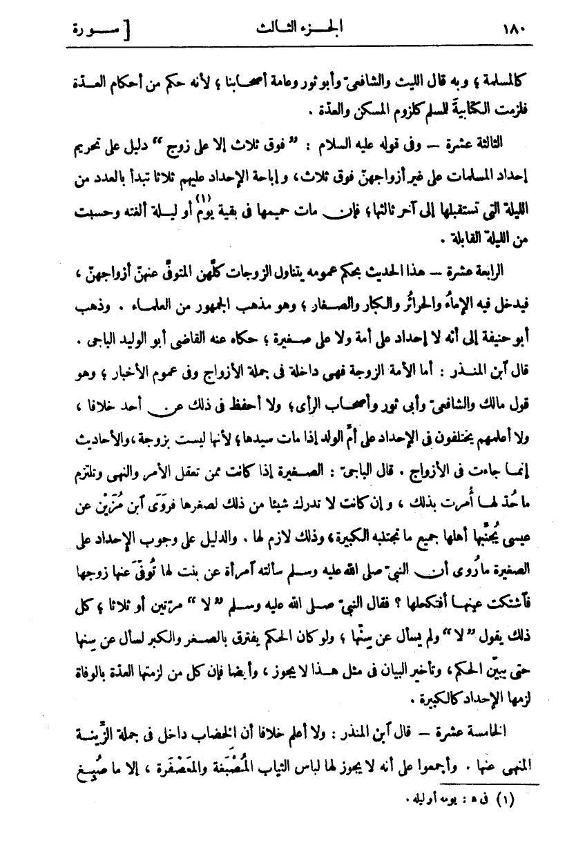 ، كَالْمُسْلِمَةِ، وَبِهِ قَالَ اللَّيْثُ وَالشَّافِعِيُّ وَأَبُو ثَوْرٍ وَعَامَّةُ أَصْحَابِنَا، لِأَنَّهُ حُكْمٌ مِنْ أَحْكَامِ الْعِدَّةِ فَلَزِمَتِ الْكِتَابِيَّةُ لِلْمُسْلِمِ كَلُزُومِ الْمَسْكَنِ وَالْعِدَّةِ. الثَّالِثَةَ عَشْرَةَ- وَفِي قَوْلِهِ عَلَيْهِ السَّلَامُ:" فَوْقَ ثَلَاثٍ إِلَّا عَلَى زَوْجٍ" دَلِيلٌ عَلَى تَحْرِيمِ إِحْدَادِ الْمُسْلِمَاتِ عَلَى غَيْرِ أَزْوَاجِهِنَّ فَوْقَ ثَلَاثٍ، وَإِبَاحَةُ الْإِحْدَادِ عَلَيْهِمْ ثَلَاثًا تَبْدَأُ بِالْعَدَدِ مِنَ اللَّيْلَةِ الَّتِي تَسْتَقْبِلُهَا إِلَى آخِرِ ثَالِثِهَا، فَإِنْ مَاتَ حَمِيمُهَا فِي بَقِيَّةِ يَوْمٍ «١» أَوْ لَيْلَةٍ أَلْغَتْهُ وَحَسَبَتْ مِنَ اللَّيْلَةِ الْقَابِلَةِ. الرَّابِعَةَ عَشْرَةَ- هَذَا الْحَدِيثُ بِحُكْمِ عُمُومِهِ يَتَنَاوَلُ الزَّوْجَاتِ كُلَّهُنَّ الْمُتَوَفَّى عَنْهُنَّ أَزْوَاجُهُنَّ، فَيَدْخُلُ فِيهِ الْإِمَاءُ وَالْحَرَائِرُ وَالْكِبَارُ وَالصِّغَارُ، وَهُوَ مَذْهَبُ الْجُمْهُورِ مِنَ الْعُلَمَاءِ. وَذَهَبَ أَبُو حَنِيفَةَ إِلَى أَنَّهُ لَا إِحْدَادَ عَلَى أَمَةٍ وَلَا عَلَى صَغِيرَةٍ، حَكَاهُ عَنْهُ الْقَاضِي أَبُو الْوَلِيدِ الْبَاجِيُّ. قَالَ ابْنُ الْمُنْذِرِ: أَمَّا الْأَمَةُ الزَّوْجَةُ فَهِيَ دَاخِلَةٌ فِي جُمْلَةِ الْأَزْوَاجِ وَفِي عُمُومِ الْأَخْبَارِ، وَهُوَ قَوْلُ مَالِكٍ وَالشَّافِعِيِّ وَأَبِي ثَوْرٍ وَأَصْحَابِ الرَّأْيِ، وَلَا أَحْفَظُ فِي ذَلِكَ عَنْ أَحَدٍ خِلَافًا، وَلَا أَعْلَمُهُمْ يَخْتَلِفُونَ فِي الْإِحْدَادِ عَلَى أُمِّ الْوَلَدِ إِذَا مَاتَ سَيِّدُهَا، لِأَنَّهَا لَيْسَتْ بِزَوْجَةٍ، وَالْأَحَادِيثُ إِنَّمَا جَاءَتْ فِي الْأَزْوَاجِ. قَالَ الْبَاجِيُّ: الصَّغِيرَةُ إِذَا كَانَتْ مِمَّنْ تَعْقِلُ الْأَمْرَ وَالنَّهْيَ وَتَلْتَزِمُ مَا حُدَّ لَهَا أُمِرَتْ بِذَلِكَ، وَإِنْ كَانَتْ لَا تُدْرِكُ شَيْئًا مِنْ ذَلِكَ لِصِغَرِهَا فَرَوَى ابْنُ مُزَيْنٍ عَنْ عِيسَى يُجَنِّبُهَا أَهْلُهَا جَمِيعَ مَا تَجْتَنِبُهُ الْكَبِيرَةُ، وَذَلِكَ لَازِمٌ لَهَا. وَالدَّلِيلُ عَلَى وُجُوبِ الْإِحْدَادِ عَلَى الصَّغِيرَةِ مَا رُوِيَ أَنَّ النَّبِيَّ صَلَّى اللَّهُ عَلَيْهِ وَسَلَّمَ سَأَلَتْهُ امْرَأَةٌ عَنْ بِنْتٍ لَهَا تُوُفِّيَ عَنْهَا زَوْجُهَا فَاشْتَكَتْ عَيْنَهَا أَفَتُكَحِّلُهَا؟ فَقَالَ النَّبِيَّ صَلَّى اللَّهُ عَلَيْهِ وَسَلَّمَ" لَا" مَرَّتَيْنِ أَوْ ثَلَاثًا، كُلُّ ذَلِكَ يَقُولُ" لَا" وَلَمْ يَسْأَلْ عَنْ سِنِّهَا، وَلَوْ كَانَ الْحُكْمُ يَفْتَرِقُ بِالصِّغَرِ وَالْكِبَرِ لَسَأَلَ عَنْ سِنِّهَا حَتَّى يُبَيِّنَ الْحُكْمَ، وَتَأْخِيرُ الْبَيَانِ فِي مِثْلِ هَذَا لَا يَجُوزُ، وَأَيْضًا فَإِنَّ كُلَّ مَنْ لَزِمَتْهَا الْعِدَّةُ بِالْوَفَاةِ لَزِمَهَا الْإِحْدَادُ كَالْكَبِيرَةِ. الْخَامِسَةَ عَشْرَةَ- قَالَ ابْنُ الْمُنْذِرِ: وَلَا أَعْلَمُ خِلَافًا أَنَّ الْخِضَابَ دَاخِلٌ فِي جُمْلَةِ الزِّينَةِ الْمَنْهِيِّ عَنْهَا. وَأَجْمَعُوا عَلَى أَنَّهُ لَا يَجُوزُ لَهَا لِبَاسُ الثِّيَابِ الْمُصْبَغَةِ وَالْمُعَصْفَرَةِ، إِلَّا مَا صُبِغَ