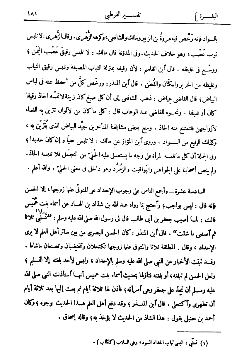 بِالسَّوَادِ فَإِنَّهُ رَخَّصَ فِيهِ عُرْوَةُ بْنُ الزُّبَيْرِ وَمَالِكٌ وَالشَّافِعِيُّ، وَكَرِهَهُ الزُّهْرِيُّ. وَقَالَ الزُّهْرِيُّ: لَا تَلْبَسُ ثَوْبَ عَصْبٍ، وَهُوَ خِلَافُ الْحَدِيثِ. وَفِي الْمُدَوَّنَةِ قَالَ مَالِكٌ: لَا تَلْبَسُ رَقِيقَ عَصْبِ الْيَمَنِ، وَوَسَّعَ فِي غَلِيظِهِ. قَالَ ابْنُ الْقَاسِمِ: لِأَنَّ رَقِيقَهُ بِمَنْزِلَةِ الثِّيَابِ الْمُصْبَغَةِ وَتَلْبَسُ رَقِيقَ الثِّيَابِ وَغَلِيظَهُ مِنَ الْحَرِيرِ وَالْكَتَّانِ وَالْقُطْنِ. قَالَ ابْنُ الْمُنْذِرِ: وَرَخَّصَ كُلُّ مَنْ أَحْفَظُ عَنْهُ فِي لِبَاسِ الْبَيَاضِ، قَالَ الْقَاضِي عِيَاضٌ: ذَهَبَ الشَّافِعِيُّ إِلَى أَنَّ كُلَّ صَبْغٍ كَانَ زِينَةً لَا تَمَسُّهُ الْحَادُّ رَقِيقًا كَانَ أَوْ غَلِيظًا. وَنَحْوُهُ لِلْقَاضِي عَبْدِ الْوَهَّابِ قَالَ: كُلُّ مَا كَانَ مِنَ الْأَلْوَانِ تَتَزَيَّنُ بِهِ النِّسَاءُ لِأَزْوَاجِهِنَّ فَلْتَمْتَنِعْ مِنْهُ الْحَادُّ. وَمَنَعَ بَعْضُ، مَشَايِخِنَا الْمُتَأَخِّرِينَ جَيِّدَ الْبَيَاضِ الَّذِي يُتَزَيَّنُ بِهِ، وَكَذَلِكَ الرَّفِيعَ مِنَ السَّوَادِ. وَرَوَى ابْنُ الْمَوَّازِ عَنْ مَالِكٍ: لَا تَلْبَسُ حُلِيًّا وَإِنْ كَانَ حَدِيدًا، وَفِي الْجُمْلَةِ أَنَّ كُلَّ مَا تَلْبَسُهُ الْمَرْأَةُ عَلَى وَجْهِ مَا يُسْتَعْمَلُ عَلَيْهِ الْحُلِيُّ مِنَ التَّجَمُّلِ فَلَا تَلْبَسْهُ الْحَادُّ. وَلَمْ يَنُصَّ أَصْحَابُنَا عَلَى الْجَوَاهِرِ وَالْيَوَاقِيتِ وَالزُّمُرُّدِ وَهُوَ دَاخِلٌ فِي مَعْنَى الْحُلِيِّ. وَاللَّهُ أَعْلَمُ. السَّادِسَةَ عَشْرَةَ- وَأَجْمَعَ النَّاسُ عَلَى وُجُوبِ الْإِحْدَادِ عَلَى الْمُتَوَفَّى عَنْهَا زَوْجُهَا، إِلَّا الْحَسَنَ فَإِنَّهُ قَالَ: لَيْسَ بِوَاجِبٍ، وَاحْتَجَّ بِمَا رَوَاهُ عَبْدُ اللَّهِ بْنُ شَدَّادِ بْنِ الْهَادِ عَنْ أَسْمَاءَ بِنْتِ عُمَيْسٍ قَالَتْ: لَمَّا أُصِيبَ جَعْفَرُ بْنُ أَبِي طَالِبٍ قَالَ لِي رَسُولُ اللَّهِ صَلَّى اللَّهُ عَلَيْهِ وَسَلَّمَ:" تَسَلَّبِي «١» ثَلَاثًا ثُمَّ اصْنَعِي مَا شِئْتِ". قَالَ ابْنُ الْمُنْذِرِ: كَانَ الْحَسَنُ الْبَصْرِيُّ مِنْ بَيْنِ سَائِرِ أَهْلِ الْعِلْمِ لَا يَرَى الْإِحْدَادَ، وَقَالَ: الْمُطَلَّقَةُ ثَلَاثًا وَالْمُتَوَفَّى عَنْهَا زَوْجُهَا تَكْتَحِلَانِ وَتَخْتَضِبَانِ وَتَصْنَعَانِ مَا شَاءَا. وَقَدْ ثَبَتَتِ الْأَخْبَارُ عَنِ النَّبِيِّ صَلَّى اللَّهُ عَلَيْهِ وَسَلَّمَ بِالْإِحْدَادِ، وَلَيْسَ لِأَحَدٍ بَلَغَتْهُ إِلَّا التَّسْلِيمُ، وَلَعَلَّ الْحَسَنَ لَمْ تَبْلُغْهُ، أَوْ بَلَغَتْهُ فَتَأَوَّلَهَا بِحَدِيثِ أَسْمَاءَ بِنْتِ عُمَيْسٍ أَنَّهَا اسْتَأْذَنَتِ النَّبِيَّ صَلَّى اللَّهُ عَلَيْهِ وَسَلَّمَ أَنْ تُحِدَّ عَلَى جَعْفَرٍ وَهَى امْرَأَتُهُ، فَأَذِنَ لَهَا ثَلَاثَةَ أَيَّامٍ ثُمَّ بَعَثَ إِلَيْهَا بَعْدَ ثَلَاثَةِ أَيَّامٍ أَنْ تَطَهَّرِي وَاكْتَحِلِي. قَالَ ابْنُ الْمُنْذِرِ، وَقَدْ دَفَعَ أَهْلُ الْعِلْمِ هَذَا الْحَدِيثَ بِوُجُوهٍ، وَكَانَ أَحْمَدُ بْنُ حَنْبَلٍ يَقُولُ: هَذَا الشاذ من الحديث لا يؤخذ به، وقال إسحاق.