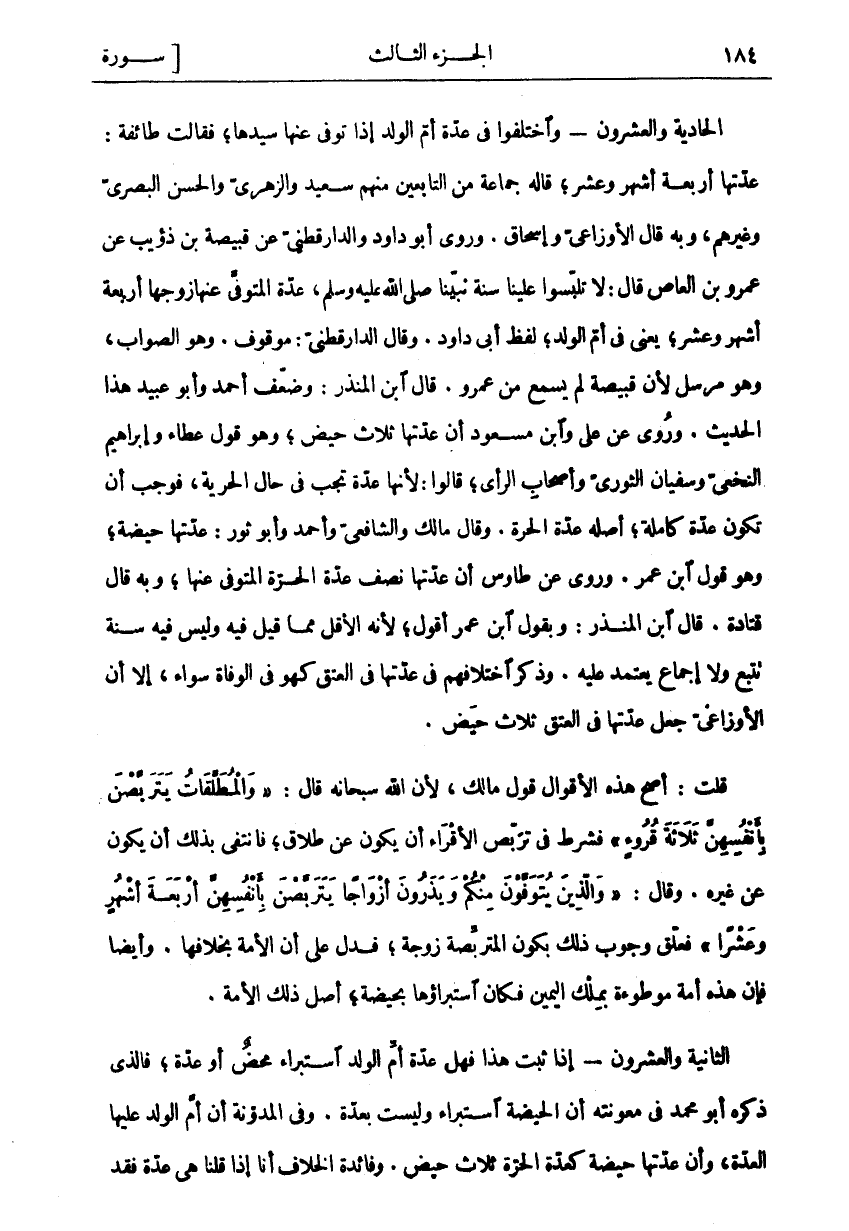 الْحَادِيَةُ وَالْعِشْرُونَ- وَاخْتَلَفُوا فِي عِدَّةِ أُمِّ الْوَلَدِ إِذَا تُوُفِّيَ عَنْهَا سَيِّدُهَا، فَقَالَتْ طَائِفَةٌ: عِدَّتُهَا أَرْبَعَةُ أَشْهُرٍ وَعَشْرٌ، قَالَهُ جَمَاعَةٌ مِنَ التَّابِعِينَ مِنْهُمْ سَعِيدٌ وَالزُّهْرِيُّ وَالْحَسَنُ الْبَصْرِيُّ وَغَيْرُهُمْ، وَبِهِ قَالَ الْأَوْزَاعِيُّ وَإِسْحَاقُ. وَرَوَى أَبُو دَاوُدَ وَالدَّارَقُطْنِيُّ عَنْ قَبِيصَةَ بْنِ ذُؤَيْبٍ عَنْ عَمْرِو بْنِ الْعَاصِ قَالَ: لَا تُلَبِّسُوا عَلَيْنَا سُنَّةَ نَبِيِّنَا صَلَّى اللَّهُ عَلَيْهِ وَسَلَّمَ، عِدَّةُ الْمُتَوَفَّى عَنْهَا زَوْجُهَا أَرْبَعَةُ أَشْهُرٍ وَعَشْرٌ، يَعْنِي فِي أُمِّ الْوَلَدِ، لَفْظُ أَبِي دَاوُدَ. وَقَالَ الدَّارَقُطْنِيُّ: مَوْقُوفٌ. وَهُوَ الصَّوَابُ، وَهُوَ مُرْسَلٌ لِأَنَّ قَبِيصَةَ لَمْ يَسْمَعْ مِنْ عَمْرٍو. قَالَ ابْنُ الْمُنْذِرِ: وَضَعَّفَ أَحْمَدُ وَأَبُو عُبَيْدٍ هَذَا الْحَدِيثَ. وَرُوِيَ عَنْ عَلِيٍّ وَابْنِ مَسْعُودٍ أَنَّ عِدَّتَهَا ثَلَاثُ حِيَضٍ، وَهُوَ قَوْلُ عَطَاءٍ وَإِبْرَاهِيمَ النَّخَعِيِّ وَسُفْيَانَ الثَّوْرِيِّ وَأَصْحَابِ الرَّأْيِ، قَالُوا: لِأَنَّهَا عِدَّةٌ تَجِبُ فِي حَالِ الْحُرِّيَّةِ، فَوَجَبَ أَنْ تَكُونَ عِدَّةً كَامِلَةً، أَصْلُهُ عِدَّةُ الْحُرَّةِ. وَقَالَ مَالِكٌ وَالشَّافِعِيُّ وَأَحْمَدُ وَأَبُو ثَوْرٍ: عِدَّتُهَا حَيْضَةٌ، وَهُوَ قَوْلُ ابْنِ عُمَرَ. وَرُوِيَ عَنْ طَاوُسٍ أَنَّ عِدَّتَهَا نِصْفُ عِدَّةِ الْحُرَّةِ الْمُتَوَفَّى عَنْهَا، وَبِهِ قَالَ قَتَادَةُ. قَالَ ابْنُ الْمُنْذِرِ: وَبِقَوْلِ ابْنِ عُمَرَ أَقُولُ، لِأَنَّهُ الْأَقَلُّ مِمَّا قِيلَ فِيهِ وَلَيْسَ فِيهِ سُنَّةٌ تُتَّبَعُ وَلَا إِجْمَاعٌ يُعْتَمَدُ عَلَيْهِ. وَذِكْرُ اخْتِلَافِهِمْ فِي عِدَّتِهَا فِي الْعِتْقِ كَهُوَ فِي الْوَفَاةِ سَوَاءٌ، إِلَّا أَنَّ الْأَوْزَاعِيَّ جَعَلَ عِدَّتَهَا فِي الْعِتْقِ ثَلَاثَ حِيَضٍ. قُلْتُ: أَصَحُّ هَذِهِ الْأَقْوَالِ قَوْلُ مَالِكٍ، لِأَنَّ اللَّهَ سُبْحَانَهُ قَالَ:" وَالْمُطَلَّقاتُ يَتَرَبَّصْنَ بِأَنْفُسِهِنَّ ثَلاثَةَ قُرُوءٍ" فَشَرَطَ فِي تَرَبُّصِ الْأَقْرَاءِ أَنْ يَكُونَ عَنْ طَلَاقٍ، فَانْتَفَى بِذَلِكَ أَنْ يَكُونَ عَنْ غَيْرِهِ. وَقَالَ:" وَالَّذِينَ يُتَوَفَّوْنَ مِنْكُمْ وَيَذَرُونَ أَزْواجاً يَتَرَبَّصْنَ بِأَنْفُسِهِنَّ أَرْبَعَةَ أَشْهُرٍ وَعَشْراً" فَعَلَّقَ وُجُوبَ ذَلِكَ بِكَوْنِ الْمُتَرَبِّصَةِ زَوْجَةً، فَدَلَّ عَلَى أَنَّ الْأَمَةَ بِخِلَافِهَا. وَأَيْضًا فَإِنَّ هَذِهِ أَمَةٌ مَوْطُوءَةٌ بِمِلْكِ الْيَمِينِ فَكَانَ اسْتِبْرَاؤُهَا بِحَيْضَةٍ، أَصْلُ ذَلِكَ الْأَمَةُ. الثَّانِيَةُ وَالْعِشْرُونَ- إِذَا ثَبَتَ هَذَا فَهَلْ عِدَّةُ أُمِّ الْوَلَدِ اسْتِبْرَاءٌ مَحْضٌ أَوْ عِدَّةٌ، فَالَّذِي ذَكَرَهُ أَبُو مُحَمَّدٍ فِي مَعُونَتِهِ أَنَّ الْحَيْضَةَ اسْتِبْرَاءٌ وَلَيْسَتْ بِعِدَّةٍ. وَفِي الْمُدَوَّنَةِ أَنَّ أُمَّ الْوَلَدِ عَلَيْهَا الْعِدَّةُ، وَأَنَّ عِدَّتَهَا حَيْضَةٌ كَعِدَّةِ الْحُرَّةِ ثَلَاثِ حِيَضٍ. وَفَائِدَةُ الْخِلَافِ أَنَّا إِذَا قُلْنَا هِيَ عدة فقد