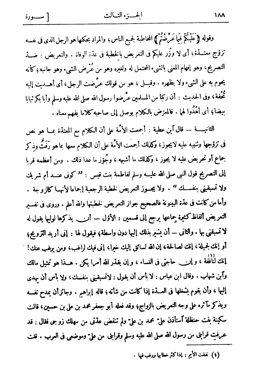 وَقَوْلُهُ (عَلَيْكُمْ فِيما عَرَّضْتُمْ) الْمُخَاطَبَةُ لِجَمِيعِ النَّاسِ، وَالْمُرَادُ بِحُكْمِهَا هُوَ الرَّجُلُ الَّذِي فِي نَفْسِهِ تزوج معتدة لَا وِزْرَ عَلَيْكُمْ فِي التَّعْرِيضِ بِالْخِطْبَةِ فِي عِدَّةِ الْوَفَاةِ. وَالتَّعْرِيضُ: ضِدُّ التَّصْرِيحِ، وَهُوَ إِفْهَامُ الْمَعْنَى بِالشَّيْءِ الْمُحْتَمَلِ لَهُ وَلِغَيْرِهِ وَهُوَ مِنْ عُرْضِ الشَّيْءِ وَهُوَ جَانِبُهُ، كَأَنَّهُ يَحُومُ بِهِ عَلَى الشَّيْءِ وَلَا يُظْهِرُهُ. وَقِيلَ، هُوَ مِنْ قَوْلِكَ عَرَّضْتُ الرَّجُلَ، أَيْ أَهْدَيْتُ إِلَيْهِ تُحْفَةً، وَفِي الْحَدِيثِ: أَنَّ رَكْبًا مِنَ الْمُسْلِمِينَ عَرَّضُوا رَسُولَ اللَّهِ صَلَّى اللَّهُ عَلَيْهِ وَسَلَّمَ وَأَبَا بكر ثيابا بيضا، أَيْ أَهْدَوْا لَهُمَا. فَالْمُعَرِّضُ بِالْكَلَامِ يُوصِلُ إِلَى صَاحِبِهِ كَلَامًا يُفْهَمُ مَعْنَاهُ. الثَّانِيَةُ- قَالَ ابْنُ عَطِيَّةَ: أَجْمَعَتِ الْأُمَّةُ عَلَى أَنَّ الْكَلَامَ مَعَ الْمُعْتَدَّةِ بِمَا هُوَ نَصٌّ فِي تَزَوُّجِهَا وَتَنْبِيهٌ عَلَيْهِ لَا يَجُوزُ، وَكَذَلِكَ أَجْمَعَتِ الْأُمَّةُ عَلَى أَنَّ الْكَلَامَ مَعَهَا بِمَا هُوَ رَفَثٌ وَذِكْرُ جِمَاعٍ أَوْ تَحْرِيضٌ عَلَيْهِ لَا يَجُوزُ، وَكَذَلِكَ ما أشبهه، وجوز ما عدا ذلك. وما أَعْظَمِهِ قُرْبًا إِلَى التَّصْرِيحِ قَوْلُ النَّبِيِّ صَلَّى اللَّهُ عَلَيْهِ وَسَلَّمَ لِفَاطِمَةَ بِنْتِ قَيْسٍ:" كُونِي عِنْدَ أُمِّ شَرِيكٍ وَلَا تَسْبِقِينِي بِنَفْسِكِ". وَلَا يَجُوزُ التَّعْرِيضُ لِخِطْبَةِ الرَّجْعِيَّةِ إِجْمَاعًا لِأَنَّهَا كَالزَّوْجَةِ. وَأَمَّا مَنْ كَانَتْ فِي عِدَّةِ الْبَيْنُونَةِ فَالصَّحِيحُ جَوَازُ التَّعْرِيضِ لِخِطْبَتِهَا وَاللَّهُ أَعْلَمُ. وَرُوِيَ فِي تَفْسِيرِ التَّعْرِيضِ أَلْفَاظٌ كَثِيرَةٌ جِمَاعُهَا يَرْجِعُ إِلَى قِسْمَيْنِ: الْأَوَّلُ- أَنْ يَذْكُرَهَا لِوَلِيِّهَا يَقُولُ لَهُ لَا تَسْبِقْنِي بِهَا. وَالثَّانِي- أَنْ يُشِيرَ بِذَلِكَ إِلَيْهَا دُونَ وَاسِطَةٍ، فَيَقُولُ لَهَا: إِنِّي أُرِيدُ التَّزْوِيجَ، أَوْ إِنَّكِ لَجَمِيلَةٌ، إِنَّكِ لَصَالِحَةٌ، إِنَّ اللَّهَ لَسَائِقٌ إِلَيْكِ خَيْرًا، إِنِّي فِيكِ لَرَاغِبٌ، وَمَنْ يَرْغَبُ عَنْكِ! إِنَّكِ لَنَافِقَةٌ «١»، وَإِنَّ حَاجَتِي فِي النِّسَاءِ، وَإِنْ يُقَدِّرِ اللَّهُ أَمْرًا يَكُنْ. هَذَا هُوَ تَمْثِيلُ مَالِكٍ وَابْنُ شِهَابٍ. وَقَالَ ابْنُ عَبَّاسٍ: لَا بَأْسَ أَنْ يَقُولَ: لَا تَسْبِقِينِي بِنَفْسِكِ، وَلَا بَأْسَ أَنْ يُهْدِيَ إِلَيْهَا، وَأَنْ يَقُومَ بِشُغْلِهَا فِي الْعِدَّةِ إِذَا كَانَتْ مِنْ شَأْنِهِ، قَالَهُ إِبْرَاهِيمُ. وَجَائِزٌ أَنْ يَمْدَحَ نَفْسَهُ وَيَذْكُرَ مَآثِرَهُ عَلَى وَجْهِ التَّعْرِيضِ بِالزَّوَاجِ، وَقَدْ فَعَلَهُ أَبُو جَعْفَرٍ مُحَمَّدُ بْنُ عَلِيِّ بْنِ حُسَيْنٍ، قَالَتْ سُكَيْنَةُ بِنْتُ حَنْظَلَةَ اسْتَأْذَنَ عَلَيَّ مُحَمَّدُ بْنُ عَلِيٍّ وَلَمْ تَنْقَضِ عِدَّتِي مِنْ مَهْلِكِ زَوْجِي فَقَالَ: قَدْ عَرَفْتِ قَرَابَتِي مِنْ رَسُولِ اللَّهِ صَلَّى اللَّهُ عَلَيْهِ وَسَلَّمَ وَقَرَابَتِي مِنْ عَلِيٍّ وَمَوْضِعِي فِي الْعَرَبِ. قُلْتُ