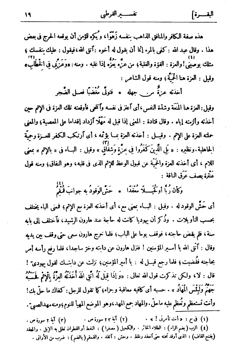 وَقِيلَ: الْعِزَّةُ هُنَا الْمَنَعَةُ وَشِدَّةُ النَّفْسِ، أَيِ اعْتَزَّ فِي نَفْسِهِ وَانْتَحَى فَأَوْقَعَتْهُ تِلْكَ الْعِزَّةُ فِي الْإِثْمِ حِينَ أَخَذَتْهُ وَأَلْزَمَتْهُ إِيَّاهُ. وَقَالَ قَتَادَةُ: الْمَعْنَى إِذَا قِيلَ لَهُ مَهْلًا ازْدَادَ إِقْدَامًا عَلَى الْمَعْصِيَةِ، وَالْمَعْنَى حَمَلَتْهُ الْعِزَّةُ عَلَى الْإِثْمِ. وَقِيلَ: أَخَذَتْهُ الْعِزَّةُ بِمَا يُؤْثِمُهُ، أَيِ ارْتَكَبَ الْكُفْرَ لِلْعِزَّةِ وَحَمِيَّةِ الْجَاهِلِيَّةِ. وَنَظِيرُهُ:" بَلِ الَّذِينَ كَفَرُوا فِي عِزَّةٍ وَشِقاقٍ «٣» " وَقِيلَ: الْبَاءُ فِي" بِالْإِثْمِ" بِمَعْنَى اللَّامِ، أَيْ أَخَذَتْهُ الْعِزَّةُ وَالْحَمِيَّةُ عَنْ قَبُولِ الْوَعْظِ لِلْإِثْمِ الَّذِي فِي قَلْبِهِ، وَهُوَ النِّفَاقُ، وَمِنْهُ قَوْلُ عَنْتَرَةَ يَصِفُ عَرَقَ النَّاقَةِ: