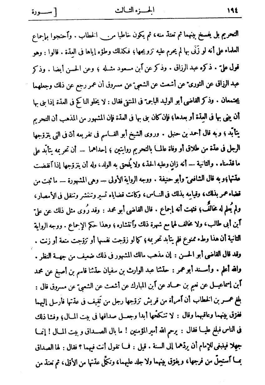 التَّحْرِيمُ بَلْ يُفْسَخُ بَيْنَهُمَا ثُمَّ تَعْتَدُّ مِنْهُ، ثُمَّ يَكُونُ خَاطِبًا مِنَ الْخُطَّابِ. وَاحْتَجُّوا بِإِجْمَاعِ الْعُلَمَاءِ عَلَى أَنَّهُ لَوْ زَنَى بِهَا لَمْ يَحْرُمْ عَلَيْهِ تَزْوِيجُهَا، فَكَذَلِكَ وَطْؤُهُ إِيَّاهَا فِي الْعِدَّةِ. قَالُوا: وَهُوَ قَوْلُ عَلِيٍّ. ذَكَرَهُ عَبْدُ الرَّزَّاقِ. وَذُكِرَ عَنِ ابْنِ مَسْعُودٍ مِثْلُهُ، وَعَنِ الْحَسَنِ أَيْضًا. وَذَكَرَ عَبْدُ الرَّزَّاقِ عَنِ الثَّوْرِيِّ عَنْ أَشْعَثَ عَنِ الشَّعْبِيِّ عَنْ مَسْرُوقٍ أَنَّ عُمَرَ رَجَعَ عَنْ ذَلِكَ وَجَعَلَهُمَا يَجْتَمِعَانِ. وَذَكَرَ الْقَاضِي أَبُو الْوَلِيدِ الْبَاجِيُّ فِي الْمُنْتَقَى فَقَالَ: لَا يَخْلُو النَّاكِحُ فِي الْعِدَّةِ إِذَا بَنَى بِهَا أَنْ يَبْنِيَ بِهَا فِي الْعِدَّةِ أَوْ بَعْدَهَا، فَإِنْ كَانَ بَنَى بِهَا فِي الْعِدَّةِ فَإِنَّ الْمَشْهُورَ مِنَ الْمَذْهَبِ أَنَّ التَّحْرِيمَ يَتَأَبَّدُ، وَبِهِ قَالَ أَحْمَدُ بْنُ حَنْبَلٍ. وَرَوَى الشَّيْخُ أَبُو الْقَاسِمِ فِي تَفْرِيعِهِ أَنَّ فِي الَّتِي يَتَزَوَّجُهَا الرَّجُلُ فِي عِدَّةٍ مِنْ طَلَاقٍ أَوْ وَفَاةٍ عَالِمًا بِالتَّحْرِيمِ رِوَايَتَيْنِ، إِحْدَاهُمَا- أَنَّ تَحْرِيمَهُ يَتَأَبَّدُ عَلَى مَا قَدَّمْنَاهُ. وَالثَّانِيَةُ- أَنَّهُ زَانٍ وَعَلَيْهِ الْحَدُّ، وَلَا يُلْحَقُ بِهِ الْوَلَدُ، وَلَهُ أَنْ يَتَزَوَّجَهَا إِذَا انْقَضَتْ عِدَّتُهَا، وَبِهِ قَالَ الشَّافِعِيُّ وَأَبُو حَنِيفَةَ. وَوَجْهُ الرِّوَايَةِ الْأُولَى- وَهِيَ المشهور- مَا ثَبَتَ مِنْ قَضَاءِ عُمَرَ بِذَلِكَ، وَقِيَامِهِ بِذَلِكَ فِي النَّاسِ، وَكَانَتْ قَضَايَاهُ تَسِيرُ وَتَنْتَشِرُ وَتُنْقَلُ فِي الْأَمْصَارِ، وَلَمْ يُعْلَمْ لَهُ مُخَالِفٌ، فَثَبَتَ أَنَّهُ إِجْمَاعٌ. قَالَ الْقَاضِي أَبُو مُحَمَّدٍ: وَقَدْ رُوِيَ مِثْلُ ذَلِكَ عَنْ عَلِيِّ بْنِ أَبِي طَالِبٍ، وَلَا مُخَالِفَ لَهُمَا مَعَ شُهْرَةِ ذَلِكَ وَانْتِشَارِهِ، وَهَذَا حُكْمُ الْإِجْمَاعِ. وَوَجْهُ الرِّوَايَةِ الثانية أن هذا وطئ مَمْنُوعٌ فَلَمْ يَتَأَبَّدْ تَحْرِيمُهُ، كَمَا لَوْ زَوَّجَتْ نَفْسَهَا أَوْ تَزَوَّجَتْ مُتْعَةً أَوْ زَنَتْ. وَقَدْ قَالَ الْقَاضِي أَبُو الْحَسَنِ: إِنَّ مَذْهَبَ مَالِكٍ الْمَشْهُورُ فِي ذَلِكَ ضَعِيفٌ مِنْ جِهَةِ النَّظَرِ. وَاللَّهُ أَعْلَمُ. وَأَسْنَدَ أَبُو عُمَرَ: حَدَّثَنَا عَبْدُ الْوَارِثِ بْنُ سُفْيَانَ حَدَّثَنَا قَاسِمُ بْنُ أَصْبَغَ عَنْ مُحَمَّدِ بْنِ إِسْمَاعِيلَ عَنْ نُعَيْمِ بْنِ حَمَّادٍ عَنِ ابْنِ الْمُبَارَكِ عَنْ أَشْعَثَ عَنِ الشَّعْبِيِّ عَنْ مَسْرُوقٍ قَالَ: بَلَغَ عُمَرَ بْنَ الْخَطَّابِ أَنَّ امْرَأَةً مِنْ قُرَيْشٍ تَزَوَّجَهَا رَجُلٌ مِنْ ثَقِيفٍ فِي عِدَّتِهَا فَأَرْسَلَ إِلَيْهِمَا فَفَرَّقَ بَيْنَهُمَا وَعَاقَبَهُمَا وَقَالَ: لَا تَنْكِحُهَا أَبَدًا وَجَعَلَ صَدَاقَهَا فِي بَيْتِ الْمَالِ، وَفَشَا ذَلِكَ فِي النَّاسِ فَبَلَغَ عَلِيًّا فَقَالَ: يَرْحَمُ اللَّهُ أَمِيرَ المؤمنين، ما بال الصداق وبئت الْمَالِ! إِنَّمَا جَهِلَا فَيَنْبَغِي لِلْإِمَامِ أَنْ يَرُدَّهُمَا إِلَى السُّنَّةِ. قِيلَ: فَمَا تَقُولُ أَنْتَ فِيهِمَا؟ فَقَالَ: لَهَا الصَّدَاقُ بِمَا اسْتَحَلَّ مِنْ فَرْجِهَا، وَيُفَرَّقُ بَيْنَهُمَا وَلَا جَلْدَ عَلَيْهِمَا، وَتُكْمِلُ عِدَّتَهَا مِنَ الْأَوَّلِ، ثُمَّ تَعْتَدُّ مِنَ