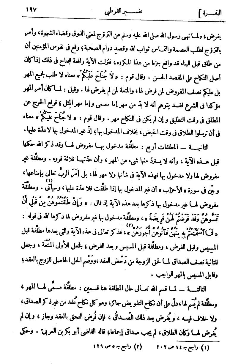 ، فَذَكَرَ تَعَالَى هَذِهِ الْآيَةَ وَالَّتِي بَعْدَهَا مُطَلَّقَةً قَبْلَ الْمَسِيسِ وَقَبْلَ الْفَرْضِ، وَمُطَلَّقَةً قَبْلَ الْمَسِيسِ وَبَعْدَ الْفَرْضِ، فَجَعَلَ لِلْأُولَى الْمُتْعَةَ، وَجَعَلَ لِلثَّانِيَةِ نِصْفَ الصَّدَاقِ لِمَا لِحَقِّ الزَّوْجَةِ مِنْ دَحْضِ الْعَقْدِ، وَوَصْمِ الْحِلِّ الْحَاصِلِ لِلزَّوْجِ بِالْعَقْدِ، وَقَابَلَ الْمَسِيسَ بِالْمَهْرِ الْوَاجِبِ. الثَّالِثَةُ- لَمَّا قَسَّمَ اللَّهُ تَعَالَى حَالَ الْمُطَلَّقَةِ هُنَا قِسْمَيْنِ: مُطَلَّقَةٌ مُسَمًّى لَهَا الْمَهْرُ، وَمُطَلَّقَةٌ لَمْ يُسَمَّ لَهَا، دَلَّ عَلَى أَنَّ نِكَاحَ التَّفْوِيضِ جَائِزٌ، وَهُوَ كُلُّ نِكَاحٍ عُقِدَ مِنْ غَيْرِ ذِكْرِ الصَّدَاقِ، وَلَا خِلَافَ فِيهِ، وَيُفْرَضُ بَعْدَ ذَلِكَ الصَّدَاقُ، فَإِنْ فُرِضَ الْتَحَقَ بِالْعَقْدِ وَجَازَ، وَإِنْ لَمْ يُفْرَضْ لَهَا وَكَانَ الطَّلَاقُ لَمْ يَجِبْ صَدَاقٌ إِجْمَاعًا، قَالَهُ الْقَاضِي أَبُو بَكْرِ بْنُ الْعَرَبِيِّ. وَحَكَى