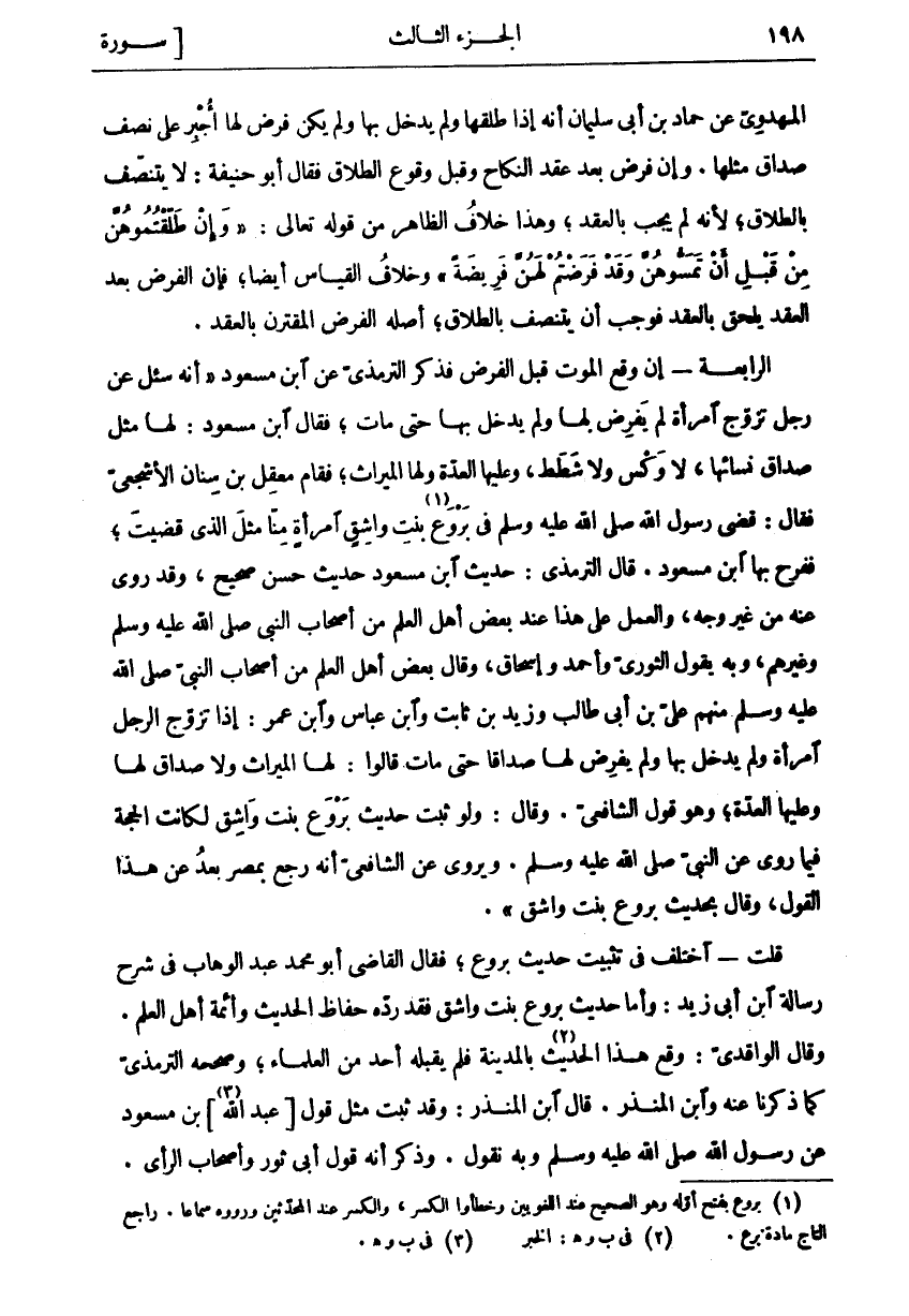 الْمَهْدَوِيُّ عَنْ حَمَّادِ بْنِ أَبِي سُلَيْمَانَ أَنَّهُ إِذَا طَلَّقَهَا وَلَمْ يَدْخُلْ بِهَا وَلَمْ يَكُنْ فَرَضَ لَهَا أُجْبِرَ عَلَى نِصْفِ صَدَاقِ مِثْلِهَا. وَإِنْ فَرَضَ بَعْدَ عَقْدِ النِّكَاحِ وَقَبْلَ وُقُوعِ الطَّلَاقِ فَقَالَ أَبُو حَنِيفَةَ: لَا يَتَنَصَّفُ بِالطَّلَاقِ، لِأَنَّهُ لَمْ يَجِبْ بِالْعَقْدِ، وَهَذَا خِلَافُ الظَّاهِرِ مِنْ قَوْلِهِ تَعَالَى:" وَإِنْ طَلَّقْتُمُوهُنَّ مِنْ قَبْلِ أَنْ تَمَسُّوهُنَّ وَقَدْ فَرَضْتُمْ لَهُنَّ فَرِيضَةً" وَخِلَافُ الْقِيَاسِ أَيْضًا، فَإِنَّ الْفَرْضَ بَعْدَ الْعَقْدِ يَلْحَقُ بِالْعَقْدِ فَوَجَبَ أَنْ يَتَنَصَّفَ بِالطَّلَاقِ، أَصْلُهُ الْفَرْضُ الْمُقْتَرِنُ بِالْعَقْدِ. الرَّابِعَةُ- إِنْ وَقَعَ الْمَوْتُ قَبْلَ الْفَرْضِ فَذَكَرَ التِّرْمِذِيُّ عَنِ ابْنِ مَسْعُودٍ" أَنَّهُ سُئِلَ عَنْ رَجُلٍ تَزَوَّجَ امْرَأَةً لَمْ يَفْرِضْ لَهَا وَلَمْ يَدْخُلْ بِهَا حَتَّى مَاتَ، فَقَالَ ابْنُ مَسْعُودٍ: لَهَا مِثْلُ صَدَاقِ نِسَائِهَا، لَا وَكْسَ وَلَا شَطَطَ، وَعَلَيْهَا الْعِدَّةُ وَلَهَا الْمِيرَاثُ، فَقَامَ مَعْقِلُ بْنُ سِنَانٍ الْأَشْجَعِيُّ فَقَالَ: قَضَى رَسُولُ اللَّهِ صَلَّى اللَّهُ عَلَيْهِ وَسَلَّمَ في بِرْوَعَ بِنْتِ «١» وَاشِقٍ امْرَأَةٍ مِنَّا مِثْلَ الَّذِي قَضَيْتَ، فَفَرِحَ بِهَا ابْنُ مَسْعُودٍ. قَالَ التِّرْمِذِيُّ: حَدِيثُ ابْنِ مَسْعُودٍ حَدِيثٌ حَسَنٌ صَحِيحٌ، وَقَدْ رُوِيَ عَنْهُ مِنْ غَيْرِ وَجْهٍ، وَالْعَمَلُ عَلَى هَذَا عِنْدَ بَعْضِ أَهْلِ الْعِلْمِ مِنْ أَصْحَابِ النَّبِيِّ صَلَّى اللَّهُ عَلَيْهِ وَسَلَّمَ وَغَيْرِهِمْ، وَبِهِ يَقُولُ الثَّوْرِيُّ وَأَحْمَدُ وَإِسْحَاقُ، وَقَالَ بَعْضُ أَهْلِ الْعِلْمِ مِنْ أَصْحَابِ النَّبِيِّ صَلَّى اللَّهُ عَلَيْهِ وَسَلَّمَ مِنْهُمْ عَلِيُّ بْنُ أَبِي طَالِبٍ وَزَيْدُ بْنُ ثَابِتٍ وَابْنُ عَبَّاسٍ وَابْنُ عُمَرَ: إِذَا تَزَوَّجَ الرَّجُلُ امْرَأَةً وَلَمْ يَدْخُلْ بِهَا وَلَمْ يَفْرِضْ لَهَا صَدَاقًا حَتَّى مَاتَ قَالُوا: لَهَا الْمِيرَاثُ وَلَا صَدَاقَ لَهَا وَعَلَيْهَا الْعِدَّةُ، وَهُوَ قَوْلُ الشَّافِعِيِّ. وَقَالَ: وَلَوْ ثَبَتَ حَدِيثُ بِرْوَعَ بِنْتِ وَاشِقٍ لَكَانَتِ الْحُجَّةُ فِيمَا رُوِيَ عَنِ النَّبِيِّ صَلَّى اللَّهُ عَلَيْهِ وَسَلَّمَ. وَيُرْوَى عَنِ الشَّافِعِيِّ أَنَّهُ رَجَعَ بِمِصْرَ بَعْدُ عَنْ هَذَا الْقَوْلِ، وَقَالَ بِحَدِيثِ بِرْوَعَ بِنْتِ وَاشِقٍ". قُلْتُ- اخْتُلِفَ فِي تَثْبِيتِ حَدِيثِ بِرْوَعَ، فَقَالَ الْقَاضِي أَبُو مُحَمَّدٍ عَبْدُ الْوَهَّابِ فِي شَرْحِ رِسَالَةِ ابْنِ أَبِي زَيْدٍ: وَأَمَّا حَدِيثُ بِرْوَعَ بِنْتِ وأشق لقد رَدَّهُ حُفَّاظُ الْحَدِيثِ وَأَئِمَّةُ أَهْلِ الْعِلْمِ. وَقَالَ الْوَاقِدِيُّ: وَقَعَ هَذَا الْحَدِيثُ «٢» بِالْمَدِينَةِ فَلَمْ يَقْبَلْهُ أَحَدٌ مِنَ الْعُلَمَاءِ، وَصَحَّحَهُ التِّرْمِذِيُّ كَمَا ذَكَرْنَا عَنْهُ وَابْنُ الْمُنْذِرِ. قَالَ ابْنُ الْمُنْذِرِ: وَقَدْ ثَبَتَ مِثْلُ قَوْلِ [عَبْدِ اللَّهِ «٣»] بْنِ مَسْعُودٍ عَنْ رَسُولِ اللَّهِ صَلَّى اللَّهُ عَلَيْهِ وَسَلَّمَ وَبِهِ نَقُولُ. وَذُكِرَ أَنَّهُ قَوْلُ أَبِي ثَوْرٍ وأصحاب الرأى.