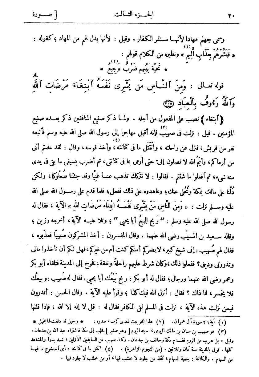 ابْتِغاءَ نُصِبَ عَلَى الْمَفْعُولِ مِنْ أَجْلِهِ. وَلَمَّا ذَكَرَ صَنِيعَ الْمُنَافِقِينَ ذَكَرَ بَعْدَهُ صَنِيعَ الْمُؤْمِنِينَ. قِيلَ: نَزَلَتْ فِي صُهَيْبٍ «٣» فَإِنَّهُ أَقْبَلَ مُهَاجِرًا إِلَى رَسُولِ اللَّهِ صَلَّى اللَّهُ عَلَيْهِ وَسَلَّمَ فَاتَّبَعَهُ نَفَرٌ مِنْ قُرَيْشٍ، فَنَزَلَ عَنْ رَاحِلَتِهِ، وَانْتَثَلَ مَا فِي كِنَانَتِهِ «٤»، وَأَخَذَ قَوْسَهُ، وَقَالَ: لَقَدْ عَلِمْتُمْ أَنِّي مِنْ أَرْمَاكُمْ، وَايْمُ اللَّهِ لَا تَصِلُونَ إِلَيَّ حَتَّى أَرْمِيَ بِمَا فِي كِنَانَتِي، ثُمَّ أَضْرِبُ بِسَيْفِي مَا بَقِيَ في يدي منه شي، ثُمَّ افْعَلُوا مَا شِئْتُمْ. فَقَالُوا: لَا نَتْرُكُكَ تَذْهَبُ عَنَّا غَنِيًّا وَقَدْ جِئْتَنَا صُعْلُوكًا، وَلَكِنْ دُلَّنَا عَلَى مَالِكَ بِمَكَّةَ وَنُخَلِّي عَنْكَ، وَعَاهَدُوهُ عَلَى ذَلِكَ فَفَعَلَ، فَلَمَّا قَدِمَ عَلَى رَسُولِ اللَّهِ صَلَّى اللَّهُ عَلَيْهِ وَسَلَّمَ نَزَلَتْ:" وَمِنَ النَّاسِ مَنْ يَشْرِي نَفْسَهُ ابْتِغاءَ مَرْضاتِ اللَّهِ" الْآيَةَ، فَقَالَ لَهُ رَسُولُ اللَّهِ صَلَّى اللَّهُ عَلَيْهِ وَسَلَّمَ:" رَبِحَ الْبَيْعُ أَبَا يَحْيَى"، وَتَلَا عَلَيْهِ الْآيَةَ، أَخْرَجَهُ رَزِينٌ، وَقَالَهُ سَعِيدُ بْنُ الْمُسَيَّبِ رَضِيَ اللَّهُ عَنْهُمَا. وَقَالَ الْمُفَسِّرُونَ: أَخَذَ الْمُشْرِكُونَ صُهَيْبًا فَعَذَّبُوهُ، فَقَالَ لَهُمْ صُهَيْبٌ: إِنِّي شَيْخٌ كَبِيرٌ لَا يَضُرُّكُمْ أَمِنْكُمْ كُنْتُ أَمْ مِنْ غَيْرِكُمْ، فَهَلْ لَكُمْ أَنْ تَأْخُذُوا مَالِي وَتَذَرُونِي وَدِينِي؟ فَفَعَلُوا ذَلِكَ، وَكَانَ شَرَطَ عَلَيْهِمْ رَاحِلَةً وَنَفَقَةً، فَخَرَجَ إِلَى الْمَدِينَةِ فَتَلَقَّاهُ أَبُو بَكْرٍ وَعُمَرُ رَضِيَ اللَّهُ عَنْهُمَا وَرِجَالٌ، فَقَالَ لَهُ أَبُو بَكْرٍ: رَبِحَ بَيْعُكَ أَبَا يَحْيَى. فَقَالَ لَهُ صُهَيْبٌ: وَبَيْعُكَ فَلَا يَخْسَرُ، فَمَا ذَاكَ؟ فَقَالَ: أَنْزَلَ اللَّهُ فِيكَ كَذَا، وَقَرَأَ عَلَيْهِ الْآيَةَ. وَقَالَ الْحَسَنُ: أَتَدْرُونَ فِيمَنْ نَزَلَتْ هَذِهِ الْآيَةُ، نَزَلَتْ فِي الْمُسْلِمِ لَقِيَ الْكَافِرَ فَقَالَ لَهُ: قُلْ لَا إِلَهَ إِلَّا اللَّهُ، فإذا قلتها
