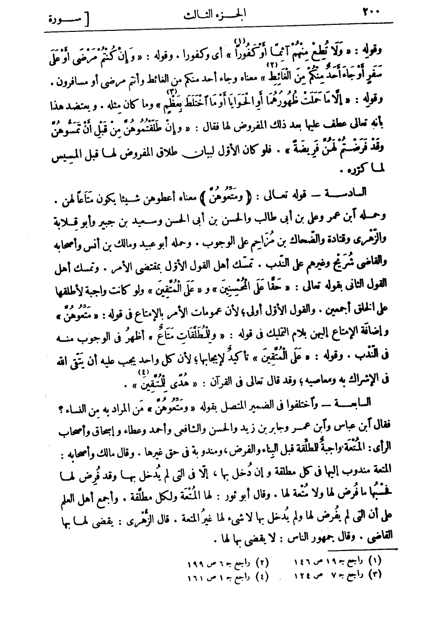 وَقَوْلِهِ:" وَلا تُطِعْ مِنْهُمْ آثِماً أَوْ كَفُوراً «١» " أَيْ وَكَفُورًا. وَقَوْلِهِ:" وَإِنْ كُنْتُمْ مَرْضى أَوْ عَلى سَفَرٍ أَوْ جاءَ أَحَدٌ مِنْكُمْ مِنَ الْغائِطِ «٢» " مَعْنَاهُ وَجَاءَ أَحَدٌ مِنْكُمْ مِنَ الْغَائِطِ وَأَنْتُمْ مَرْضَى أَوْ مُسَافِرُونَ. وَقَوْلِهِ:" إِلَّا مَا حَمَلَتْ ظُهُورُهُما أَوِ الْحَوايا أَوْ مَا اخْتَلَطَ بِعَظْمٍ «٣» " وَمَا كَانَ مِثْلَهُ. وَيَعْتَضِدُ هَذَا بِأَنَّهُ تَعَالَى عَطَفَ عَلَيْهَا بَعْدَ ذَلِكَ الْمَفْرُوضَ لَهَا فَقَالَ:" وَإِنْ طَلَّقْتُمُوهُنَّ مِنْ قَبْلِ أَنْ تَمَسُّوهُنَّ وَقَدْ فَرَضْتُمْ لَهُنَّ فَرِيضَةً". فَلَوْ كَانَ الْأَوَّلُ لِبَيَانِ طَلَاقِ الْمَفْرُوضِ لَهَا قَبْلَ الْمَسِيسِ لَمَا كَرَّرَهُ. السَّادِسَةُ- قَوْلُهُ تَعَالَى: (وَمَتِّعُوهُنَّ) مَعْنَاهُ أَعْطُوهُنَّ شيئا يكون متاعا لهن. وحمله ابن عمر وَعَلِيُّ بْنُ أَبِي طَالِبٍ وَالْحَسَنُ بْنُ أَبِي الْحَسَنِ وَسَعِيدُ بْنُ جُبَيْرٍ وَأَبُو قِلَابَةَ وَالزُّهْرِيُّ وَقَتَادَةُ وَالضَّحَّاكُ بْنُ مُزَاحِمٍ عَلَى الْوُجُوبِ. وَحَمَلَهُ أَبُو عُبَيْدٍ وَمَالِكُ بْنُ أَنَسٍ وَأَصْحَابُهُ وَالْقَاضِي شُرَيْحٌ وَغَيْرُهُمْ عَلَى النَّدْبِ. تَمَسَّكَ أَهْلُ الْقَوْلِ الْأَوَّلِ بِمُقْتَضَى الْأَمْرِ. وَتَمَسَّكَ أَهْلُ الْقَوْلِ الثَّانِي بِقَوْلِهِ تَعَالَى:" حَقًّا عَلَى الْمُحْسِنِينَ" وَ" عَلَى الْمُتَّقِينَ" وَلَوْ كَانَتْ وَاجِبَةً لَأَطْلَقَهَا عَلَى الْخَلْقِ أَجْمَعِينَ. وَالْقَوْلُ الْأَوَّلُ أَوْلَى، لِأَنَّ عُمُومَاتِ الْأَمْرِ بالامتاع في قوله:" مَتِّعُوهُنَّ" وَإِضَافَةُ الْإِمْتَاعِ إِلَيْهِنَّ بِلَامِ التَّمْلِيكِ فِي قَوْلِهِ:" وَلِلْمُطَلَّقاتِ مَتاعٌ" أَظْهَرُ فِي الْوُجُوبِ مِنْهُ فِي النَّدْبِ. وَقَوْلُهُ:" عَلَى الْمُتَّقِينَ" تَأْكِيدٌ لِإِيجَابِهَا، لِأَنَّ كُلَّ وَاحِدٍ يَجِبُ عَلَيْهِ أَنْ يَتَّقِيَ اللَّهَ فِي الْإِشْرَاكِ بِهِ وَمَعَاصِيهِ، وَقَدْ قَالَ تَعَالَى فِي الْقُرْآنِ:" هُدىً لِلْمُتَّقِينَ «٤» ". السَّابِعَةُ- وَاخْتَلَفُوا فِي الضَّمِيرِ الْمُتَّصِلِ بِقَوْلِهِ" وَمَتِّعُوهُنَّ" مَنِ الْمُرَادُ بِهِ مِنَ النِّسَاءِ؟ فَقَالَ ابْنُ عَبَّاسٍ وَابْنُ عُمَرَ وَجَابِرُ بْنُ زَيْدٍ وَالْحَسَنُ وَالشَّافِعِيُّ وَأَحْمَدُ وَعَطَاءٌ وَإِسْحَاقُ وَأَصْحَابُ الرَّأْيِ: الْمُتْعَةُ وَاجِبَةٌ لِلْمُطَلَّقَةِ قَبْلَ الْبِنَاءِ وَالْفَرْضِ، وَمَنْدُوبَةٌ فِي حَقِّ غَيْرِهَا. وَقَالَ مَالِكٌ وَأَصْحَابُهُ: الْمُتْعَةُ مَنْدُوبٌ إِلَيْهَا فِي كُلِّ مُطَلَّقَةٍ وَإِنْ دُخِلَ بِهَا، إِلَّا فِي الَّتِي لَمْ يُدْخَلْ بِهَا وَقَدْ فُرِضَ لَهَا فَحَسْبُهَا ما فرض لها ولا متعة لها. قال أَبُو ثَوْرٍ: لَهَا الْمُتْعَةُ وَلِكُلِّ مُطَلَّقَةٍ. وَأَجْمَعَ أَهْلُ الْعِلْمِ عَلَى أَنَّ الَّتِي لَمْ يُفْرَضْ لها ولم يدخل بها لا شي لَهَا غَيْرَ الْمُتْعَةِ. قَالَ الزُّهْرِيُّ: يَقْضِي لَهَا بِهَا الْقَاضِي. وَقَالَ جُمْهُورُ النَّاسِ: لَا يَقْضِي بها لها.