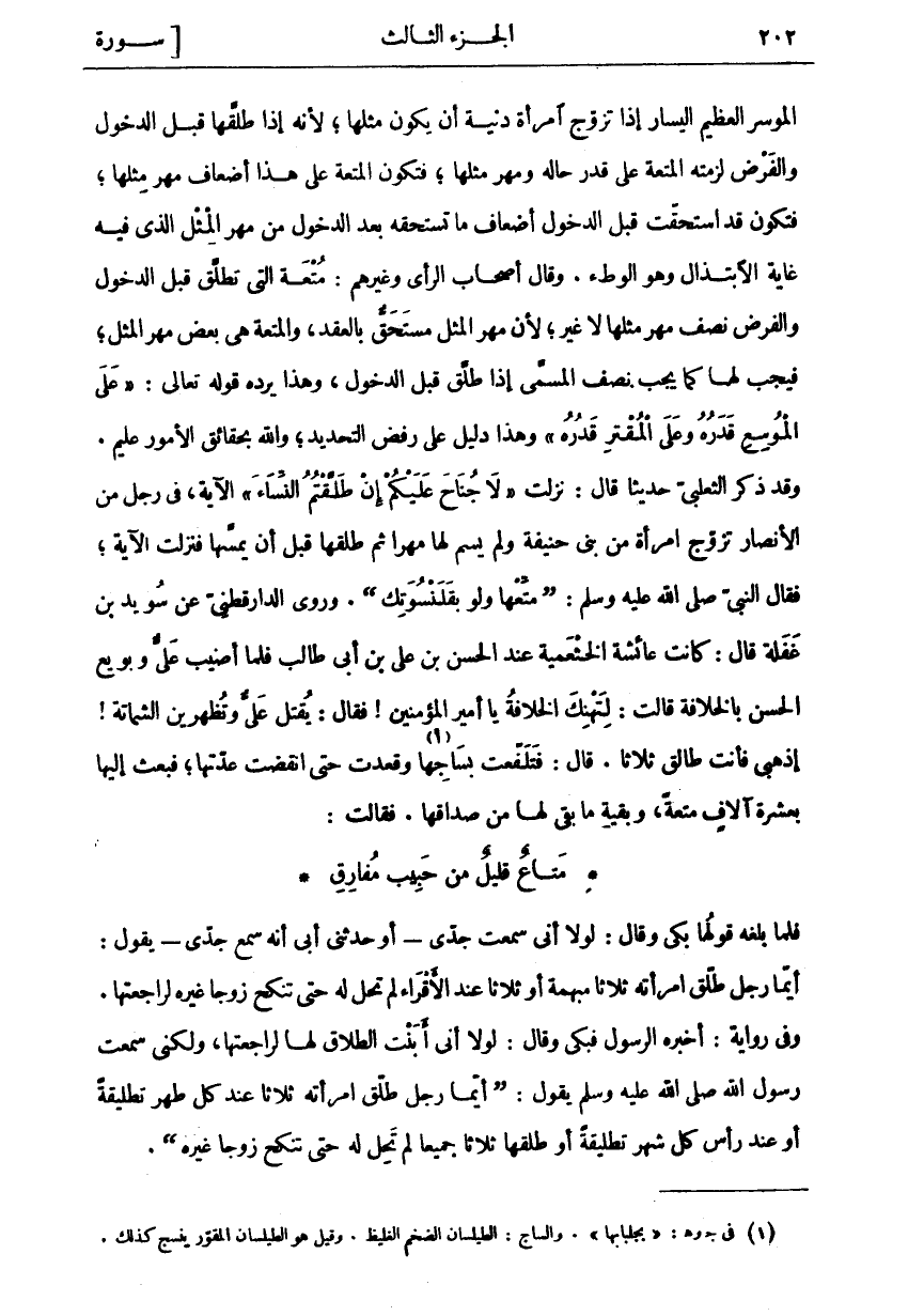 الْمُوسِرَ الْعَظِيمَ الْيَسَارِ إِذَا تَزَوَّجَ امْرَأَةً دَنِيَّةً أَنْ يَكُونَ مِثْلَهَا، لِأَنَّهُ إِذَا طَلَّقَهَا قَبْلَ الدُّخُولِ وَالْفَرْضِ لَزِمَتْهُ الْمُتْعَةُ عَلَى قَدْرِ حَالِهِ وَمَهْرِ مِثْلِهَا، فَتَكُونُ الْمُتْعَةُ عَلَى هَذَا أَضْعَافُ مَهْرِ مِثْلِهَا، فَتَكُونُ قَدِ اسْتَحَقَّتْ قَبْلَ الدُّخُولِ أَضْعَافَ مَا تَسْتَحِقُّهُ بَعْدَ الدُّخُولِ مِنْ مَهْرِ المثل الذي فيه غاية الابتذال وهو الوطي. وَقَالَ أَصْحَابُ الرَّأْيِ وَغَيْرُهُمْ: مُتْعَةُ الَّتِي تُطَلَّقُ قَبْلَ الدُّخُولِ وَالْفَرْضِ نِصْفُ مَهْرِ مِثْلِهَا لَا غَيْرَ، لِأَنَّ مَهْرَ الْمِثْلِ مُسْتَحَقٌّ بِالْعَقْدِ، وَالْمُتْعَةُ هِيَ بَعْضُ مَهْرِ الْمِثْلِ، فَيَجِبُ لَهَا كَمَا يَجِبُ نِصْفُ الْمُسَمَّى إِذَا طَلَّقَ قَبْلَ الدُّخُولِ، وَهَذَا يَرُدُّهُ قَوْلُهُ تَعَالَى:" عَلَى الْمُوسِعِ قَدَرُهُ وَعَلَى الْمُقْتِرِ قَدَرُهُ" وَهَذَا دَلِيلٌ عَلَى رَفْضِ التَّحْدِيدِ، وَاللَّهُ بِحَقَائِقِ الْأُمُورِ عَلِيمٌ. وَقَدْ ذَكَرَ الثَّعْلَبِيُّ حَدِيثًا قَالَ: نَزَلَتْ" لَا جُناحَ عَلَيْكُمْ إِنْ طَلَّقْتُمُ النِّساءَ" الْآيَةَ، فِي رَجُلٍ مِنَ الْأَنْصَارِ تَزَوَّجَ امْرَأَةً مِنْ بَنِي حَنِيفَةَ وَلَمْ يُسَمِّ لَهَا مَهْرًا ثُمَّ طَلَّقَهَا قَبْلَ أَنْ يَمَسَّهَا فَنَزَلَتِ الْآيَةُ، فَقَالَ النَّبِيُّ صَلَّى اللَّهُ عَلَيْهِ وَسَلَّمَ:" مَتِّعْهَا وَلَوْ بِقَلَنْسُوَتِكَ". وَرَوَى الدَّارَقُطْنِيُّ عَنْ سُوِيدِ بْنِ غَفَلَةَ قَالَ: كَانَتْ عَائِشَةُ الْخَثْعَمِيَّةُ عِنْدَ الْحَسَنِ بْنِ عَلِيِّ بْنِ أَبِي طَالِبٍ فَلَمَّا أُصِيبَ عَلِيٌّ وَبُويِعَ الْحَسَنُ بِالْخِلَافَةِ قَالَتْ: لِتَهْنِكَ الْخِلَافَةُ يَا أَمِيرَ الْمُؤْمِنِينَ، فَقَالَ: يُقْتَلُ عَلِيٌّ وَتُظْهِرِينَ الشَّمَاتَةَ! اذْهَبِي فَأَنْتِ طَالِقٌ ثَلَاثًا. قَالَ: فَتَلَفَّعَتْ بِسَاجِهَا «١» وَقَعَدَتْ حَتَّى انْقَضَتْ عِدَّتُهَا، فَبَعَثَ إِلَيْهَا بِعَشَرَةِ آلَافٍ مُتْعَةً، وَبَقِيَّةِ مَا بَقِيَ لَهَا مِنْ صَدَاقِهَا. فَقَالَتْ: