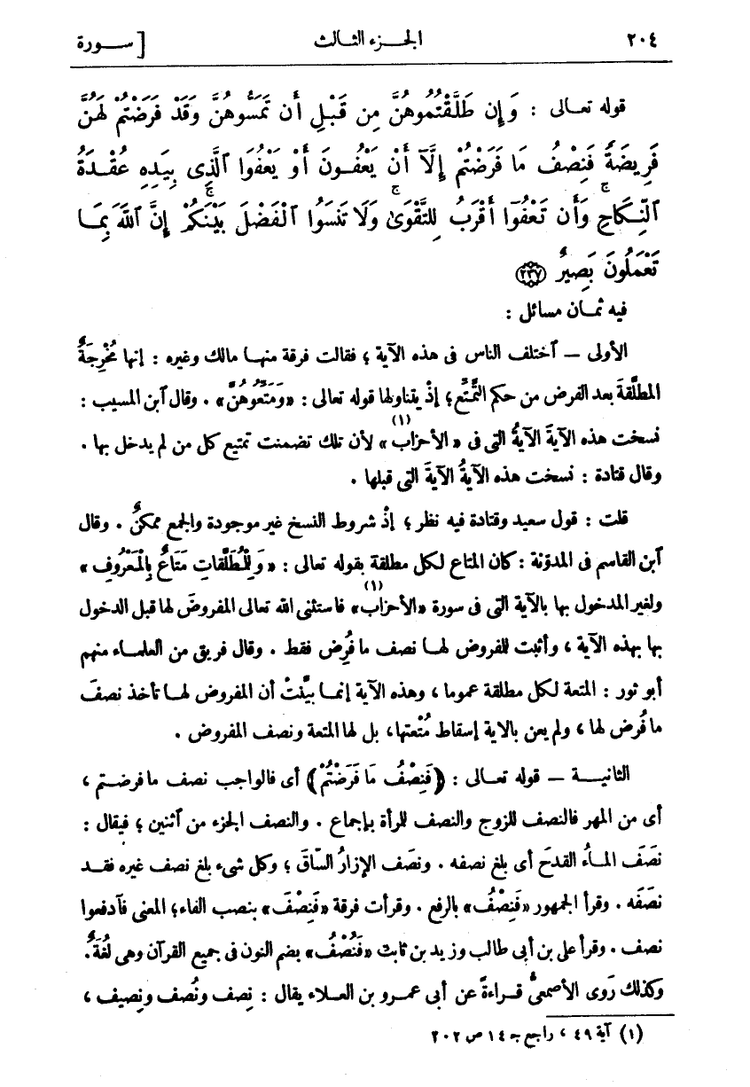 فِيهِ ثَمَانِ مَسَائِلَ: الْأُولَى اخْتَلَفَ النَّاسُ فِي هَذِهِ الْآيَةِ، فَقَالَتْ فِرْقَةٌ مِنْهَا مَالِكٌ وَغَيْرُهُ: إِنَّهَا مُخْرِجَةُ الْمُطَلَّقَةِ بَعْدَ الْفَرْضِ مِنْ حُكْمِ التَّمَتُّعِ، إِذْ يَتَنَاوَلُهَا قَوْلُهُ تَعَالَى:" وَمَتِّعُوهُنَّ". وَقَالَ ابْنُ الْمُسَيَّبِ: نَسَخَتْ هَذِهِ الْآيَةُ الْآيَةَ الَّتِي فِي" الْأَحْزَابِ «١» " لِأَنَّ تِلْكَ تَضَمَّنَتْ تَمْتِيعَ كُلِّ مَنْ لَمْ يُدْخَلْ بِهَا. وَقَالَ قَتَادَةُ: نَسَخَتْ هَذِهِ الْآيَةُ الْآيَةَ الَّتِي قبلها. قلت: قول سعد وَقَتَادَةَ فِيهِ نَظَرٌ، إِذْ شُرُوطُ النَّسْخِ غَيْرُ مَوْجُودَةٍ وَالْجَمْعُ مُمْكِنٌ. وَقَالَ ابْنُ الْقَاسِمِ فِي الْمُدَوَّنَةِ: كَانَ الْمَتَاعُ لِكُلِّ مُطَلَّقَةٍ بِقَوْلِهِ تَعَالَى:" وَلِلْمُطَلَّقاتِ مَتاعٌ بِالْمَعْرُوفِ" وَلِغَيْرِ الْمَدْخُولِ بِهَا بِالْآيَةِ الَّتِي فِي سُورَةِ" الْأَحْزَابِ «٢» " فَاسْتَثْنَى اللَّهُ تَعَالَى الْمَفْرُوضَ لَهَا قَبْلَ الدُّخُولِ بِهَا بِهَذِهِ الْآيَةِ، وَأَثْبَتَ لِلْمَفْرُوضِ لَهَا نِصْفَ مَا فَرَضَ فَقَطْ. وَقَالَ فَرِيقٌ مِنَ الْعُلَمَاءِ مِنْهُمْ أَبُو ثَوْرٍ: الْمُتْعَةُ لِكُلِّ مُطَلَّقَةٍ عُمُومًا، وَهَذِهِ الْآيَةُ إِنَّمَا بَيَّنَتْ أَنَّ الْمَفْرُوضَ لَهَا تَأْخُذُ نِصْفَ مَا فُرِضَ لَهَا، وَلَمْ يَعْنِ بِالْآيَةِ إِسْقَاطَ مُتْعَتِهَا، بَلْ لَهَا الْمُتْعَةُ وَنِصْفُ الْمَفْرُوضِ. الثَّانِيَةُ- قَوْلُهُ تَعَالَى: (فَنِصْفُ مَا فَرَضْتُمْ) أَيْ فَالْوَاجِبُ نِصْفُ مَا فَرَضْتُمْ، أَيْ مِنَ الْمَهْرِ فَالنِّصْفُ لِلزَّوْجِ وَالنِّصْفُ لِلْمَرْأَةِ بِإِجْمَاعٍ. وَالنِّصْفُ الْجُزْءُ مِنَ اثْنَيْنِ، فَيُقَالُ: نَصَفَ الْمَاءُ الْقَدَحَ أَيْ بَلَغَ نِصْفَهُ. ونصف الإزار الساق، وكل شي بَلَغَ نِصْفَ غَيْرِهِ فَقَدْ نَصَفَهُ. وَقَرَأَ الْجُمْهُورُ" فَنِصْفُ" بِالرَّفْعِ. وَقَرَأَتْ فِرْقَةٌ" فَنِصْفَ" بِنَصْبِ الْفَاءِ، الْمَعْنَى فَادْفَعُوا نِصْفَ. وَقَرَأَ عَلِيُّ بْنُ أَبِي طَالِبٍ وَزَيْدُ بْنُ ثَابِتٍ" فَنِصْفُ" بِضَمِّ النُّونِ فِي جَمِيعِ الْقُرْآنِ وَهِيَ لُغَةٌ. وَكَذَلِكَ رَوَى الْأَصْمَعِيُّ قِرَاءَةً عَنْ أَبِي عَمْرِو بْنِ الْعَلَاءِ يقال: نصف ونصف ونصيف،