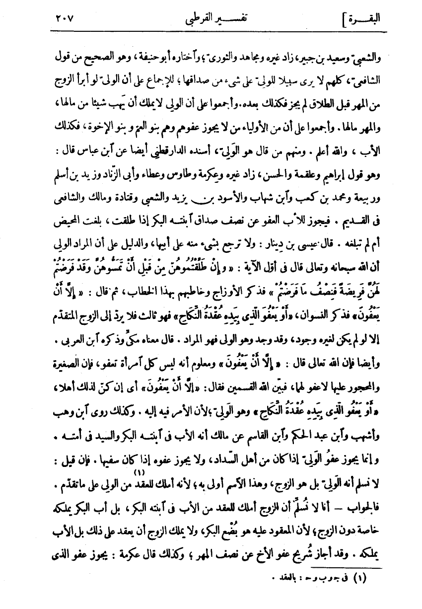 وَالشَّعْبِيُّ وَسَعِيدُ بْنُ جُبَيْرٍ، زَادَ غَيْرُهُ وَمُجَاهِدٌ وَالثَّوْرِيُّ، وَاخْتَارَهُ أَبُو حَنِيفَةَ، وَهُوَ الصَّحِيحُ مِنْ قَوْلِ الشَّافِعِيِّ، كُلُّهُمْ لَا يَرَى سَبِيلًا لِلْوَلِيِّ على شي مِنْ صَدَاقِهَا، لِلْإِجْمَاعِ عَلَى أَنَّ الْوَلِيَّ لَوْ أَبْرَأَ الزَّوْجَ مِنَ الْمَهْرِ قَبْلَ الطَّلَاقِ لَمْ يَجُزْ فَكَذَلِكَ بَعْدَهُ. وَأَجْمَعُوا عَلَى أَنَّ الْوَلِيَّ لَا يَمْلِكُ أَنْ يَهَبَ شَيْئًا مِنْ مَالِهَا، وَالْمَهْرُ مَالُهَا. وَأَجْمَعُوا عَلَى أَنَّ مِنَ الْأَوْلِيَاءِ مَنْ لَا يَجُوزُ عَفْوُهُمْ وَهُمْ بَنُو الْعَمِّ وَبَنُو الْإِخْوَةِ، فَكَذَلِكَ الْأَبُ، وَاللَّهُ أَعْلَمُ. وَمِنْهُمْ مَنْ قَالَ هُوَ الْوَلِيُّ، أَسْنَدَهُ الدَّارَقُطْنِيُّ أَيْضًا عَنِ ابْنِ عَبَّاسٍ قَالَ: وَهُوَ قَوْلُ إِبْرَاهِيمَ وَعَلْقَمَةَ وَالْحَسَنِ، زَادَ غَيْرُهُ وَعِكْرِمَةَ وَطَاوُسٍ وَعَطَاءٍ وَأَبِي الزِّنَادِ وَزَيْدِ بْنِ أَسْلَمَ وَرَبِيعَةَ وَمُحَمَّدِ بْنِ كَعْبٍ وَابْنِ شِهَابٍ وَالْأَسْوَدِ بْنِ يَزِيدَ وَالشَّعْبِيِّ وَقَتَادَةَ وَمَالِكٍ وَالشَّافِعِيِّ فِي الْقَدِيمِ. فَيَجُوزُ لِلْأَبِ الْعَفْوُ عَنْ نِصْفِ صَدَاقِ ابْنَتِهِ الْبِكْرِ إِذَا طُلِّقَتْ، بَلَغَتِ الْمَحِيضَ أَمْ لَمْ تَبْلُغْهُ. قَالَ عِيسَى بْنُ دِينَارٍ: وَلَا تَرْجِعُ بِشَيْءٍ مِنْهُ عَلَى أَبِيهَا، وَالدَّلِيلُ عَلَى أَنَّ الْمُرَادَ الْوَلِيُّ أَنَّ اللَّهَ سُبْحَانَهُ وَتَعَالَى قَالَ فِي أَوَّلِ الْآيَةِ:" وَإِنْ طَلَّقْتُمُوهُنَّ مِنْ قَبْلِ أَنْ تَمَسُّوهُنَّ وَقَدْ فَرَضْتُمْ لَهُنَّ فَرِيضَةً فَنِصْفُ مَا فَرَضْتُمْ" فَذَكَرَ الْأَزْوَاجَ وَخَاطَبَهُمْ بِهَذَا الْخِطَابِ، ثُمَّ قَالَ:" إِلَّا أَنْ يَعْفُونَ" فَذَكَرَ النِّسْوَانَ،" أَوْ يَعْفُوَا الَّذِي بِيَدِهِ عُقْدَةُ النِّكاحِ" فَهُوَ ثَالِثٌ فَلَا يُرَدُّ إِلَى الزَّوْجِ الْمُتَقَدِّمِ إِلَّا لَوْ لَمْ يَكُنْ لِغَيْرِهِ وُجُودٌ، وَقَدْ وُجِدَ وَهُوَ الْوَلِيُّ فَهُوَ الْمُرَادُ. قَالَ مَعْنَاهُ مَكِّيٌّ وَذَكَرَهُ ابْنُ الْعَرَبِيِّ. وَأَيْضًا فَإِنَّ اللَّهَ تَعَالَى قَالَ:" إِلَّا أَنْ يَعْفُونَ" وَمَعْلُومٌ أَنَّهُ لَيْسَ كُلُّ امْرَأَةٍ تَعْفُو، فَإِنَّ الصَّغِيرَةَ وَالْمَحْجُورَ عَلَيْهَا لَا عَفْوَ لَهُمَا، فَبَيَّنَ اللَّهُ الْقِسْمَيْنِ فَقَالَ:" إِلَّا أَنْ يَعْفُونَ" أَيْ إِنْ كُنَّ لِذَلِكَ أَهْلًا،" أَوْ يَعْفُوَا الَّذِي بِيَدِهِ عُقْدَةُ النِّكاحِ" وَهُوَ الْوَلِيُّ، لِأَنَّ الْأَمْرَ فِيهِ إِلَيْهِ. وَكَذَلِكَ رَوَى ابْنُ وَهْبٍ وَأَشْهَبُ وَابْنُ عَبْدِ الْحَكَمِ وَابْنُ الْقَاسِمِ عَنْ مَالِكٍ أَنَّهُ الْأَبُ فِي ابْنَتِهِ الْبِكْرِ وَالسَّيِّدُ فِي أَمَتِهِ. وَإِنَّمَا يَجُوزُ عَفْوُ الْوَلِيِّ إِذَا كَانَ مِنْ أَهْلِ السَّدَادِ، وَلَا يَجُوزُ عَفْوُهُ إِذَا كَانَ سَفِيهًا. فَإِنْ قِيلَ: لَا نُسَلِّمُ أَنَّهُ الْوَلِيُّ بَلْ هُوَ الزَّوْجُ، وَهَذَا الِاسْمُ أَوْلَى بِهِ، لِأَنَّهُ أَمْلَكُ لِلْعَقْدِ «١» مِنَ الْوَلِيِّ عَلَى مَا تَقَدَّمَ. فَالْجَوَابُ- أَنَّا لَا نُسَلِّمُ أَنَّ الزَّوْجَ أَمْلَكُ لِلْعَقْدِ مِنَ الْأَبِ فِي ابْنَتِهِ الْبِكْرِ، بَلْ أَبُ الْبِكْرِ يَمْلِكُهُ خَاصَّةً دُونَ الزَّوْجِ، لِأَنَّ الْمَعْقُودَ عَلَيْهِ هُوَ بُضْعُ الْبِكْرِ، وَلَا يَمْلِكُ الزَّوْجُ أَنْ يَعْقِدَ عَلَى ذَلِكَ بَلِ الْأَبُ يَمْلِكُهُ. وَقَدْ أَجَازَ شُرَيْحٌ عَفْوَ الْأَخِ عَنْ نِصْفِ الْمَهْرِ، وَكَذَلِكَ قَالَ عكرمة: يجوز عفو الذي