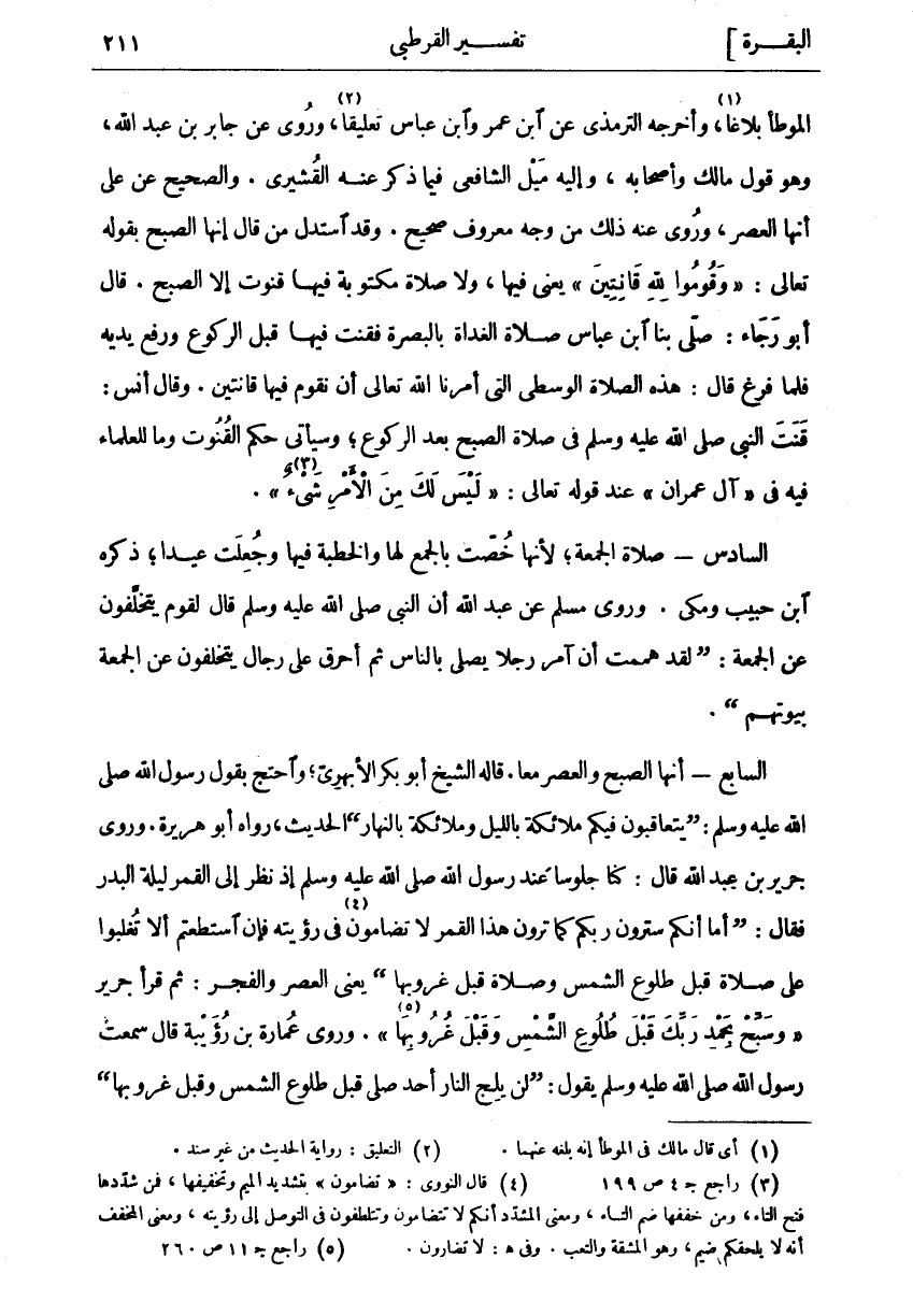 الْمُوَطَّأُ بَلَاغًا «١»، وَأَخْرَجَهُ التِّرْمِذِيُّ عَنِ ابْنِ عُمَرَ وَابْنِ عَبَّاسٍ تَعْلِيقًا «٢»، وَرُوِيَ عَنْ جَابِرِ بْنِ عَبْدِ اللَّهِ، وَهُوَ قَوْلُ مَالِكٍ وَأَصْحَابِهِ وَإِلَيْهِ مَيْلُ الشَّافِعِيِّ فِيمَا ذَكَرَ عَنْهُ الْقُشَيْرِيُّ. وَالصَّحِيحُ عَنْ عَلِيٍّ أَنَّهَا الْعَصْرُ، وَرُوِيَ عَنْهُ ذَلِكَ مِنْ وَجْهٍ مَعْرُوفٍ صَحِيحٍ. وَقَدِ اسْتَدَلَّ مَنْ قَالَ إِنَّهَا الصُّبْحُ بِقَوْلِهِ تَعَالَى:" وَقُومُوا لِلَّهِ قانِتِينَ" يَعْنِي فِيهَا، وَلَا صَلَاةَ مَكْتُوبَةً فِيهَا قُنُوتٌ إِلَّا الصُّبْحَ. قَالَ أَبُو رَجَاءٍ: صَلَّى بِنَا ابْنُ عَبَّاسٍ صَلَاةَ الْغَدَاةِ بِالْبَصْرَةِ فَقَنَتَ فِيهَا قَبْلَ الرُّكُوعِ وَرَفَعَ يَدَيْهِ فَلَمَّا فَرَغَ قَالَ: هَذِهِ الصَّلَاةُ الْوُسْطَى الَّتِي أَمَرَنَا اللَّهُ تَعَالَى أَنْ نَقُومَ فِيهَا قَانِتِينَ. وَقَالَ أَنَسٌ: قَنَتَ النَّبِيُّ صَلَّى اللَّهُ عَلَيْهِ وَسَلَّمَ فِي صَلَاةِ الصُّبْحِ بَعْدَ الرُّكُوعِ، وَسَيَأْتِي حُكْمُ الْقُنُوتِ وَمَا لِلْعُلَمَاءِ فِيهِ فِي" آلِ عِمْرَانَ" عِنْدَ قَوْلِهِ تَعَالَى:" لَيْسَ لَكَ مِنَ الْأَمْرِ شَيْءٌ «٣» ". السَّادِسُ- صَلَاةُ الْجُمُعَةِ، لِأَنَّهَا خُصَّتْ بِالْجَمْعِ لَهَا وَالْخُطْبَةِ فِيهَا وَجُعِلَتْ عِيدًا، ذَكَرَهُ ابْنُ حَبِيبٍ وَمَكِّيٌّ. وَرَوَى مُسْلِمٌ عَنْ عَبْدِ اللَّهِ أَنَّ النَّبِيَّ صَلَّى اللَّهُ عَلَيْهِ وَسَلَّمَ قَالَ لِقَوْمٍ يَتَخَلَّفُونَ عَنِ الْجُمُعَةِ:" لَقَدْ هَمَمْتُ أَنْ آمُرَ رَجُلًا يُصَلِّي بِالنَّاسِ ثُمَّ أَحْرِقْ عَلَى رِجَالٍ يَتَخَلَّفُونَ عَنِ الْجُمُعَةِ بُيُوتَهُمْ". السَّابِعُ- إِنَّهَا الصُّبْحُ وَالْعَصْرُ مَعًا. قَالَهُ الشَّيْخُ أَبُو بَكْرٍ الْأَبْهَرِيُّ، وَاحْتَجَّ بِقَوْلِ رَسُولِ اللَّهِ صَلَّى اللَّهُ عَلَيْهِ وَسَلَّمَ:" يَتَعَاقَبُونَ فِيكُمْ مَلَائِكَةٌ بِاللَّيْلِ وَمَلَائِكَةٌ بِالنَّهَارِ" الْحَدِيثَ، رَوَاهُ أَبُو هُرَيْرَةَ. وَرَوَى جَرِيرُ بْنُ عَبْدِ اللَّهِ قَالَ: كُنَّا جُلُوسًا عِنْدَ رَسُولِ اللَّهِ صَلَّى اللَّهُ عَلَيْهِ وَسَلَّمَ إِذْ نَظَرَ إِلَى الْقَمَرِ لَيْلَةَ الْبَدْرِ فَقَالَ:" أَمَا إِنَّكُمْ سَتَرَوْنَ رَبَّكُمْ كَمَا تَرَوْنَ هَذَا الْقَمَرَ لَا تُضَامُونَ «٤» فِي رُؤْيَتِهِ فَإِنِ اسْتَطَعْتُمْ أَلَّا تُغْلَبُوا عَلَى صَلَاةٍ قَبْلَ طُلُوعِ الشَّمْسِ وَصَلَاةٍ قَبْلَ غُرُوبِهَا" يَعْنِي الْعَصْرَ وَالْفَجْرَ: ثُمَّ قَرَأَ جَرِيرٌ" وَسَبِّحْ بِحَمْدِ رَبِّكَ قَبْلَ طُلُوعِ الشَّمْسِ وَقَبْلَ غُرُوبِها «٥» ". وروى عمارة بن رويبة قَالَ سَمِعْتُ رَسُولَ اللَّهِ صَلَّى اللَّهُ عَلَيْهِ وَسَلَّمَ يَقُولُ:" لَنْ يَلِجَ النَّارَ أَحَدٌ صَلَّى قبل طلوع الشمس وقبل غروبها"