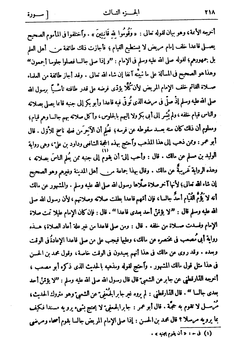 أَخْرَجَهُ الْأَئِمَّةُ، وَهُوَ بَيَانٌ لِقَوْلِهِ تَعَالَى:" وَقُومُوا لِلَّهِ قانِتِينَ". وَاخْتَلَفُوا فِي الْمَأْمُومِ الصَّحِيحِ يُصَلِّي قَاعِدًا خَلْفَ إِمَامٍ مَرِيضٍ لَا يَسْتَطِيعُ الْقِيَامَ، فَأَجَازَتْ ذَلِكَ طَائِفَةٌ مِنْ أَهْلِ الْعِلْمِ بَلْ جُمْهُورُهُمْ، لِقَوْلِهِ صَلَّى اللَّهُ عَلَيْهِ وَسَلَّمَ فِي الْإِمَامِ:" وَإِذَا صَلَّى جَالِسًا فَصَلُّوا جُلُوسًا أَجْمَعُونَ" وَهَذَا هُوَ الصَّحِيحُ فِي الْمَسْأَلَةِ عَلَى مَا نُبَيِّنُهُ آنِفًا إِنْ شَاءَ اللَّهُ تَعَالَى. وَقَدْ أَجَازَ طَائِفَةٌ مِنَ الْعُلَمَاءِ صَلَاةَ الْقَائِمِ خَلْفَ الْإِمَامِ الْمَرِيضِ لِأَنَّ كُلًّا يُؤَدِّي فَرْضَهُ عَلَى قَدْرِ طَاقَتِهِ تَأَسِّيًا بِرَسُولِ اللَّهِ صَلَّى اللَّهُ عَلَيْهِ وَسَلَّمَ إِذْ صَلَّى فِي مَرَضِهِ الَّذِي تُوُفِّيَ فِيهِ قَاعِدًا وَأَبُو بَكْرٍ إِلَى جَنْبِهِ قَائِمًا يُصَلِّي بِصَلَاتِهِ وَالنَّاسُ قِيَامٌ خَلْفَهُ، وَلَمْ يُشِرْ إِلَى أَبِي بَكْرٍ وَلَا إِلَيْهِمْ بِالْجُلُوسِ، وَأَكْمَلَ صَلَاتَهُ بِهِمْ جَالِسًا وَهُمْ قِيَامٌ، وَمَعْلُومٌ أَنَّ ذَلِكَ كَانَ مِنْهُ بَعْدَ سُقُوطِهِ عَنْ فَرَسِهِ، فَعُلِمَ أَنَّ الْآخِرَ مِنْ فِعْلِهِ نَاسِخٌ لِلْأَوَّلِ. قَالَ أَبُو عُمَرَ: وَمِمَّنْ ذَهَبَ إِلَى هَذَا الْمَذْهَبِ وَاحْتَجَّ بِهَذِهِ الْحُجَّةِ الشَّافِعِيُّ وَدَاوُدُ بْنُ عَلِيٍّ، وَهِيَ رِوَايَةُ الْوَلِيدِ بْنِ مُسْلِمٍ عَنْ مَالِكٍ قَالَ: وَأَحَبُّ إِلَيَّ أَنْ يَقُومَ «١» إِلَى جَنْبِهِ مِمَّنْ يُعْلِمُ النَّاسَ بِصَلَاتِهِ، وَهَذِهِ الرِّوَايَةُ غَرِيبَةٌ عَنْ مَالِكٍ. وَقَالَ بِهَذَا جَمَاعَةٌ مِنْ أَهْلِ الْمَدِينَةِ وَغَيْرُهُمْ وَهُوَ الصَّحِيحُ إِنْ شَاءَ اللَّهُ تَعَالَى، لِأَنَّهَا آخِرُ صَلَاةٍ صَلَّاهَا رَسُولُ اللَّهِ صَلَّى اللَّهُ عَلَيْهِ وَسَلَّمَ. وَالْمَشْهُورُ عَنْ مَالِكٍ أَنَّهُ لَا يَؤُمُّ الْقُيَّامَ أَحَدٌ جالسا، فَإِنْ أَمَّهُمْ قَاعِدًا بَطَلَتْ صَلَاتُهُ وَصَلَاتُهُمْ، لِأَنَّ رَسُولَ اللَّهِ صَلَّى اللَّهُ عَلَيْهِ وَسَلَّمَ قال:" لَا يَؤُمَّنَّ أَحَدٌ بَعْدِي قَاعِدًا". قَالَ: فَإِنْ كَانَ الْإِمَامُ عَلِيلًا تَمَّتْ صَلَاةُ الْإِمَامِ وَفَسَدَتْ صَلَاةُ مَنْ خَلْفَهُ. قَالَ: وَمَنْ صَلَّى قَاعِدًا مِنْ غَيْرِ عِلَّةٍ أَعَادَ الصَّلَاةَ، هَذِهِ رِوَايَةُ أَبِي مُصْعَبٍ فِي مُخْتَصَرِهِ عَنْ مَالِكٍ، وَعَلَيْهَا فَيَجِبُ عَلَى مَنْ صَلَّى قَاعِدًا الْإِعَادَةُ فِي الْوَقْتِ وَبَعْدَهُ. وَقَدْ رُوِيَ عَنْ مَالِكٍ فِي هَذَا أَنَّهُمْ يُعِيدُونَ فِي الْوَقْتِ خَاصَّةً، وَقَوْلُ مُحَمَّدِ بْنِ الْحَسَنِ فِي هَذَا مِثْلَ قَوْلِ مَالِكٍ الْمَشْهُورِ. وَاحْتَجَّ لِقَوْلِهِ وَمَذْهَبِهِ بِالْحَدِيثِ الَّذِي ذَكَرَهُ أَبُو مُصْعَبٍ، أَخْرَجَهُ الدَّارَقُطْنِيُّ عَنْ جَابِرٍ عَنِ الشَّعْبِيِّ قَالَ قَالَ رَسُولُ اللَّهِ صَلَّى اللَّهُ عَلَيْهِ وَسَلَّمَ:" لَا يَؤُمَّنَّ أَحَدٌ بَعْدِي جَالِسًا". قَالَ الدَّارَقُطْنِيُّ: لَمْ يَرْوِهِ غَيْرُ جَابِرٍ الْجُعْفِيِّ عَنِ الشَّعْبِيِّ وَهُوَ مَتْرُوكُ الْحَدِيثِ، مُرْسِلٌ لَا تَقُومُ بِهِ حُجَّةٌ. قَالَ أَبُو عُمَرَ: جَابِرٌ الْجُعْفِيُّ لَا يُحْتَجُّ بِشَيْءٍ يَرْوِيهِ مُسْنَدًا فَكَيْفَ بِمَا يَرْوِيهِ مُرْسَلًا؟ قَالَ مُحَمَّدُ بْنُ الْحَسَنِ: إِذَا صَلَّى الْإِمَامُ الْمَرِيضُ جَالِسًا بِقَوْمٍ أصحاء ومرضى