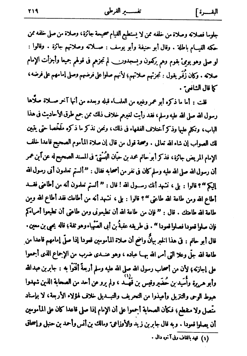جُلُوسًا فَصَلَاتُهُ وَصَلَاةُ مَنْ خَلْفَهُ مِمَّنْ لَا يَسْتَطِيعُ الْقِيَامَ صَحِيحَةٌ جَائِزَةٌ، وَصَلَاةُ مَنْ صَلَّى خَلْفَهُ مِمَّنْ حُكْمُهُ الْقِيَامُ بَاطِلَةٌ. وَقَالَ أَبُو حَنِيفَةَ وَأَبُو يُوسُفَ: صَلَاتُهُ وَصَلَاتُهُمْ جَائِزَةٌ. وَقَالُوا: لَوْ صَلَّى وَهُوَ يُومِئُ بِقَوْمٍ وَهُمْ يَرْكَعُونَ وَيَسْجُدُونَ لَمْ تُجْزِهِمْ فِي قَوْلِهِمْ جَمِيعًا وَأَجْزَأَتِ الامام صلاته. وكان زفر يقول: تجزيهم صَلَاتُهُمْ، لِأَنَّهُمْ صَلَّوْا عَلَى فَرْضِهِمْ وَصَلَّى إِمَامُهُمْ عَلَى فَرْضِهِ، كَمَا قَالَ الشَّافِعِيُّ. قُلْتُ: أَمَّا مَا ذَكَرَهُ أَبُو عُمَرَ وَغَيْرُهُ مِنَ الْعُلَمَاءِ قَبْلَهُ وَبَعْدَهُ مِنْ أَنَّهَا آخِرُ صَلَاةٍ صَلَّاهَا رَسُولُ اللَّهِ صَلَّى اللَّهُ عَلَيْهِ وَسَلَّمَ، فَقَدْ رأيت لغيرهم خلال ذَلِكَ مِمَّنْ جَمَعَ طُرُقَ الْأَحَادِيثِ فِي هَذَا الْبَابِ، وَتَكَلَّمَ عَلَيْهَا وَذَكَرَ اخْتِلَافَ الْفُقَهَاءِ فِي ذَلِكَ، وَنَحْنُ نَذْكُرُ مَا ذَكَرَهُ مُلَخَّصًا حَتَّى يَتَبَيَّنَ لَكَ الصَّوَابُ إِنْ شَاءَ اللَّهُ تَعَالَى. وَصِحَّةُ قَوْلِ مَنْ قَالَ إِنَّ صَلَاةَ الْمَأْمُومِ الصَّحِيحِ قَاعِدًا خَلْفَ الْإِمَامِ الْمَرِيضِ جَائِزَةٌ، فَذَكَرَ أَبُو حَاتِمٍ مُحَمَّدُ بْنُ حِبَّانَ الْبُسْتِيُّ فِي الْمُسْنَدِ الصَّحِيحِ لَهُ عَنِ ابْنِ عُمَرَ أَنَّ رَسُولَ اللَّهِ صَلَّى اللَّهُ عَلَيْهِ وَسَلَّمَ كان فِي نَفَرٍ مِنْ أَصْحَابِهِ فَقَالَ:" أَلَسْتُمْ تَعْلَمُونَ أَنِّي رَسُولُ اللَّهِ إِلَيْكُمْ"؟ قَالُوا: بَلَى، نَشْهَدُ أَنَّكَ رَسُولُ اللَّهِ! قَالَ:" أَلَسْتُمْ تَعْلَمُونَ أَنَّهُ مَنْ أَطَاعَنِي فَقَدْ أَطاعَ اللَّهَ وَمِنْ طَاعَةِ اللَّهِ طَاعَتِي"؟ قَالُوا: بَلَى، نَشْهَدُ أَنَّهُ مَنْ أَطَاعَكَ فَقَدْ أَطَاعَ اللَّهَ وَمِنْ طَاعَةِ اللَّهِ طَاعَتُكَ. قَالَ:" فَإِنَّ مِنْ طَاعَةِ اللَّهِ أَنْ تُطِيعُونِي وَمِنْ طَاعَتِي أَنْ تُطِيعُوا أُمَرَاءَكُمْ فَإِنْ صَلَّوْا قُعُودًا فَصَلُّوا قُعُودًا". فِي طَرِيقِهِ عُقْبَةُ بن أبى الصهباء وهو ثقة، قال يَحْيَى بْنُ مَعِينٍ. قَالَ أَبُو حَاتِمٍ: فِي هَذَا الْخَبَرِ بَيَانٌ وَاضِحٌ أَنَّ صَلَاةَ الْمَأْمُومِينَ قُعُودًا إِذَا صَلَّى إِمَامُهُمْ قَاعِدًا مِنْ طَاعَةِ اللَّهِ جَلَّ وَعَلَا الَّتِي أَمَرَ اللَّهُ بِهَا عِبَادَهُ، وَهُوَ عِنْدِي ضَرْبٌ مِنَ الْإِجْمَاعِ الَّذِي أَجْمَعُوا عَلَى إِجَازَتِهِ، لِأَنَّ مِنْ أَصْحَابِ رَسُولِ اللَّهِ صَلَّى اللَّهُ عَلَيْهِ وَسَلَّمَ أَرْبَعَةً أَفْتَوْا بِهِ: جَابِرُ بْنُ عَبْدِ اللَّهِ وَأَبُو هُرَيْرَةَ وَأُسَيْدُ بْنُ حُضَيْرٍ وَقَيْسُ بْنُ قَهْدٍ «١»، وَلَمْ يُرْوَ عَنْ أَحَدٍ مِنَ الصَّحَابَةِ الَّذِينَ شَهِدُوا هُبُوطَ الْوَحْيِ وَالتَّنْزِيلِ وَأُعِيذُوا مِنَ التَّحْرِيفِ وَالتَّبْدِيلِ خِلَافٌ لِهَؤُلَاءِ الْأَرْبَعَةِ، لَا بِإِسْنَادٍ مُتَّصِلٍ وَلَا مُنْقَطِعٍ، فَكَأَنَّ الصَّحَابَةَ أَجْمَعُوا عَلَى أَنَّ الْإِمَامَ إِذَا صَلَّى قَاعِدًا كَانَ عَلَى الْمَأْمُومِينَ أَنْ يُصَلُّوا قُعُودًا. وَبِهِ قَالَ جَابِرُ بْنُ زَيْدٍ وَالْأَوْزَاعِيُّ وَمَالِكُ بْنُ أَنَسٍ وَأَحْمَدُ بْنُ حَنْبَلٍ وإسحاق