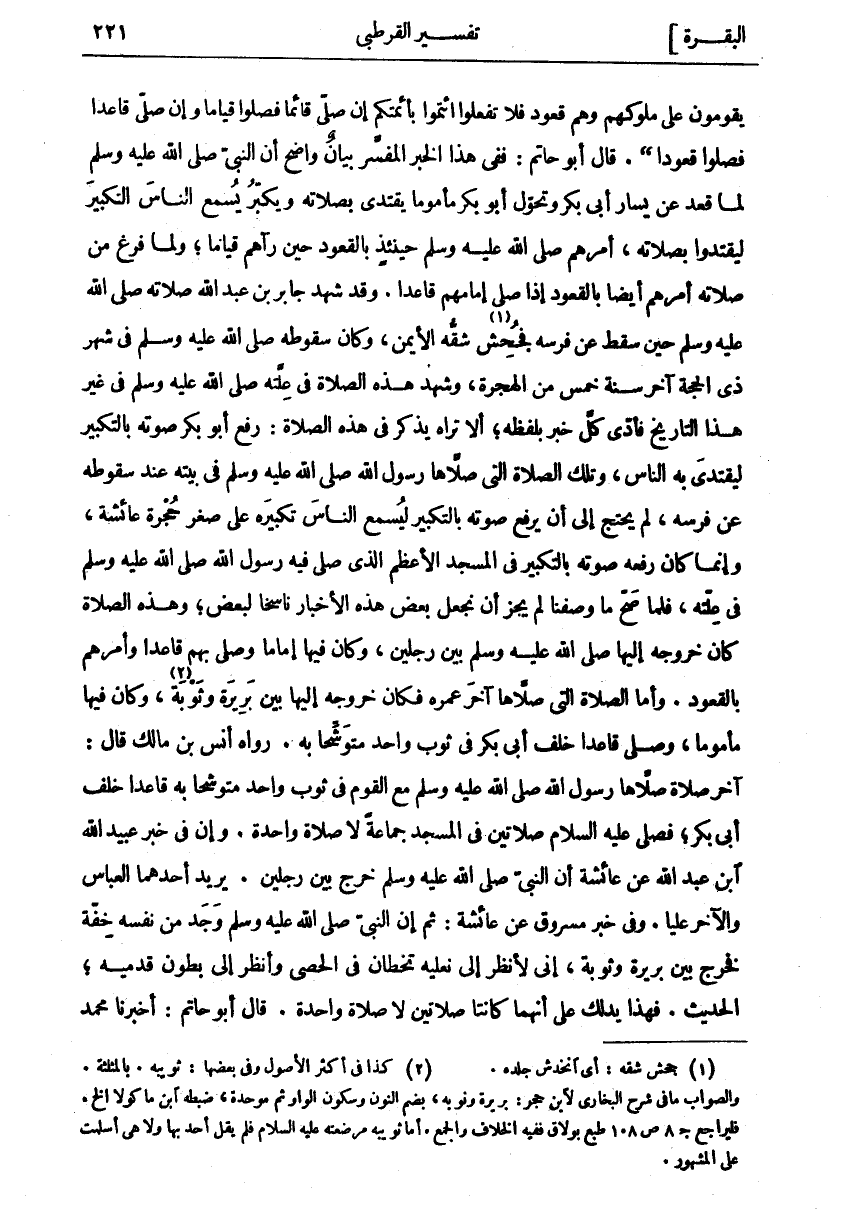 يَقُومُونَ عَلَى مُلُوكِهِمْ وَهُمْ قُعُودٌ فَلَا تَفْعَلُوا ائْتَمُّوا بِأَئِمَّتِكُمْ إِنْ صَلَّى قَائِمًا فَصَلُّوا قِيَامًا وَإِنْ صَلَّى قَاعِدًا فَصَلُّوا قُعُودًا". قَالَ أَبُو حَاتِمٍ: فَفِي هَذَا الْخَبَرِ الْمُفَسَّرِ بَيَانٌ وَاضِحٌ أَنَّ النَّبِيَّ صَلَّى اللَّهُ عَلَيْهِ وَسَلَّمَ لَمَّا قَعَدَ عَنْ يَسَارِ أَبِي بَكْرٍ وَتَحَوَّلَ أَبُو بَكْرٍ مَأْمُومًا يَقْتَدِي بِصَلَاتِهِ وَيُكَبِّرُ يُسْمِعُ النَّاسَ التَّكْبِيرَ لِيَقْتَدُوا بِصَلَاتِهِ، أَمَرَهُمْ صَلَّى اللَّهُ عَلَيْهِ وَسَلَّمَ حِينَئِذٍ بِالْقُعُودِ حِينَ رَآهُمْ قِيَامًا، وَلَمَّا فَرَغَ مِنْ صَلَاتِهِ أَمَرَهُمْ أَيْضًا بِالْقُعُودِ إِذَا صَلَّى إِمَامُهُمْ قَاعِدًا. وَقَدْ شَهِدَ جَابِرُ بْنُ عَبْدِ اللَّهِ صَلَاتَهُ صَلَّى اللَّهُ عَلَيْهِ وَسَلَّمَ حِينَ سَقَطَ عَنْ فَرَسِهِ فَجُحِشَ «١» شِقُّهُ الْأَيْمَنُ، وَكَانَ سُقُوطُهُ صَلَّى اللَّهُ عَلَيْهِ وَسَلَّمَ فِي شَهْرِ ذِي الْحِجَّةِ آخِرِ سَنَةِ خَمْسٍ مِنَ الْهِجْرَةِ، وَشَهِدَ هَذِهِ الصَّلَاةَ فِي عِلَّتِهِ صَلَّى اللَّهُ عَلَيْهِ وَسَلَّمَ فِي غَيْرِ هَذَا التَّارِيخِ فَأَدَّى كُلَّ خَبَرٍ بِلَفْظِهِ، أَلَا تَرَاهُ يَذْكُرُ فِي هَذِهِ الصَّلَاةِ: رَفَعَ أَبُو بَكْرٍ صَوْتَهُ بِالتَّكْبِيرِ لِيَقْتَدِيَ بِهِ النَّاسُ، وَتِلْكَ الصَّلَاةُ الَّتِي صَلَّاهَا رَسُولُ اللَّهِ صَلَّى اللَّهُ عَلَيْهِ وَسَلَّمَ فِي بَيْتِهِ عِنْدَ سُقُوطِهِ عَنْ فَرَسِهِ، لَمْ يَحْتَجْ إِلَى أَنْ يَرْفَعَ صَوْتَهُ بِالتَّكْبِيرِ لِيُسْمِعَ النَّاسَ تَكْبِيرَهُ عَلَى صِغَرِ حُجْرَةِ عَائِشَةَ، وَإِنَّمَا كَانَ رَفْعُهُ صَوْتَهُ بِالتَّكْبِيرِ فِي الْمَسْجِدِ الْأَعْظَمِ الَّذِي صَلَّى فِيهِ رَسُولُ اللَّهِ صَلَّى اللَّهُ عَلَيْهِ وَسَلَّمَ فِي عِلَّتِهِ، فَلَمَّا صَحَّ مَا وَصَفْنَا لَمْ يَجُزْ أَنْ نَجْعَلَ بَعْضَ هَذِهِ الْأَخْبَارِ نَاسِخًا لِبَعْضٍ، وَهَذِهِ الصَّلَاةُ كَانَ خُرُوجُهُ إِلَيْهَا صَلَّى اللَّهُ عَلَيْهِ وَسَلَّمَ بَيْنَ رَجُلَيْنِ، وَكَانَ فِيهَا إِمَامًا وَصَلَّى بِهِمْ قَاعِدًا وَأَمَرَهُمْ بِالْقُعُودِ. وَأَمَّا الصَّلَاةُ الَّتِي صَلَّاهَا آخِرَ عُمُرِهِ فَكَانَ خُرُوجُهُ إِلَيْهَا بَيْنَ بَرِيرَةَ وَثَوْبَةَ «٢»، وَكَانَ فِيهَا مَأْمُومًا، وَصَلَّى قَاعِدًا خَلْفَ أَبِي بَكْرٍ فِي ثَوْبٍ وَاحِدٍ مُتَوَشِّحًا بِهِ. رَوَاهُ أَنَسُ بْنُ مَالِكٍ قَالَ: آخِرُ صَلَاةٍ صَلَّاهَا رَسُولُ اللَّهِ صَلَّى اللَّهُ عَلَيْهِ وَسَلَّمَ مَعَ الْقَوْمِ فِي ثَوْبٍ وَاحِدٍ مُتَوَشِّحًا بِهِ قَاعِدًا خَلْفَ أَبِي بَكْرٍ، فَصَلَّى عَلَيْهِ السَّلَامُ صَلَاتَيْنِ فِي الْمَسْجِدِ جَمَاعَةً لَا صَلَاةً وَاحِدَةً. وَإِنَّ فِي خبر عبيد الله ابن عَبْدِ اللَّهِ عَنْ عَائِشَةَ أَنَّ النَّبِيَّ صَلَّى اللَّهُ عَلَيْهِ وَسَلَّمَ خَرَجَ بَيْنَ رَجُلَيْنِ. يُرِيدُ أَحَدُهُمَا الْعَبَّاسَ وَالْآخَرُ عَلِيًّا. وَفِي خَبَرِ مَسْرُوقٍ عَنْ عَائِشَةَ: ثُمَّ إِنَّ النَّبِيَّ صَلَّى اللَّهُ عَلَيْهِ وَسَلَّمَ وَجَدَ مِنْ نَفْسِهِ خِفَّةً فَخَرَجَ بَيْنَ بَرِيرَةَ وَثَوْبَةَ، إِنِّي لَأَنْظُرُ إِلَى نَعْلَيْهِ تَخُطَّانِ فِي الْحَصَى وَأَنْظُرُ إِلَى بُطُونِ قَدَمَيْهِ، الْحَدِيثَ. فَهَذَا يَدُلُّكَ عَلَى أَنَّهُمَا كَانَتَا صَلَاتَيْنِ لَا صَلَاةً وَاحِدَةً. قَالَ أَبُو حَاتِمٍ: أَخْبَرَنَا محمد