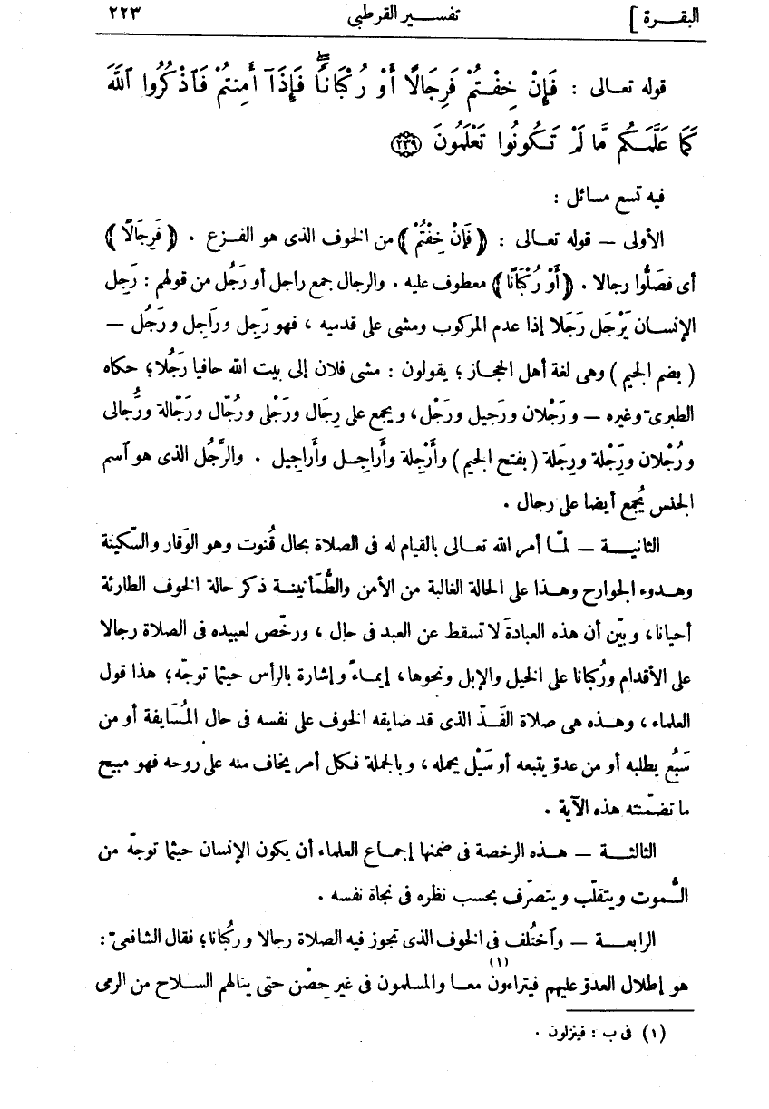 فِيهِ تِسْعُ مَسَائِلَ: الْأُولَى- قَوْلُهُ تَعَالَى: (فَإِنْ خِفْتُمْ) مِنَ الْخَوْفِ الَّذِي هُوَ الْفَزَعُ. (فَرِجالًا) أَيْ فَصَلُّوا رِجَالًا. (أَوْ رُكْباناً) مَعْطُوفٌ عَلَيْهِ. وَالرِّجَالُ جَمْعُ رَاجِلٍ أَوْ رَجُلٍ مِنْ قَوْلِهِمْ: رَجِلَ الْإِنْسَانُ يَرْجَلُ رَجَلًا إِذَا عَدِمَ الْمَرْكُوبَ وَمَشَى عَلَى قَدَمَيْهِ، فَهُوَ رَجِلٌ وَرَاجِلٌ وَرَجُلٌ- (بِضَمِّ الْجِيمِ) وَهِيَ لُغَةُ أَهْلِ الْحِجَازِ، يقولون: مشى فولان إِلَى بَيْتِ اللَّهِ حَافِيًا رَجُلًا، حَكَاهُ الطَّبَرِيُّ وَغَيْرُهُ- وَرَجْلَانِ وَرَجِيلٌ وَرَجْلٌ، وَيُجْمَعُ عَلَى رِجَالٍ وَرَجْلَى وَرُجَّالٍ وَرَجَّالَةٍ وَرُجَالَى وَرُجْلَانٍ وَرِجْلَةٍ وَرِجَلَةٍ (بِفَتْحِ الْجِيمِ) وَأَرْجِلَةٍ وَأَرَاجِلٍ وَأَرَاجِيلٍ. وَالرَّجُلُ الَّذِي هُوَ اسْمُ الْجِنْسِ يُجْمَعُ أَيْضًا عَلَى رِجَالٍ. الثَّانِيَةُ- لَمَّا أَمَرَ اللَّهُ تَعَالَى بِالْقِيَامِ لَهُ فِي الصَّلَاةِ بِحَالِ قُنُوتٍ وَهُوَ الْوَقَارُ وَالسَّكِينَةُ وَهُدُوءُ الْجَوَارِحِ وَهَذَا عَلَى الْحَالَةِ الْغَالِبَةِ مِنَ الْأَمْنِ وَالطُّمَأْنِينَةِ ذَكَرَ حَالَةَ الْخَوْفِ الطَّارِئَةَ أَحْيَانًا، وَبَيَّنَ أَنَّ هَذِهِ الْعِبَادَةَ لَا تَسْقُطُ عَنِ الْعَبْدِ فِي حَالٍ، وَرَخَّصَ لِعَبِيدِهِ فِي الصَّلَاةِ رِجَالًا عَلَى الْأَقْدَامِ وَرُكْبَانًا عَلَى الْخَيْلِ وَالْإِبِلِ وَنَحْوِهَا، إِيمَاءً وَإِشَارَةً بِالرَّأْسِ حَيْثُمَا تَوَجَّهَ، هَذَا قَوْلُ الْعُلَمَاءِ، وَهَذِهِ هِيَ صَلَاةُ الْفَذِّ الَّذِي قَدْ ضَايَقَهُ الْخَوْفُ عَلَى نَفْسِهِ فِي حَالِ الْمُسَايَفَةِ أَوْ مِنْ سَبْعٍ يَطْلُبُهُ أَوْ مِنْ عَدُوٍّ يَتْبَعُهُ أَوْ سَيْلٍ يَحْمِلُهُ، وَبِالْجُمْلَةِ فَكُلُّ أَمْرٍ يَخَافُ مِنْهُ عَلَى رُوحِهِ فَهُوَ مُبِيحٌ مَا تَضَمَّنَتْهُ هَذِهِ الْآيَةُ. الثَّالِثَةُ- هَذِهِ الرُّخْصَةُ فِي ضِمْنِهَا إِجْمَاعُ الْعُلَمَاءِ أَنْ يَكُونَ الْإِنْسَانُ حَيْثُمَا تَوَجَّهَ مِنَ السُّمُوتِ وَيَتَقَلَّبُ وَيَتَصَرَّفُ بِحَسَبِ نَظَرِهِ فِي نَجَاةِ نَفْسِهِ. الرَّابِعَةُ- وَاخْتُلِفَ فِي الْخَوْفِ الَّذِي تَجُوزُ فِيهِ الصَّلَاةُ رِجَالًا وَرُكْبَانًا، فَقَالَ الشَّافِعِيُّ: هُوَ إِطْلَالُ الْعَدُوِّ عَلَيْهِمْ فَيَتَرَاءَوْنَ «١» مَعًا وَالْمُسْلِمُونَ فِي غَيْرِ حِصْنٍ حَتَّى يَنَالَهُمُ السلاح من الرمي