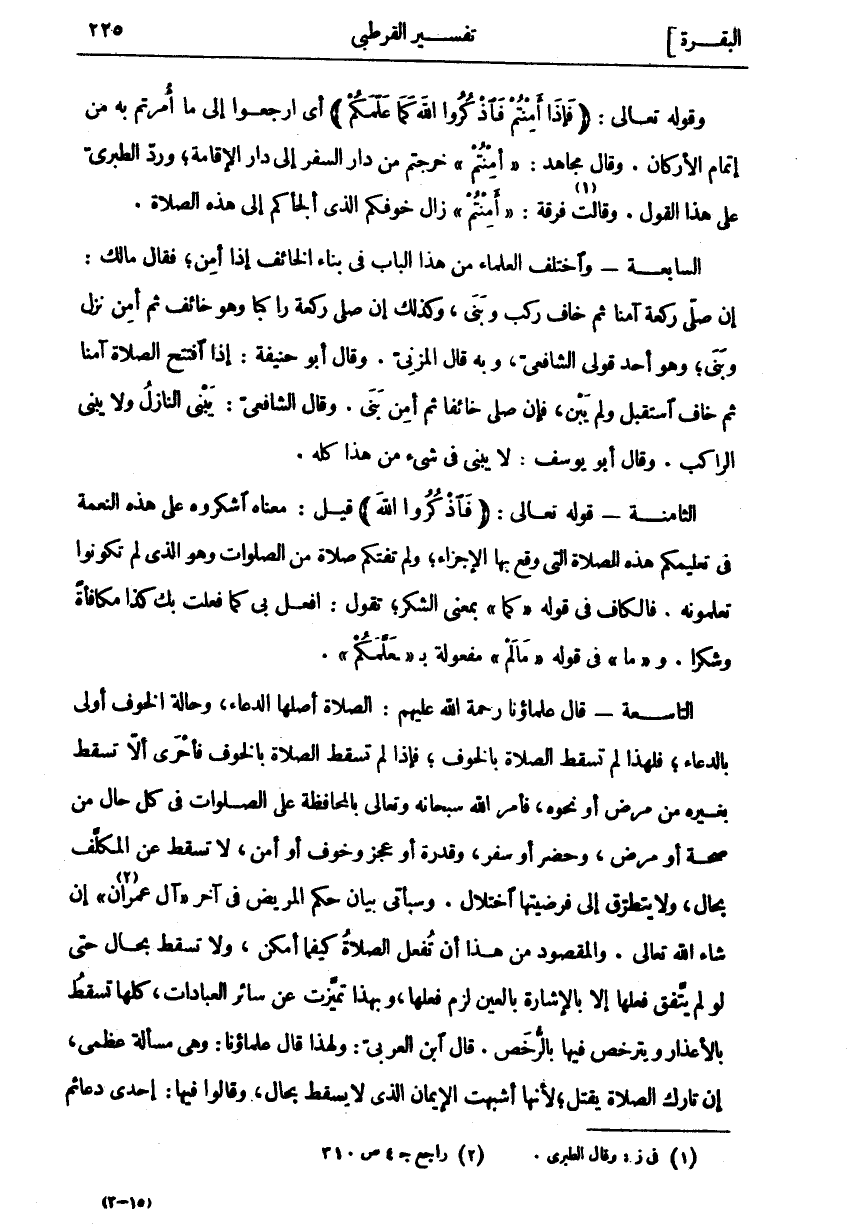 وقوله تَعَالَى: (فَإِذا أَمِنْتُمْ فَاذْكُرُوا اللَّهَ كَما عَلَّمَكُمْ" أَيِ ارْجِعُوا إِلَى مَا أُمِرْتُمْ بِهِ مِنْ إِتْمَامِ الْأَرْكَانِ. وَقَالَ مُجَاهِدٌ:" أَمِنْتُمْ" خَرَجْتُمْ مِنْ دَارِ السَّفَرِ إِلَى دَارِ الْإِقَامَةِ، وَرَدَّ الطَّبَرِيُّ عَلَى هَذَا الْقَوْلِ. وَقَالَتْ «١» فِرْقَةٌ:" أَمِنْتُمْ" زَالَ خَوْفُكُمُ الَّذِي أَلْجَأَكُمْ إِلَى هَذِهِ الصَّلَاةِ. السَّابِعَةُ- وَاخْتَلَفَ الْعُلَمَاءُ مِنْ هَذَا الْبَابِ فِي بِنَاءِ الْخَائِفِ إِذَا أَمِنَ، فَقَالَ مَالِكٌ: إِنْ صَلَّى رَكْعَةً آمِنًا ثُمَّ خَافَ رَكِبَ وَبَنَى، وَكَذَلِكَ إن صلى رَاكِبًا وَهُوَ خَائِفٌ ثُمَّ أَمِنَ نَزَلَ وَبَنَى، وَهُوَ أَحَدُ قَوْلَيِ الشَّافِعِيِّ، وَبِهِ قَالَ الْمُزَنِيُّ. وَقَالَ أَبُو حَنِيفَةَ: إِذَا افْتَتَحَ الصَّلَاةَ آمِنًا ثُمَّ خَافَ اسْتَقْبَلَ وَلَمْ يَبْنِ، فَإِنْ صَلَّى خَائِفًا ثُمَّ أَمِنَ بَنَى. وَقَالَ الشَّافِعِيُّ: يَبْنِي النَّازِلُ وَلَا يَبْنِي الرَّاكِبُ. وَقَالَ أَبُو يُوسُفَ: لا يبنى في شي مِنْ هَذَا كُلِّهِ. الثَّامِنَةُ- قَوْلُهُ تَعَالَى: (فَاذْكُرُوا اللَّهَ) قِيلَ: مَعْنَاهُ اشْكُرُوهُ عَلَى هَذِهِ النِّعْمَةِ فِي تَعْلِيمِكُمْ هَذِهِ الصَّلَاةَ الَّتِي وَقَعَ بِهَا الْإِجْزَاءُ، وَلَمْ تَفُتْكُمْ صَلَاةٌ مِنَ الصَّلَوَاتِ وَهُوَ الَّذِي لَمْ تَكُونُوا تَعْلَمُونَهُ. فَالْكَافُ فِي قَوْلِهِ" كَما" بِمَعْنَى الشُّكْرِ، تَقُولُ: افْعَلْ بِي كَمَا فَعَلْتُ بِكَ كَذَا مُكَافَأَةً وَشُكْرًا. وَ" مَا" فِي قَوْلِهِ" مَا لَمْ" مَفْعُولَةٌ بِ" عَلَّمَكُمْ". التَّاسِعَةُ- قَالَ عُلَمَاؤُنَا رَحْمَةُ اللَّهِ عَلَيْهِمْ: الصَّلَاةُ أَصْلُهَا الدُّعَاءُ، وَحَالَةُ الْخَوْفِ أَوْلَى بِالدُّعَاءِ، فَلِهَذَا لَمْ تَسْقُطِ الصَّلَاةُ بِالْخَوْفِ، فَإِذَا لَمْ تَسْقُطِ الصَّلَاةُ بِالْخَوْفِ فَأَحْرَى أَلَّا تَسْقُطَ بِغَيْرِهِ مِنْ مَرَضٍ أَوْ نَحْوِهِ، فَأَمَرَ اللَّهُ سُبْحَانَهُ وَتَعَالَى بِالْمُحَافَظَةِ عَلَى الصَّلَوَاتِ فِي كُلِّ حَالٍ مِنْ صِحَّةٍ أَوْ مَرَضٍ، وَحَضَرٍ أَوْ سَفَرٍ، وَقُدْرَةٍ أَوْ عَجْزٍ وَخَوْفٍ أَوْ أَمْنٍ، لَا تَسْقُطُ عَنِ الْمُكَلَّفِ بِحَالٍ، وَلَا يَتَطَرَّقُ إِلَى فَرْضِيَّتِهَا اخْتِلَالٌ. وَسَيَأْتِي بَيَانُ حُكْمِ الْمَرِيضِ فِي آخِرِ" آلِ عِمْرَانَ «٢» " إِنْ شَاءَ اللَّهُ تَعَالَى. وَالْمَقْصُودُ مِنْ هَذَا أَنْ تُفْعَلَ الصَّلَاةُ كَيْفَمَا أَمْكَنَ، وَلَا تَسْقُطُ بِحَالٍ حَتَّى لَوْ لَمْ يَتَّفِقْ فِعْلُهَا إِلَّا بِالْإِشَارَةِ بِالْعَيْنِ لَزِمَ فِعْلُهَا، وَبِهَذَا تَمَيَّزَتْ عَنْ سَائِرِ الْعِبَادَاتِ، كُلُّهَا تَسْقُطُ بِالْأَعْذَارِ وَيُتَرَخَّصُ فِيهَا بِالرُّخَصِ. قَالَ ابْنُ الْعَرَبِيِّ: وَلِهَذَا قَالَ عُلَمَاؤُنَا: وَهِيَ مَسْأَلَةٌ عُظْمَى، إِنَّ تَارِكَ الصَّلَاةِ يُقْتَلُ، لِأَنَّهَا أَشْبَهَتِ الْإِيمَانَ الَّذِي لَا يسقط بحال، وقالوا فيها: إحدى دعائم