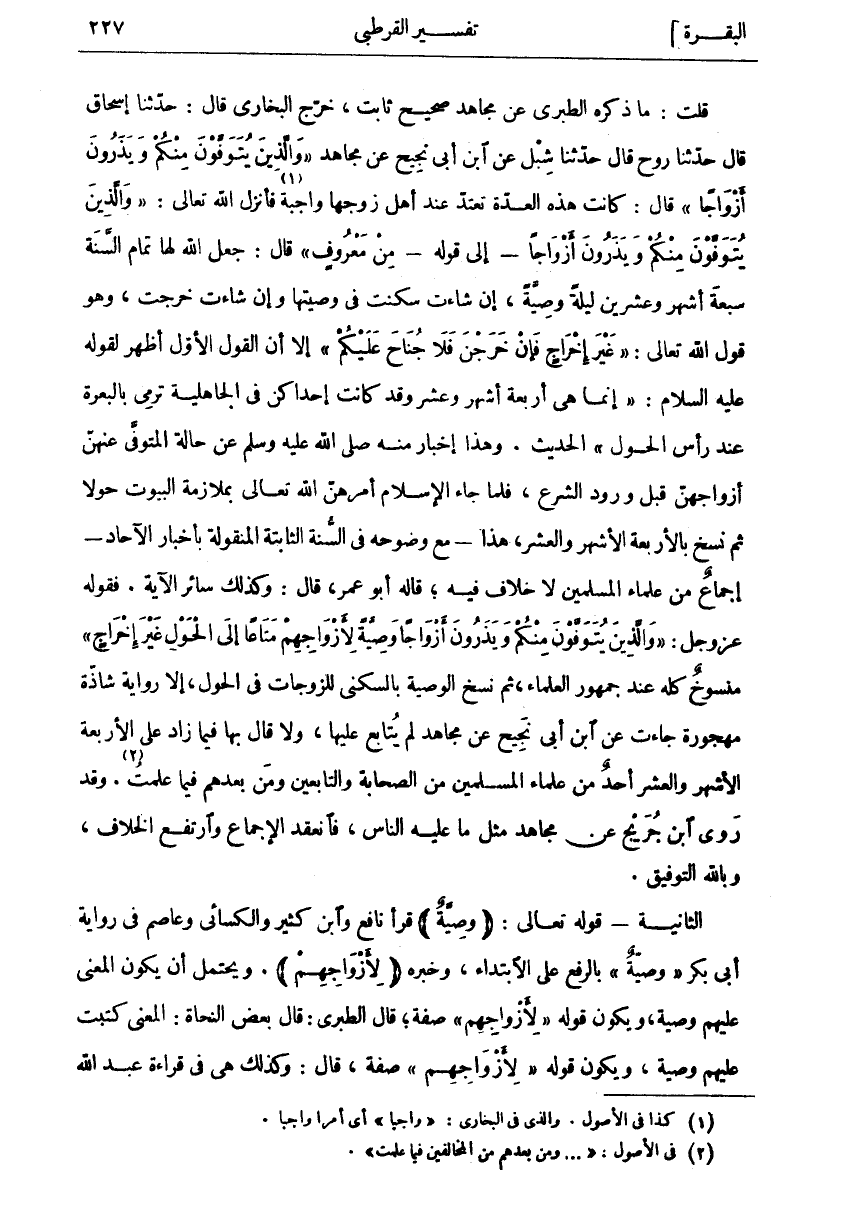 " مَنْسُوخٌ كُلُّهُ عِنْدَ جُمْهُورِ الْعُلَمَاءِ، ثُمَّ نَسَخَ الْوَصِيَّةَ بِالسُّكْنَى لِلزَّوْجَاتِ فِي الْحَوْلِ، إِلَّا رِوَايَةً شَاذَّةً مَهْجُورَةً جَاءَتْ عَنِ ابْنِ أَبِي نَجِيحٍ عَنْ مُجَاهِدٍ لَمْ يُتَابَعْ عَلَيْهَا، وَلَا قَالَ بِهَا فِيمَا زَادَ عَلَى الْأَرْبَعَةِ الْأَشْهُرِ وَالْعَشْرِ أَحَدٌ مِنْ عُلَمَاءِ الْمُسْلِمِينَ مِنَ الصَّحَابَةِ وَالتَّابِعِينَ وَمَنْ بَعْدَهُمْ فِيمَا عَلِمْتُ" «٢». وَقَدْ رَوَى ابْنُ جُرَيْجٍ عَنْ مُجَاهِدٍ مِثْلَ مَا عَلَيْهِ النَّاسُ، فَانْعَقَدَ الْإِجْمَاعُ وَارْتَفَعَ الْخِلَافُ، وَبِاللَّهِ التَّوْفِيقُ. الثَّانِيَةُ- قَوْلُهُ تَعَالَى: (وَصِيَّةً) قَرَأَ نَافِعٌ وَابْنُ كَثِيرٍ وَالْكِسَائِيُّ وَعَاصِمٌ فِي رِوَايَةِ أَبِي بَكْرٍ" وَصِيَّةٌ" بِالرَّفْعِ عَلَى الِابْتِدَاءِ، وَخَبَرُهُ (لِأَزْواجِهِمْ). وَيُحْتَمَلُ أَنْ يَكُونَ الْمَعْنَى عَلَيْهِمْ وَصِيَّةٌ، وَيَكُونُ قَوْلُهُ" لِأَزْواجِهِمْ" صِفَةً، قَالَ الطَّبَرِيُّ: قَالَ بَعْضُ النُّحَاةِ: الْمَعْنَى كُتِبَتْ عَلَيْهِمْ وَصِيَّةٌ، وَيَكُونُ قَوْلُهُ" لِأَزْواجِهِمْ" صِفَةً، قَالَ: وَكَذَلِكَ هِيَ فِي قِرَاءَةِ عَبْدِ اللَّهِ