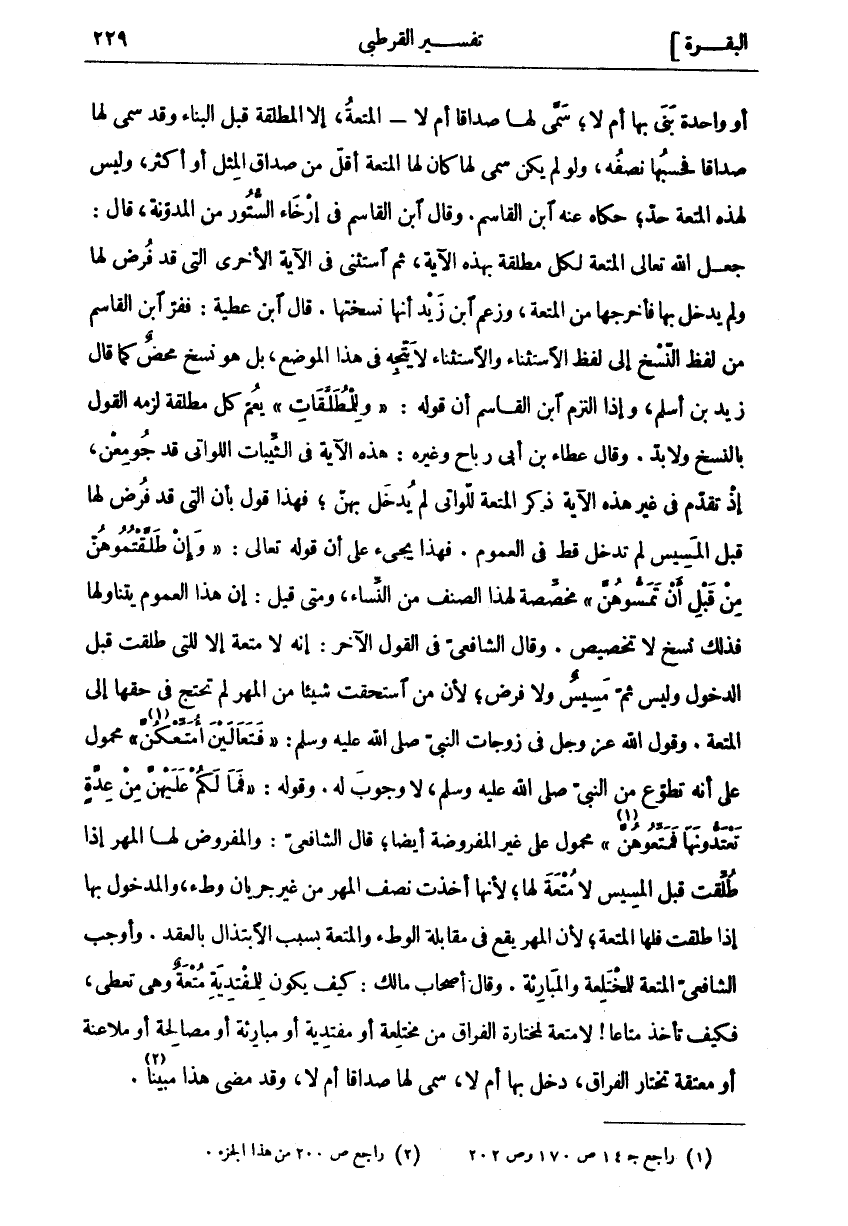 أَوْ وَاحِدَةٍ بَنَى بِهَا أَمْ لَا، سَمَّى لَهَا صَدَاقًا أَمْ لَا- الْمُتْعَةُ، إِلَّا الْمُطَلَّقَةَ قَبْلَ الْبِنَاءِ وَقَدْ سَمَّى لَهَا صَدَاقًا فَحَسْبُهَا نِصْفُهُ، وَلَوْ لَمْ يَكُنْ سَمَّى لَهَا كَانَ لَهَا الْمُتْعَةُ أَقَلَّ مِنْ صَدَاقِ الْمِثْلِ أَوْ أَكْثَرَ، وَلَيْسَ لِهَذِهِ الْمُتْعَةِ حَدٌّ، حَكَاهُ عَنْهُ ابْنُ الْقَاسِمِ. وَقَالَ ابْنُ الْقَاسِمِ فِي إِرْخَاءِ السُّتُورِ مِنَ الْمُدَوَّنَةِ، قَالَ: جَعَلَ اللَّهُ تَعَالَى الْمُتْعَةَ لِكُلِّ مُطَلَّقَةٍ بِهَذِهِ الْآيَةِ، ثُمَّ اسْتَثْنَى فِي الْآيَةِ الْأُخْرَى الَّتِي قَدْ فُرِضَ لَهَا وَلَمْ يُدْخَلْ بِهَا فَأَخْرَجَهَا مِنَ الْمُتْعَةِ، وَزَعَمَ ابْنُ زَيْدٍ أَنَّهَا نَسَخَتْهَا. قَالَ ابْنُ عَطِيَّةَ: فَفَرَّ ابْنُ الْقَاسِمِ مِنْ لَفْظِ النَّسْخِ إِلَى لَفْظِ الِاسْتِثْنَاءِ وَالِاسْتِثْنَاءُ لَا يُتَّجَهُ فِي هَذَا الْمَوْضِعِ، بَلْ هُوَ نَسْخٌ مَحْضٌ كَمَا قَالَ زَيْدُ بْنُ أَسْلَمَ، وَإِذَا الْتَزَمَ ابْنُ الْقَاسِمِ أَنَّ قَوْلَهُ:" وَلِلْمُطَلَّقاتِ" يَعُمُّ كُلَّ مُطَلَّقَةٍ لَزِمَهُ القول بالنسخ ولا بد. وَقَالَ عَطَاءُ بْنُ أَبِي رَبَاحٍ وَغَيْرُهُ: هَذِهِ الْآيَةُ فِي الثَّيِّبَاتِ اللَّوَاتِي قَدْ جُومِعْنَ، إِذْ تَقَدَّمَ فِي غَيْرِ هَذِهِ الْآيَةِ ذِكْرُ الْمُتْعَةِ لِلَّوَاتِي لَمْ يُدْخَلْ بِهِنَّ، فَهَذَا قَوْلٌ بِأَنَّ الَّتِي قَدْ فُرِضَ لَهَا قَبْلَ الْمَسِيسِ لَمْ تدخل قط في العموم. فهذا يجئ عَلَى أَنَّ قَوْلَهُ تَعَالَى:" وَإِنْ طَلَّقْتُمُوهُنَّ مِنْ قَبْلِ أَنْ تَمَسُّوهُنَّ" مُخَصَّصَةٌ لِهَذَا الصِّنْفِ مِنَ النِّسَاءِ، وَمَتَى قِيلَ: إِنَّ هَذَا الْعُمُومَ يَتَنَاوَلُهَا فَذَلِكَ نَسْخٌ لَا تَخْصِيصٌ. وَقَالَ الشَّافِعِيُّ فِي الْقَوْلِ الْآخَرِ: إِنَّهُ لَا مُتْعَةَ إِلَّا لِلَّتِي طُلِّقَتْ قَبْلَ الدُّخُولِ وَلَيْسَ ثَمَّ مَسِيسٌ وَلَا فَرْضٌ، لِأَنَّ مَنِ اسْتَحَقَّتْ شَيْئًا مِنَ الْمَهْرِ لَمْ تَحْتَجْ فِي حَقِّهَا إِلَى الْمُتْعَةِ. وَقَوْلُ اللَّهِ عَزَّ وَجَلَّ فِي زَوْجَاتِ النَّبِيِّ صَلَّى اللَّهُ عَلَيْهِ وَسَلَّمَ:" فَتَعالَيْنَ أُمَتِّعْكُنَّ «١» " مَحْمُولٌ عَلَى أَنَّهُ تَطَوُّعٌ مِنَ النَّبِيِّ صَلَّى اللَّهُ عَلَيْهِ وَسَلَّمَ، لَا وُجُوبَ لَهُ. وَقَوْلُهُ:" فَما لَكُمْ عَلَيْهِنَّ مِنْ عِدَّةٍ تَعْتَدُّونَها فَمَتِّعُوهُنَّ «٢» " مَحْمُولٌ عَلَى غَيْرِ الْمَفْرُوضَةِ أَيْضًا، قَالَ الشَّافِعِيُّ: وَالْمَفْرُوضُ لَهَا الْمَهْرُ إِذَا طُلِّقَتْ قَبْلَ الْمَسِيسِ لَا مُتْعَةَ لَهَا، لِأَنَّهَا أَخَذَتْ نِصْفَ الْمَهْرِ مِنْ غَيْرِ جريان وطئ، وَالْمَدْخُولُ بِهَا إِذَا طُلِّقَتْ فَلَهَا الْمُتْعَةُ، لِأَنَّ المهر يقع في مقابلة الوطي وَالْمُتْعَةَ بِسَبَبِ الِابْتِذَالِ بِالْعَقْدِ. وَأَوْجَبَ الشَّافِعِيُّ الْمُتْعَةَ لِلْمُخْتَلِعَةِ وَالْمُبَارِئَةِ. وَقَالَ أَصْحَابُ مَالِكٍ: كَيْفَ يَكُونُ لِلْمُفْتَدِيَةِ مُتْعَةٌ وَهِيَ تُعْطِي، فَكَيْفَ تَأْخُذُ مَتَاعًا! لَا مُتْعَةَ لِمُخْتَارَةِ الْفِرَاقِ مِنْ مُخْتَلِعَةٍ أَوْ مفتدية أو مباريه أَوْ مُصَالِحَةٍ أَوْ مُلَاعِنَةٍ أَوْ مُعْتَقَةٍ تَخْتَارُ الْفِرَاقَ، دَخَلَ بِهَا أَمْ لَا، سَمَّى لَهَا صَدَاقًا أَمْ لَا، وَقَدْ مَضَى هَذَا مُبَيَّنًا «٣».