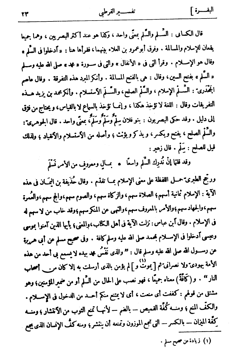 وَرَجَّحَ الطَّبَرِيُّ حَمْلَ اللَّفْظَةِ عَلَى مَعْنَى الْإِسْلَامِ بِمَا تَقَدَّمَ. وَقَالَ حُذَيْفَةُ بْنُ الْيَمَانِ فِي هَذِهِ الْآيَةِ: الْإِسْلَامُ ثَمَانِيَةُ أَسْهُمٍ، الصَّلَاةُ سَهْمٌ، وَالزَّكَاةُ سَهْمٌ، وَالصَّوْمُ سَهْمٌ، وَالْحَجُّ سَهْمٌ، وَالْعُمْرَةُ سَهْمٌ، وَالْجِهَادُ سَهْمٌ، وَالْأَمْرُ بِالْمَعْرُوفِ سَهْمٌ، وَالنَّهْيُ عَنِ الْمُنْكَرِ سَهْمٌ، وَقَدْ خَابَ مَنْ لَا سَهْمَ لَهُ فِي الْإِسْلَامِ. وَقَالَ ابْنُ عَبَّاسٍ: نَزَلَتِ الْآيَةُ فِي أَهْلِ الْكِتَابِ، وَالْمَعْنَى، يَا أَيُّهَا الَّذِينَ آمَنُوا بِمُوسَى وَعِيسَى ادْخُلُوا فِي الْإِسْلَامِ بِمُحَمَّدٍ صَلَّى اللَّهُ عَلَيْهِ وَسَلَّمَ كَافَّةً. وَفِي صَحِيحِ مُسْلِمٍ عَنْ أَبِي هُرَيْرَةَ عَنْ رَسُولِ اللَّهِ صَلَّى اللَّهُ عَلَيْهِ وَسَلَّمَ قَالَ:" وَالَّذِي نَفْسُ مُحَمَّدٍ بِيَدِهِ لَا يَسْمَعُ بِي أَحَدٌ مِنْ هَذِهِ الْأُمَّةِ يَهُودِيٌّ وَلَا نَصْرَانِيٌّ ثم [يموت «١» و] لَمْ يُؤْمِنْ بِالَّذِي أُرْسِلْتُ بِهِ إِلَّا كَانَ مِنْ أَصْحَابِ النَّارِ". وَ (كَافَّةً) مَعْنَاهُ جَمِيعًا، فَهُوَ نَصْبٌ عَلَى الْحَالِ مِنَ السِّلْمِ أَوْ مِنْ ضَمِيرِ الْمُؤْمِنِينَ، وَهُوَ مُشْتَقٌّ مِنْ قَوْلِهِمْ: كَفَفْتُ أَيْ مَنَعْتُ، أَيْ لَا يَمْتَنِعُ مِنْكُمْ أَحَدٌ مِنَ الدُّخُولِ فِي الْإِسْلَامِ. وَالْكَفُّ الْمَنْعُ، وَمِنْهُ كُفَّةُ الْقَمِيصِ- بِالضَّمِّ- لِأَنَّهَا تَمْنَعُ الثَّوْبَ مِنَ الِانْتِشَارِ، وَمِنْهُ كِفَّةُ الْمِيزَانِ- بِالْكَسْرِ- الَّتِي تَجْمَعُ الْمَوْزُونَ وَتَمْنَعُهُ أَنْ يَنْتَشِرَ، وَمِنْهُ كَفُّ الإنسان الذي يجمع
