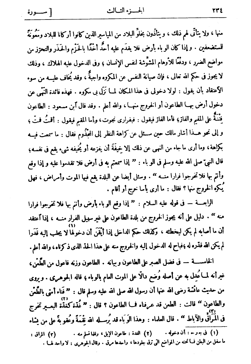 منها، ولا يتأتى لهم ذلك، ويتأذون بحلو الْبِلَادِ مِنَ الْمَيَاسِيرِ الَّذِينَ كَانُوا أَرْكَانًا لِلْبِلَادِ وَمَعُونَةً لِلْمُسْتَضْعَفِينَ. وَإِذَا كَانَ الْوَبَاءُ بِأَرْضٍ فَلَا يَقْدَمُ عَلَيْهِ أَحَدٌ أَخْذًا بِالْحَزْمِ وَالْحَذَرِ وَالتَّحَرُّزِ مِنْ مَوَاضِعِ الضَّرَرِ، وَدَفْعًا لِلْأَوْهَامِ الْمُشَوِّشَةِ لِنَفْسِ الْإِنْسَانِ، وَفِي الدُّخُولِ عَلَيْهِ الْهَلَاكُ، وَذَلِكَ لَا يَجُوزُ فِي حُكْمِ اللَّهِ تَعَالَى، فَإِنَّ صِيَانَةَ النَّفْسِ عَنِ الْمَكْرُوهِ وَاجِبَةٌ، وَقَدْ يُخَافُ عَلَيْهِ مِنْ سُوءِ الِاعْتِقَادِ بِأَنْ يَقُولَ: لَوْلَا دُخُولِي فِي هَذَا الْمَكَانِ لَمَا نَزَلَ بِي مَكْرُوهٌ. فَهَذِهِ فَائِدَةُ النَّهْيِ عَنْ دُخُولِ أَرْضٍ بِهَا الطَّاعُونُ أَوِ الْخُرُوجِ مِنْهَا، وَاللَّهُ أَعْلَمُ. وَقَدْ قَالَ ابْنُ مَسْعُودٍ: الطَّاعُونُ فِتْنَةٌ عَلَى الْمُقِيمِ وَالْفَارِّ، فَأَمَّا الْفَارُّ فَيَقُولُ: فَبِفِرَارِي نَجَوْتُ، وَأَمَّا الْمُقِيمُ فَيَقُولُ: أَقَمْتُ فَمُتُّ، وَإِلَى نَحْوِ هَذَا أَشَارَ مَالِكٌ حِينَ سُئِلَ عَنْ كَرَاهَةِ النَّظَرِ إِلَى الْمَجْذُومِ فَقَالَ: مَا سَمِعْتُ فِيهِ بِكَرَاهَةٍ، وَمَا أَرَى مَا جَاءَ مِنَ النَّهْيِ عَنْ ذَلِكَ إِلَّا خِيفَةَ أَنْ يُفْزِعَهُ أَوْ يُخِيفَهُ شي يَقَعُ فِي نَفْسِهِ، قَالَ النَّبِيُّ صَلَّى اللَّهُ عَلَيْهِ وَسَلَّمَ فِي الْوَبَاءِ:" إِذَا سَمِعْتُمْ بِهِ فِي أَرْضٍ فَلَا تَقْدَمُوا عَلَيْهِ وَإِذَا وَقَعَ وأنتم بها فلا تخرجوا فرارا منه". وسيل أَيْضًا عَنِ الْبَلْدَةِ يَقَعُ فِيهَا الْمَوْتُ وَأَمْرَاضٌ، فَهَلْ يُكْرَهُ الْخُرُوجُ مِنْهَا؟ فَقَالَ: مَا أَرَى بَأْسًا خَرَجَ أَوْ أَقَامَ. الرَّابِعَةُ- فِي قَوْلِهِ عَلَيْهِ السَّلَامُ:" إِذَا وَقَعَ الْوَبَاءُ بِأَرْضٍ وَأَنْتُمْ بِهَا فَلَا تَخْرُجُوا فِرَارًا مِنْهُ". دَلِيلٌ عَلَى أَنَّهُ يَجُوزُ الْخُرُوجُ مِنْ بَلْدَةِ الطَّاعُونِ عَلَى غَيْرِ سَبِيلِ الْفِرَارِ مِنْهُ، إِذَا اعْتَقَدَ أَنَّ مَا أَصَابَهُ لَمْ يَكُنْ لِيُخْطِئَهُ، وَكَذَلِكَ حُكْمُ الدَّاخِلِ إِذَا أَيْقَنَ أَنَّ دُخُولَهَا «١» لَا يَجْلِبُ إِلَيْهِ قَدَرًا لَمْ يَكُنِ اللَّهُ قَدَّرَهُ لَهُ، فَبَاحَ لَهُ الدُّخُولُ إِلَيْهِ وَالْخُرُوجُ مِنْهُ عَلَى هَذَا الْحَدِّ الَّذِي ذَكَرْنَاهُ، وَاللَّهُ أَعْلَمُ. الْخَامِسَةُ- فِي فَضْلِ الصَّبْرِ عَلَى الطَّاعُونِ وَبَيَانِهِ. الطَّاعُونُ وَزْنُهُ فَاعُولٌ مِنَ الطَّعْنِ، غَيْرَ أَنَّهُ لَمَّا عُدِلَ بِهِ عَنْ أَصْلِهِ وُضِعَ دَالًّا عَلَى الْمَوْتِ الْعَامِّ بِالْوَبَاءِ، قَالَهُ الْجَوْهَرِيُّ. وَيُرْوَى مِنْ حَدِيثِ عَائِشَةَ رَضِيَ اللَّهُ عَنْهَا أَنَّ رَسُولَ اللَّهِ صَلَّى اللَّهُ عَلَيْهِ وَسَلَّمَ قَالَ:" فَنَاءُ أُمَّتِي بِالطَّعْنِ وَالطَّاعُونِ" قَالَتِ: الطَّعْنُ قَدْ عَرَفْنَاهُ فَمَا الطَّاعُونُ؟ قَالَ:" غُدَّةٌ كَغُدَّةِ «٢» الْبَعِيرِ تَخْرُجُ فِي الْمَرَاقِّ «٣» وَالْآبَاطِ". قَالَ الْعُلَمَاءُ: وَهَذَا الْوَبَاءُ قَدْ يُرْسِلُهُ اللَّهُ نِقْمَةً وَعُقُوبَةً عَلَى مَنْ يشاء