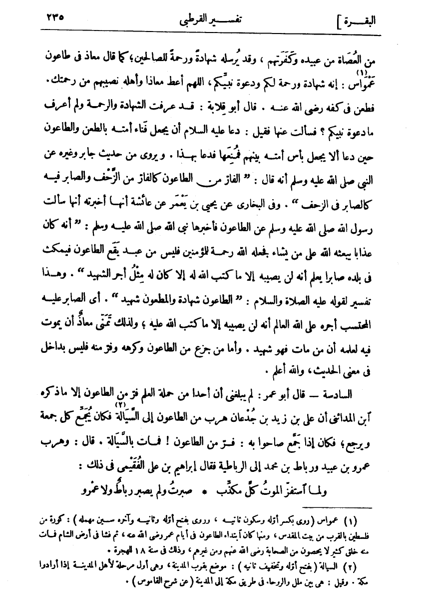 مِنَ الْعُصَاةِ مِنْ عَبِيدِهِ وَكَفَرَتِهِمْ، وَقَدْ يُرْسِلُهُ شَهَادَةً وَرَحْمَةً لِلصَّالِحِينَ، كَمَا قَالَ مُعَاذٌ فِي طَاعُونِ عَمْوَاسَ «١»: إِنَّهُ شَهَادَةٌ وَرَحْمَةٌ لَكُمْ وَدَعْوَةُ نَبِيِّكُمُ، اللَّهُمَّ أَعْطِ مُعَاذًا وَأَهْلَهُ نَصِيبَهُمْ مِنْ رَحْمَتِكَ. فَطُعِنَ فِي كَفِّهِ رَضِيَ اللَّهُ عَنْهُ. قَالَ أَبُو قِلَابَةَ: قَدْ عَرَفْتُ الشَّهَادَةَ وَالرَّحْمَةَ وَلَمْ أَعْرِفْ مَا دَعْوَةُ نَبِيِّكُمْ؟ فَسَأَلْتُ عَنْهَا فَقِيلَ: دَعَا عَلَيْهِ السَّلَامُ أَنْ يُجْعَلَ فَنَاءُ أُمَّتِهِ بِالطَّعْنِ وَالطَّاعُونِ حِينَ دَعَا أَلَّا يُجْعَلَ بَأْسُ أُمَّتِهِ بَيْنَهُمْ فَمُنِعَهَا فَدَعَا بِهَذَا. وَيُرْوَى مِنْ حَدِيثِ جَابِرٍ وَغَيْرُهُ عَنِ النَّبِيِّ صَلَّى اللَّهُ عَلَيْهِ وَسَلَّمَ أَنَّهُ قَالَ:" الْفَارُّ مِنَ الطَّاعُونِ كَالْفَارِّ مِنَ الزَّحْفِ وَالصَّابِرُ فِيهِ كَالصَّابِرِ فِي الزَّحْفِ". وَفِي الْبُخَارِيِّ عَنْ يَحْيَى بْنِ يَعْمَرَ عَنْ عَائِشَةَ أَنَّهَا أَخْبَرَتْهُ أَنَّهَا سَأَلَتْ رَسُولَ اللَّهِ صَلَّى اللَّهُ عَلَيْهِ وَسَلَّمَ عَنْ الطَّاعُونِ فَأَخْبَرَهَا نَبِيُّ اللَّهِ صَلَّى اللَّهُ عَلَيْهِ وَسَلَّمَ:" أَنَّهُ كَانَ عَذَابًا يَبْعَثُهُ اللَّهُ عَلَى مَنْ يَشَاءُ فَجَعَلَهُ اللَّهُ رَحْمَةً لِلْمُؤْمِنِينَ فَلَيْسَ مِنْ عَبْدٍ يَقَعُ الطَّاعُونُ فَيَمْكُثُ فِي بَلَدِهِ صَابِرًا يَعْلَمُ أَنَّهُ لَنْ يُصِيبَهُ إِلَّا مَا كتب الله له إلا كان له مثله أَجْرِ الشَّهِيدِ". وَهَذَا تَفْسِيرٌ لِقَوْلِهِ عَلَيْهِ الصَّلَاةُ وَالسَّلَامُ:" الطَّاعُونُ شَهَادَةٌ وَالْمَطْعُونُ شَهِيدٌ". أَيِ الصَّابِرُ عَلَيْهِ الْمُحْتَسِبُ أَجْرَهُ عَلَى اللَّهِ الْعَالِمُ أَنَّهُ لَنْ يُصِيبَهُ إِلَّا مَا كَتَبَ اللَّهُ عَلَيْهِ، وَلِذَلِكَ تَمَنَّى مُعَاذٌ أَنْ يَمُوتَ فِيهِ لِعِلْمِهِ أَنَّ مَنْ مَاتَ فَهُوَ شَهِيدٌ. وَأَمَّا مَنْ جَزِعَ مِنَ الطَّاعُونِ وَكَرِهَهُ وَفَرَّ مِنْهُ فَلَيْسَ بِدَاخِلٍ فِي مَعْنَى الْحَدِيثِ، وَاللَّهُ أَعْلَمُ. السَّادِسَةُ- قَالَ أَبُو عُمَرَ: لَمْ يَبْلُغْنِي أَنَّ أَحَدًا مِنْ حَمَلَةِ الْعِلْمِ فَرَّ مِنَ الطَّاعُونِ إِلَّا مَا ذَكَرَهُ ابْنُ الْمَدَائِنِيِّ أَنَّ عَلِيَّ بْنَ زَيْدِ بْنِ جُدْعَانَ هَرَبَ مِنَ الطَّاعُونِ إِلَى السَّيَالَةِ «٢» فَكَانَ يُجَمِّعُ كُلَّ جُمُعَةٍ وَيَرْجِعُ، فَكَانَ إِذَا جَمَّعَ صَاحُوا بِهِ: فَرَّ مِنَ الطَّاعُونِ! فَمَاتَ بِالسَّيَالَةِ. قَالَ: وَهَرَبَ عَمْرُو بْنُ عُبَيْدٍ وَرِبَاطُ بْنُ مُحَمَّدٍ إِلَى الرِّبَاطِيَّةِ فَقَالَ إِبْرَاهِيمُ بْنُ عَلِيٍّ الْفُقَيْمِيُّ فِي ذَلِكَ: