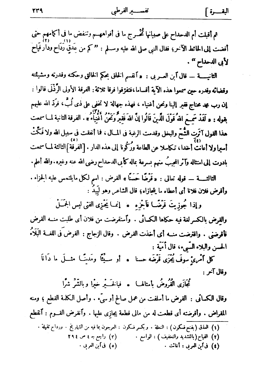 ثُمَّ أَقْبَلَتْ أُمُّ الدَّحْدَاحِ عَلَى صِبْيَانِهَا تُخْرِجُ مَا فِي أَفْوَاهِهِمْ وَتُنَفِّضُ مَا فِي أَكْمَامِهِمْ حَتَّى أَفْضَتْ إِلَى الْحَائِطِ الْآخَرِ، فَقَالَ النَّبِيُّ صَلَّى اللَّهُ عَلَيْهِ وَسَلَّمَ:" كَمْ مِنْ عِذْقٍ «١» رَدَاحٍ وَدَارٍ «٢» فَيَّاحٍ لِأَبِي الدَّحْدَاحِ". الثَّانِيَةُ- قَالَ ابْنُ الْعَرَبِيِّ:" انْقَسَمَ الْخَلْقُ بِحُكْمِ الْخَالِقِ وَحِكْمَتِهِ وَقُدْرَتِهِ وَمَشِيئَتِهِ وَقَضَائِهِ وَقَدَرِهِ حِينَ سَمِعُوا هَذِهِ الْآيَةَ أَقْسَامًا، فَتَفَرَّقُوا فِرَقًا ثَلَاثَةً: الْفِرْقَةُ الْأُولَى الرَّذْلَى قَالُوا: إِنَّ رَبَّ مُحَمَّدٍ مُحْتَاجٌ فَقِيرٌ إِلَيْنَا وَنَحْنُ أَغْنِيَاءُ، فَهَذِهِ جَهَالَةٌ لَا تَخْفَى عَلَى ذِي لُبٍّ، فَرَدَّ اللَّهُ عَلَيْهِمْ بِقَوْلِهِ:" لَقَدْ سَمِعَ اللَّهُ قَوْلَ الَّذِينَ قالُوا إِنَّ اللَّهَ فَقِيرٌ وَنَحْنُ أَغْنِياءُ «٣» ". الْفِرْقَةُ الثَّانِيَةُ لَمَّا سَمِعَتْ هَذَا الْقَوْلَ آثَرَتِ الشُّحَّ وَالْبُخْلَ وَقَدَّمَتِ الرَّغْبَةَ فِي الْمَالِ، فَمَا أَنْفَقَتْ فِي سَبِيلِ اللَّهِ وَلَا فَكَّتْ أَسِيرًا وَلَا أَعَانَتْ «٤» أَحَدًا، تَكَاسُلًا عَنِ الطَّاعَةِ وَرُكُونًا إِلَى هَذِهِ الدَّارِ. [الْفِرْقَةُ «٥»] الثَّالِثَةُ لَمَّا سَمِعَتْ بَادَرَتْ إِلَى امْتِثَالِهِ وَآثَرَ الْمُجِيبُ مِنْهُمْ بِسُرْعَةٍ بِمَالِهِ كَأَبِي الدَّحْدَاحِ رَضِيَ اللَّهُ عَنْهُ وَغَيْرُهُ. وَاللَّهُ أَعْلَمُ. الثَّالِثَةُ- قوله تعالى: (قَرْضاً حَسَناً) الْقَرْضُ: اسْمٌ لِكُلِّ مَا يُلْتَمَسُ عَلَيْهِ الْجَزَاءُ. وَأَقْرَضَ فُلَانٌ فُلَانًا أَيْ أَعْطَاهُ مَا يَتَجَازَاهُ، قَالَ الشَّاعِرُ وَهُوَ لَبِيَدٌ: