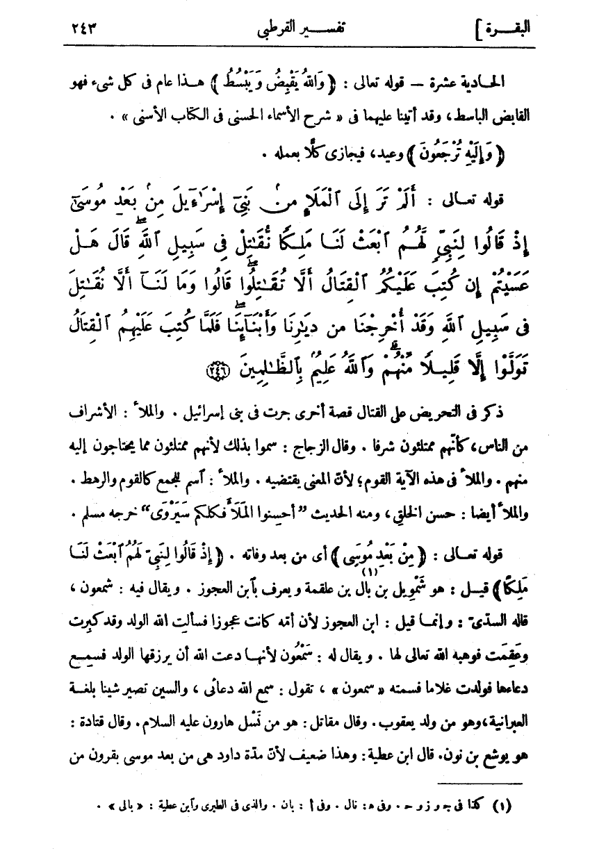 أَلَمْ تَرَ إِلَى الْمَلَإِ مِنْ بَنِي إِسْرائِيلَ مِنْ بَعْدِ مُوسى إِذْ قالُوا لِنَبِيٍّ لَهُمُ ابْعَثْ لَنا مَلِكاً نُقاتِلْ فِي سَبِيلِ اللَّهِ قالَ هَلْ عَسَيْتُمْ إِنْ كُتِبَ عَلَيْكُمُ الْقِتالُ أَلاَّ تُقاتِلُوا قالُوا وَما لَنا أَلاَّ نُقاتِلَ فِي سَبِيلِ اللَّهِ وَقَدْ أُخْرِجْنا مِنْ دِيارِنا وَأَبْنائِنا فَلَمَّا كُتِبَ عَلَيْهِمُ الْقِتالُ تَوَلَّوْا إِلاَّ قَلِيلاً مِنْهُمْ وَاللَّهُ عَلِيمٌ بِالظَّالِمِينَ (٢٤٦)