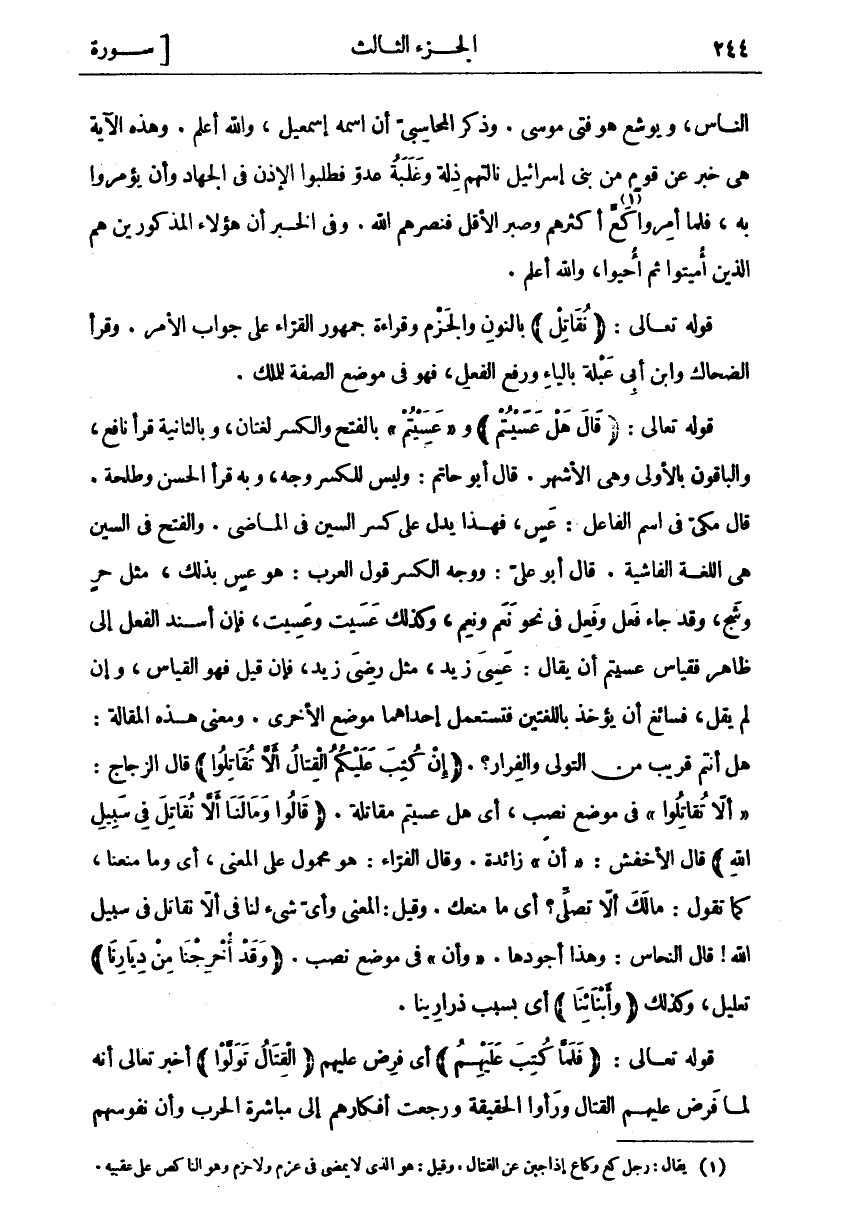 النَّاسِ، وَيُوشَعُ هُوَ فَتَى مُوسَى. وَذَكَرَ الْمُحَاسِبِيُّ أَنَّ اسْمَهُ إِسْمَاعِيلُ، وَاللَّهُ أَعْلَمُ. وَهَذِهِ الْآيَةُ هِيَ خَبَرٌ عَنْ قَوْمٍ مِنْ بَنِي إِسْرَائِيلَ نَالَتْهُمْ ذِلَّةٌ وَغَلَبَةُ عَدُوٍّ فَطَلَبُوا الْإِذْنَ فِي الْجِهَادِ وَأَنْ يُؤْمَرُوا بِهِ، فَلَمَّا أُمِرُوا كَعَّ «١» أَكْثَرُهُمْ وَصَبَرَ الْأَقَلُّ فَنَصَرَهُمُ اللَّهُ. وَفِي الْخَبَرِ أَنَّ هَؤُلَاءِ الْمَذْكُورِينَ هُمُ الَّذِينَ أُمِيتُوا ثُمَّ أُحْيُوا، وَاللَّهُ أَعْلَمُ. قَوْلُهُ تَعَالَى: (نُقاتِلْ) بِالنُّونِ وَالْجَزْمِ وَقِرَاءَةُ جُمْهُورِ الْقُرَّاءِ عَلَى جَوَابِ الْأَمْرِ. وَقَرَأَ الضَّحَّاكُ وَابْنُ أَبِي عَبْلَةَ بِالْيَاءِ وَرَفْعِ الْفِعْلِ، فَهُوَ فِي مَوْضِعِ الصِّفَةِ لِلْمَلِكِ. قَوْلُهُ تعالى: (قالَ هَلْ عَسَيْتُمْ) و" عَسَيْتُمْ" بِالْفَتْحِ وَالْكَسْرِ لُغَتَانِ، وَبِالثَّانِيَةِ قَرَأَ نَافِعٌ، وَالْبَاقُونَ بِالْأُولَى وَهِيَ الْأَشْهَرُ. قَالَ أَبُو حَاتِمٍ: وَلَيْسَ لِلْكَسْرِ وَجْهٌ، وَبِهِ قَرَأَ الْحَسَنُ وَطَلْحَةُ. قَالَ مَكِّيٌّ فِي اسْمِ الْفَاعِلِ: عَسٍ، فَهَذَا يَدُلُّ عَلَى كَسْرِ السِّينِ فِي الْمَاضِي. وَالْفَتْحُ فِي السِّينِ هِيَ اللُّغَةُ الْفَاشِيَةُ. قَالَ أَبُو عَلِيٍّ: وَوَجْهُ الْكَسْرِ قَوْلُ الْعَرَبِ: هُوَ عَسٍ بِذَلِكَ، مِثْلَ حَرٍ وَشَجٍ، وَقَدْ جَاءَ فَعَلَ وَفَعِلَ فِي نَحْوِ نَعَمَ وَنَعِمَ، وَكَذَلِكَ عَسَيْتُ وَعَسِيتُ، فَإِنْ أُسْنِدَ الْفِعْلُ إِلَى ظَاهِرٍ فَقِيَاسُ عَسَيْتُمْ أَنْ يُقَالَ: عَسِيَ زَيْدٌ، مِثْلَ رَضِيَ زَيْدٌ، فَإِنْ قِيلَ فَهُوَ الْقِيَاسُ، وَإِنْ لَمْ يُقَلْ، فَسَائِغٌ أَنْ يُؤْخَذَ بِاللُّغَتَيْنِ فَتُسْتَعْمَلُ إِحْدَاهُمَا مَوْضِعَ الْأُخْرَى. وَمَعْنَى هَذِهِ الْمَقَالَةِ: هَلْ أَنْتُمْ قَرِيبٌ مِنَ التَّوَلِّي وَالْفِرَارِ؟. (إِنْ كُتِبَ عَلَيْكُمُ الْقِتالُ أَلَّا تُقاتِلُوا) قَالَ الزَّجَّاجُ:" أَلَّا تُقاتِلُوا" فِي مَوْضِعِ نَصْبٍ، أَيْ هَلْ عَسَيْتُمْ مُقَاتَلَةً. (قالُوا وَما لَنا أَلَّا نُقاتِلَ فِي سَبِيلِ اللَّهِ) قَالَ الْأَخْفَشُ:" أَنْ" زَائِدَةٌ. وَقَالَ الْفَرَّاءُ: هُوَ مَحْمُولٌ عَلَى الْمَعْنَى، أَيْ وَمَا مَنَعَنَا، كَمَا تَقُولُ: مَا لَكَ أَلَّا تُصَلِّيَ؟ أَيْ ما منعك. وقيل: المعنى وأى شي لَنَا فِي أَلَّا نُقَاتِلَ فِي سَبِيلِ اللَّهِ! قال النحاس: وهذا أجودها." وأن" فِي مَوْضِعِ نَصْبٍ. (وَقَدْ أُخْرِجْنا مِنْ دِيارِنا) تَعْلِيلٌ، وَكَذَلِكَ (وَأَبْنائِنا) أَيْ بِسَبَبِ ذَرَارِينَا. قَوْلُهُ تَعَالَى: (فَلَمَّا كُتِبَ عَلَيْهِمُ) أَيْ فُرِضَ عَلَيْهِمْ (الْقِتالُ تَوَلَّوْا) أَخْبَرَ تَعَالَى أَنَّهُ لَمَّا فَرَضَ عَلَيْهِمُ الْقِتَالَ وَرَأَوُا الْحَقِيقَةَ وَرَجَعَتْ أَفْكَارُهُمْ إِلَى مباشرة الحرب وأن نفوسهم