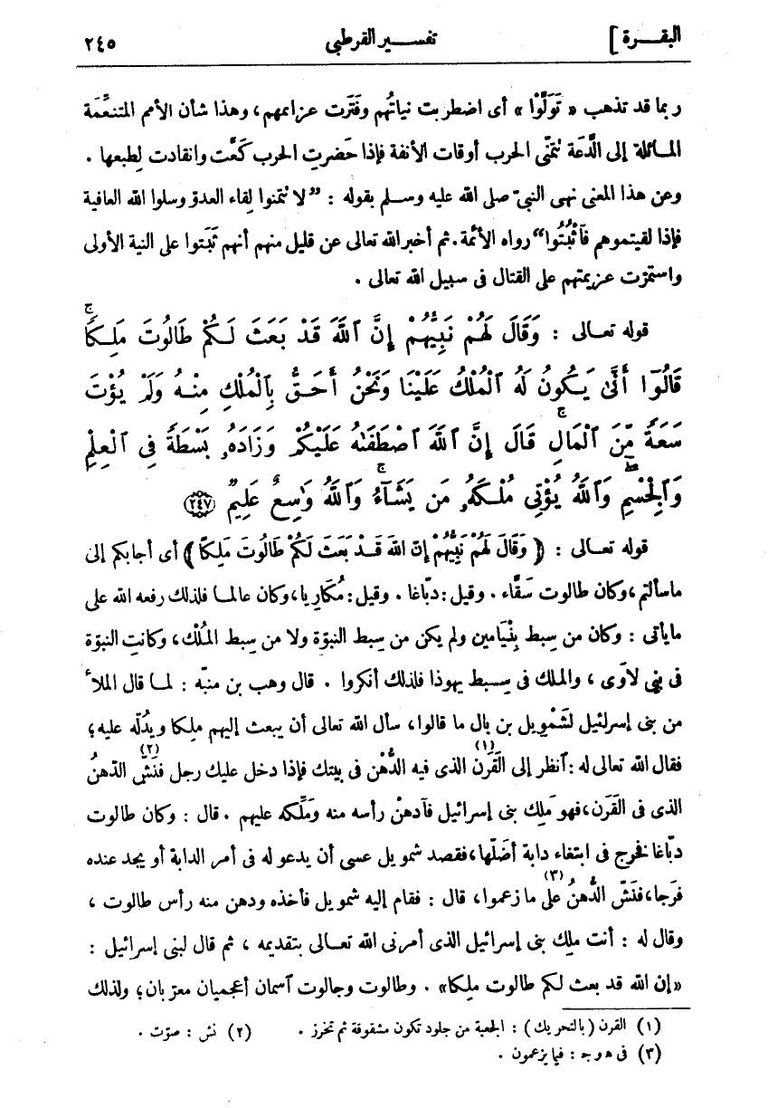 قَوْلُهُ تَعَالَى: (وَقالَ لَهُمْ نَبِيُّهُمْ إِنَّ اللَّهَ قَدْ بَعَثَ لَكُمْ طالُوتَ مَلِكاً) أَيْ أَجَابَكُمْ إِلَى مَا سَأَلْتُمْ، وَكَانَ طَالُوتُ سَقَّاءً. وَقِيلَ: دَبَّاغًا. وَقِيلَ: مُكَارِيًا، وَكَانَ عَالِمًا فَلِذَلِكَ رَفَعَهُ اللَّهُ عَلَى مَا يَأْتِي: وَكَانَ مِنْ سِبْطِ بِنْيَامِينَ وَلَمْ يَكُنْ مِنْ سِبْطِ النُّبُوَّةِ وَلَا مِنْ سِبْطِ الْمُلْكِ، وَكَانَتِ النُّبُوَّةُ فِي بَنِي لَاوَى، وَالْمُلْكُ فِي سِبْطِ يَهُوذَا فَلِذَلِكَ أَنْكَرُوا. قَالَ وَهْبُ بْنُ مُنَبِّهٍ: لَمَّا قَالَ الْمَلَأُ مِنْ بَنِي إِسْرَائِيلَ لِشَمْوِيلَ بْنِ بَالَ مَا قَالُوا، سَأَلَ اللَّهَ تَعَالَى أَنْ يَبْعَثَ إِلَيْهِمْ مَلِكًا وَيَدُلَّهُ عَلَيْهِ، فَقَالَ اللَّهُ تَعَالَى لَهُ: انْظُرْ إِلَى الْقَرَنِ «١» الَّذِي فِيهِ الدُّهْنُ فِي بَيْتِكَ فَإِذَا دَخَلَ عَلَيْكَ رَجُلٌ فَنَشَّ «٢» الدُّهْنَ الَّذِي فِي الْقَرَنِ، فَهُوَ مَلِكُ بَنِي إِسْرَائِيلَ فَادْهُنْ رَأْسَهُ مِنْهُ وَمَلِّكْهُ عَلَيْهِمْ. قَالَ: وَكَانَ طَالُوتُ دَبَّاغًا فَخَرَجَ فِي ابْتِغَاءِ دَابَّةٍ أَضَلَّهَا، فَقَصَدَ شَمْوِيلَ عَسَى أَنْ يَدْعُوَ لَهُ فِي أَمْرِ الدَّابَّةِ أَوْ يَجِدَ عِنْدَهُ فَرَجًا، فَنَشَّ الدُّهْنَ عَلَى «٣» مَا زَعَمُوا، قَالَ: فَقَامَ إِلَيْهِ شَمْوِيلُ فَأَخَذَهُ وَدَهَنَ مِنْهُ رَأْسَ طَالُوتَ، وَقَالَ لَهُ: أَنْتَ مَلِكُ بَنِي إِسْرَائِيلَ الَّذِي أَمَرَنِي اللَّهُ تَعَالَى بِتَقْدِيمِهِ، ثُمَّ قَالَ لِبَنِي إِسْرَائِيلَ:" إِنَّ اللَّهَ قَدْ بَعَثَ لَكُمْ طالُوتَ مَلِكاً". وَطَالُوتُ وَجَالُوتُ اسْمَانِ أَعْجَمِيَّانِ مُعَرَّبَانِ، وَلِذَلِكَ