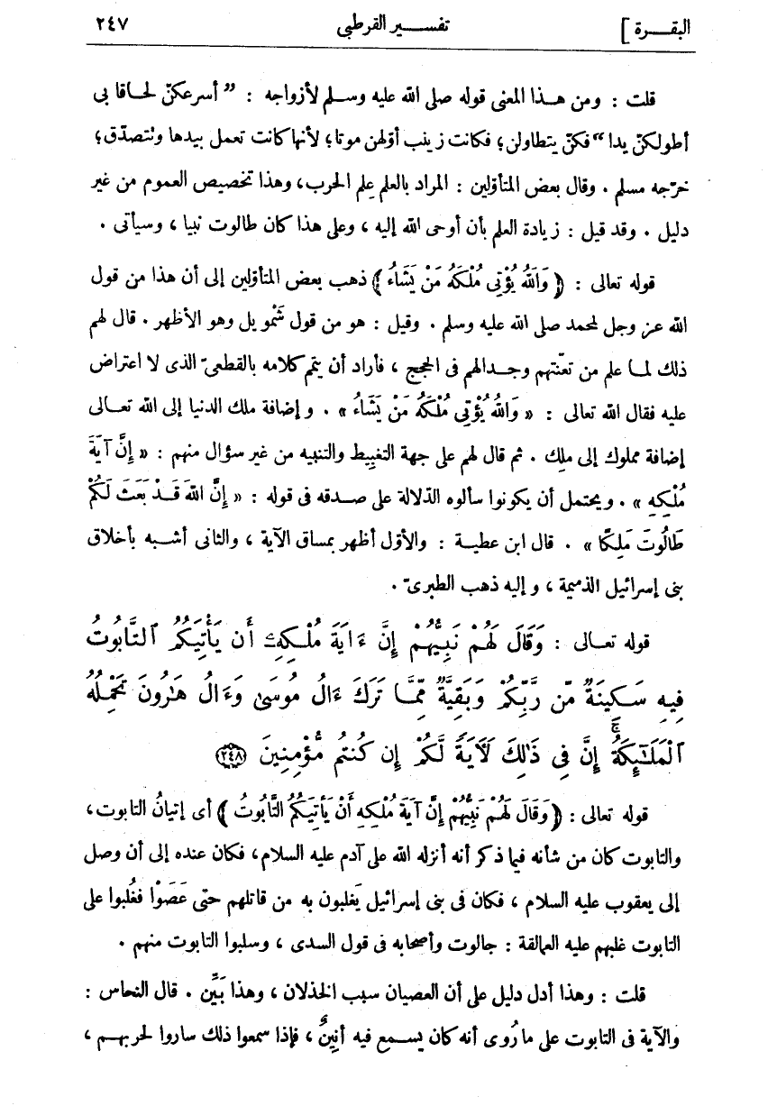 قُلْتُ: وَمِنْ هَذَا الْمَعْنَى قَوْلُهُ صَلَّى اللَّهُ عَلَيْهِ وَسَلَّمَ لِأَزْوَاجِهِ:" أَسْرَعُكُنَّ لَحَاقًا بِي أَطْوَلُكُنَّ يَدًا" فَكُنَّ يَتَطَاوَلْنَ، فَكَانَتْ زَيْنَبُ أَوَّلَهُنَّ مَوْتًا، لِأَنَّهَا كَانَتْ تَعْمَلُ بِيَدِهَا وَتَتَصَدَّقُ، خَرَّجَهُ مُسْلِمٌ. وَقَالَ بَعْضُ الْمُتَأَوِّلِينَ: الْمُرَادُ بِالْعِلْمِ عِلْمُ الْحَرْبِ، وَهَذَا تَخْصِيصُ الْعُمُومِ مِنْ غَيْرِ دَلِيلٍ. وَقَدْ قِيلَ: زِيَادَةُ الْعِلْمِ بِأَنْ أَوْحَى اللَّهُ إِلَيْهِ، وَعَلَى هَذَا كَانَ طَالُوتُ نَبِيًّا، وَسَيَأْتِي. قَوْلُهُ تَعَالَى: (وَاللَّهُ يُؤْتِي مُلْكَهُ مَنْ يَشاءُ) ذَهَبَ بَعْضُ الْمُتَأَوِّلِينَ إِلَى أَنَّ هَذَا مِنْ قَوْلِ الله عز وجل لمحمد صَلَّى اللَّهُ عَلَيْهِ وَسَلَّمَ. وَقِيلَ: هُوَ مِنْ قَوْلِ شَمْوِيلَ وَهُوَ الْأَظْهَرُ. قَالَ لَهُمْ ذَلِكَ لِمَا عَلِمَ مِنْ تَعَنُّتِهِمْ وَجِدَالِهِمْ فِي الْحُجَجِ، فَأَرَادَ أَنْ يُتْمِمَ كَلَامَهُ بِالْقَطْعِيِّ الَّذِي لَا اعْتِرَاضَ عَلَيْهِ فَقَالَ اللَّهُ تَعَالَى:" وَاللَّهُ يُؤْتِي مُلْكَهُ مَنْ يَشاءُ". وَإِضَافَةُ مُلْكِ الدُّنْيَا إِلَى اللَّهِ تَعَالَى إِضَافَةُ مَمْلُوكٍ إِلَى مَلِكٍ. ثُمَّ قَالَ لَهُمْ عَلَى جِهَةِ التَّغْبِيطِ وَالتَّنْبِيهِ مِنْ غَيْرِ سُؤَالٍ مِنْهُمْ:" إِنَّ آيَةَ مُلْكِهِ". وَيُحْتَمَلُ أَنْ يَكُونُوا سَأَلُوهُ الدَّلَالَةَ عَلَى صِدْقِهِ فِي قَوْلِهِ:" إِنَّ اللَّهَ قَدْ بَعَثَ لَكُمْ طالُوتَ مَلِكاً". قَالَ ابْنُ عَطِيَّةَ: وَالْأَوَّلُ أَظْهَرُ بِمَسَاقِ الْآيَةِ، وَالثَّانِي أَشْبَهُ بِأَخْلَاقِ بَنِي إِسْرَائِيلَ الذَّمِيمَةِ، وَإِلَيْهِ ذَهَبَ الطَّبَرِيُّ.