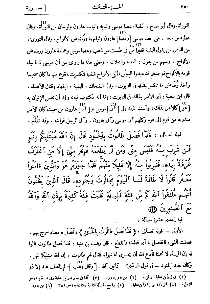 فَلَمَّا فَصَلَ طالُوتُ بِالْجُنُودِ قالَ إِنَّ اللَّهَ مُبْتَلِيكُمْ بِنَهَرٍ فَمَنْ شَرِبَ مِنْهُ فَلَيْسَ مِنِّي وَمَنْ لَمْ يَطْعَمْهُ فَإِنَّهُ مِنِّي إِلاَّ مَنِ اغْتَرَفَ غُرْفَةً بِيَدِهِ فَشَرِبُوا مِنْهُ إِلاَّ قَلِيلاً مِنْهُمْ فَلَمَّا جاوَزَهُ هُوَ وَالَّذِينَ آمَنُوا مَعَهُ قالُوا لَا طاقَةَ لَنَا الْيَوْمَ بِجالُوتَ وَجُنُودِهِ قالَ الَّذِينَ يَظُنُّونَ أَنَّهُمْ مُلاقُوا اللَّهِ كَمْ مِنْ فِئَةٍ قَلِيلَةٍ غَلَبَتْ فِئَةً كَثِيرَةً بِإِذْنِ اللَّهِ وَاللَّهُ مَعَ الصَّابِرِينَ (٢٤٩)