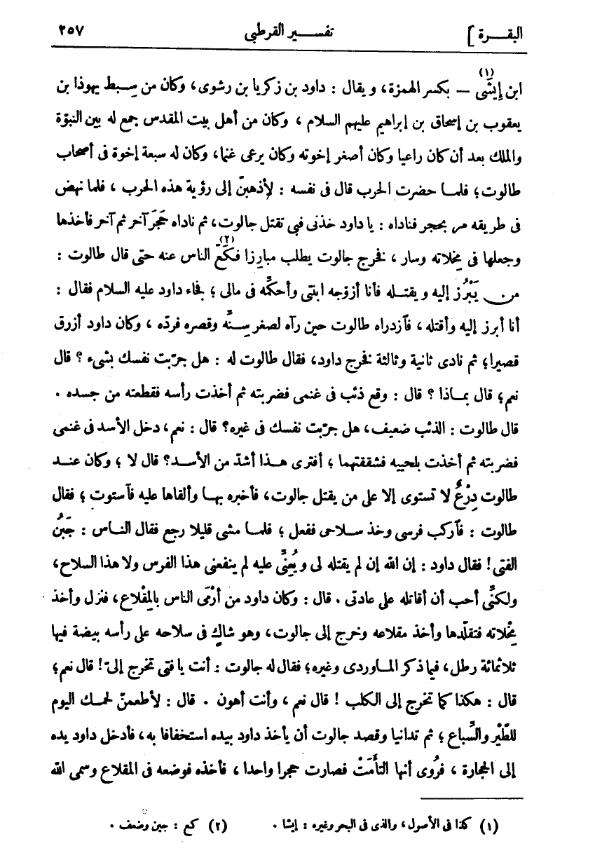 ابن إِيشَى «١» - بِكَسْرِ الْهَمْزَةِ، وَيُقَالُ: دَاوُدُ بْنُ زَكَرِيَّا بْنِ رَشْوَى، وَكَانَ مِنْ سِبْطِ يَهُوذَا بْنِ يَعْقُوبُ بْنُ إِسْحَاقَ بْنِ إِبْرَاهِيمَ عَلَيْهِمُ السَّلَامُ، وَكَانَ مِنْ أَهْلِ بَيْتِ الْمَقْدِسِ جُمِعَ لَهُ بَيْنَ النُّبُوَّةِ وَالْمُلْكِ بَعْدَ أَنْ كَانَ رَاعِيًا وَكَانَ أَصْغَرَ إِخْوَتِهِ وَكَانَ يَرْعَى غَنَمًا، وَكَانَ لَهُ سَبْعَةُ إِخْوَةٍ فِي أَصْحَابِ طَالُوتَ، فَلَمَّا حَضَرَتِ الْحَرْبُ قَالَ فِي نَفْسِهِ: لَأَذْهَبَنَّ إِلَى رُؤْيَةِ هَذِهِ الْحَرْبِ، فَلَمَّا نَهَضَ فِي طَرِيقِهِ مَرَّ بِحَجَرٍ فَنَادَاهُ: يَا دَاوُدُ خُذْنِي فَبِي تَقْتُلُ جَالُوتَ، ثُمَّ نَادَاهُ حَجَرٌ آخَرُ ثُمَّ آخَرُ فَأَخَذَهَا وَجَعَلَهَا فِي مِخْلَاتِهِ وَسَارَ، فَخَرَجَ جَالُوتُ يَطْلُبُ مُبَارِزًا فَكَعَّ «٢» النَّاسُ عَنْهُ حَتَّى قَالَ طَالُوتُ: مَنْ يَبْرُزُ إِلَيْهِ وَيَقْتُلُهُ فَأَنَا أُزَوِّجُهُ ابْنَتِي وَأُحَكِّمُهُ فِي مَالِيَ، فَجَاءَ دَاوُدُ عَلَيْهِ السَّلَامُ فَقَالَ: أَنَا أَبْرُزُ إِلَيْهِ وَأَقْتُلُهُ، فَازْدَرَاهُ طَالُوتُ حِينَ رَآهُ لِصِغَرِ سِنِّهِ وَقِصَرِهِ فَرَدَّهُ، وَكَانَ دَاوُدُ أَزْرَقَ قَصِيرًا، ثُمَّ نَادَى ثَانِيَةً وَثَالِثَةً فَخَرَجَ دَاوُدُ، فَقَالَ طَالُوتُ لَهُ: هَلْ جَرَّبْتَ نَفْسَكَ بِشَيْءٍ؟ قَالَ نَعَمْ، قَالَ بماذا؟ قَالَ: وَقَعَ ذِئْبٌ فِي غَنَمِي فَضَرَبْتُهُ ثُمَّ أَخَذْتُ رَأْسَهُ فَقَطَعْتُهُ مِنْ جَسَدِهِ. قَالَ طَالُوتُ: الذِّئْبُ ضَعِيفٌ، هَلْ جَرَّبْتَ نَفْسَكَ فِي غَيْرِهِ؟ قَالَ: نَعَمْ، دَخَلَ الْأَسَدُ فِي غَنَمِي فَضَرَبْتُهُ ثُمَّ أَخَذْتُ بِلَحْيَيْهِ فَشَقَقْتُهُمَا، أَفَتَرَى هَذَا أَشَدَّ مِنَ الْأَسَدِ؟ قَالَ لَا، وَكَانَ عِنْدَ طَالُوتَ دِرْعٌ لَا تَسْتَوِي إِلَّا عَلَى مَنْ يَقْتُلُ جَالُوتَ، فَأَخْبَرَهُ بِهَا وَأَلْقَاهَا عَلَيْهِ فَاسْتَوَتْ، فَقَالَ طَالُوتُ: فَارْكَبْ فَرَسِي وَخُذْ سِلَاحِي فَفَعَلَ، فَلَمَّا مَشَى قَلِيلًا رَجَعَ فَقَالَ النَّاسُ: جَبُنَ الْفَتَى! فَقَالَ دَاوُدُ: إِنَّ اللَّهَ إِنْ لَمْ يَقْتُلْهُ لِي وَيُعِنِّي عَلَيْهِ لَمْ يَنْفَعْنِي هَذَا الْفَرَسُ وَلَا هَذَا السِّلَاحُ، وَلَكِنِّي أُحِبُّ أَنْ أُقَاتِلَهُ عَلَى عَادَتِي. قَالَ: وَكَانَ دَاوُدُ مِنْ أَرْمَى النَّاسِ بِالْمِقْلَاعِ، فَنَزَلَ وَأَخَذَ مِخْلَاتَهُ فَتَقَلَّدَهَا وَأَخَذَ مِقْلَاعَهُ وَخَرَجَ إِلَى جَالُوتَ، وَهُوَ شَاكٍ فِي سِلَاحِهِ عَلَى رَأْسِهِ بَيْضَةٌ فِيهَا ثَلَاثُمِائَةِ رِطْلٍ، فِيمَا ذَكَرَ الْمَاوَرْدِيُّ وَغَيْرُهُ، فَقَالَ لَهُ جَالُوتُ: أَنْتَ يَا فَتَى تَخْرُجُ إِلَيَّ! قَالَ نَعَمْ، قَالَ: هَكَذَا كَمَا تَخْرُجُ إِلَى الْكَلْبِ! قَالَ نَعَمْ، وَأَنْتَ أَهْوَنُ. قَالَ: لَأُطْعِمَنَّ لَحْمَكَ الْيَوْمَ لِلطَّيْرِ وَالسِّبَاعِ، ثُمَّ تَدَانَيَا وَقَصَدَ جَالُوتُ أَنْ يَأْخُذَ دَاوُدَ بِيَدِهِ اسْتِخْفَافًا بِهِ، فَأَدْخَلَ دَاوُدُ يَدَهُ إِلَى الْحِجَارَةِ، فَرُوِيَ أَنَّهَا الْتَأَمَتْ فَصَارَتْ حَجَرًا وَاحِدًا، فَأَخَذَهُ فَوَضَعَهُ فِي الْمِقْلَاعِ وَسَمَّى الله