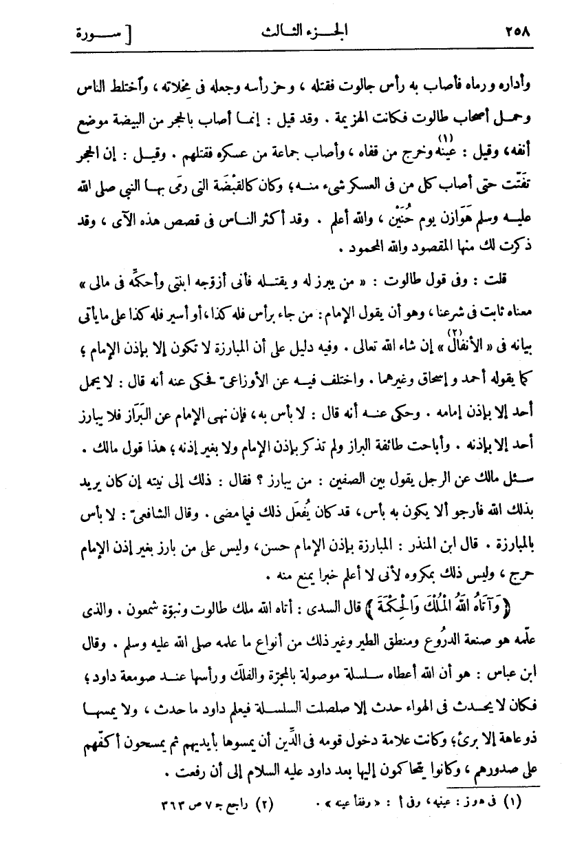 وَأَدَارَهُ وَرَمَاهُ فَأَصَابَ بِهِ رَأْسَ جَالُوتَ فَقَتَلَهُ، وَحَزَّ رَأْسَهُ وَجَعَلَهُ فِي مِخْلَاتِهِ، وَاخْتَلَطَ النَّاسُ وحمله أَصْحَابُ طَالُوتَ فَكَانَتِ الْهَزِيمَةُ. وَقَدْ قِيلَ: إِنَّمَا أَصَابَ بِالْحَجَرِ مِنَ الْبَيْضَةِ مَوْضِعَ أَنْفِهِ، وَقِيلَ: عَيْنَهُ «١» وَخَرَجَ مِنْ قَفَاهُ، وَأَصَابَ جَمَاعَةً مِنْ عَسْكَرِهِ فَقَتَلَهُمْ. وَقِيلَ: إِنَّ الْحَجَرَ تَفَتَّتَ حَتَّى أصاب كل من في العسكر شي مِنْهُ، وَكَانَ كَالْقَبْضَةِ الَّتِي رَمَى بِهَا النَّبِيُّ صَلَّى اللَّهُ عَلَيْهِ وَسَلَّمَ هَوَازِنَ يَوْمَ حُنَيْنٍ، وَاللَّهُ أَعْلَمُ. وَقَدْ أَكْثَرَ النَّاسُ فِي قِصَصِ هَذِهِ الْآيِ، وَقَدْ ذَكَرْتُ لَكَ مِنْهَا الْمَقْصُودَ وَاللَّهُ الْمَحْمُودُ. قُلْتُ: وَفِي قَوْلِ طَالُوتَ:" مَنْ يَبْرُزْ لَهُ وَيَقْتُلْهُ فَإِنِّي أُزَوِّجْهُ ابْنَتِي وَأُحَكِّمْهُ فِي مَالِيَ" مَعْنَاهُ ثَابِتٌ فِي شَرْعِنَا، وَهُوَ أَنْ يَقُولُ الْإِمَامُ: مَنْ جَاءَ بِرَأْسٍ فَلَهُ كَذَا، أَوْ أَسِيرٍ فَلَهُ كَذَا عَلَى مَا يَأْتِي بَيَانُهُ فِي" الْأَنْفَالِ «٢» " إِنْ شَاءَ اللَّهُ تَعَالَى. وَفِيهِ دَلِيلٌ عَلَى أَنَّ الْمُبَارَزَةَ لَا تَكُونُ إِلَّا بِإِذْنِ الْإِمَامِ، كَمَا يَقُولُهُ أَحْمَدُ وَإِسْحَاقُ وَغَيْرُهُمَا. وَاخْتُلِفَ فِيهِ عَنِ الْأَوْزَاعِيِّ فَحُكِيَ عَنْهُ أَنَّهُ قَالَ: لَا يَحْمِلُ أَحَدٌ إِلَّا بِإِذْنِ إِمَامِهِ. وَحُكِيَ عَنْهُ أَنَّهُ قَالَ: لَا بَأْسَ بِهِ، فَإِنْ نَهَى الْإِمَامُ عَنِ الْبَرَازِ فَلَا يُبَارِزُ أَحَدٌ إِلَّا بِإِذْنِهِ. وَأَبَاحَتْ طَائِفَةٌ الْبَرَازَ وَلَمْ تَذْكُرْ بِإِذْنِ الْإِمَامِ وَلَا بِغَيْرِ إِذْنِهِ، هَذَا قَوْلُ مَالِكٍ. سُئِلَ مَالِكٌ عَنِ الرَّجُلِ يَقُولُ بَيْنَ الصَّفَّيْنِ: مَنْ يُبَارِزُ؟ فَقَالَ: ذَلِكَ إِلَى نِيَّتِهِ إِنْ كَانَ يُرِيدُ بِذَلِكَ اللَّهَ فَأَرْجُو أَلَّا يَكُونَ بِهِ بَأْسٌ، قَدْ كَانَ يُفْعَلُ ذَلِكَ فِيمَا مَضَى. وَقَالَ الشَّافِعِيُّ: لَا بَأْسَ بِالْمُبَارَزَةِ. قَالَ ابْنُ الْمُنْذِرِ: الْمُبَارَزَةُ بِإِذْنِ الْإِمَامِ حَسَنٌ، وَلَيْسَ عَلَى مَنْ بَارَزَ بِغَيْرِ إِذْنِ الْإِمَامِ حَرَجٌ، وَلَيْسَ ذَلِكَ بِمَكْرُوهٍ لِأَنِّي لَا أَعْلَمُ خَبَرًا يَمْنَعُ مِنْهُ. (وَآتاهُ اللَّهُ الْمُلْكَ وَالْحِكْمَةَ) قَالَ السُّدِّيُّ: أَتَاهُ اللَّهُ مُلْكَ طَالُوتَ وَنُبُوَّةَ شَمْعُونَ. وَالَّذِي عَلَّمَهُ هُوَ صَنْعَةُ الدُّرُوعِ وَمَنْطِقُ الطَّيْرِ وَغَيْرُ ذَلِكَ مِنْ أَنْوَاعٍ مَا عَلَّمَهُ صَلَّى اللَّهُ عَلَيْهِ وَسَلَّمَ. وَقَالَ ابْنُ عَبَّاسٍ: هُوَ أَنَّ اللَّهَ أَعْطَاهُ سِلْسِلَةً مَوْصُولَةً بِالْمَجَرَّةِ وَالْفَلَكِ وَرَأْسُهَا عِنْدَ صَوْمَعَةِ دَاوُدَ، فَكَانَ لَا يَحْدُثُ فِي الْهَوَاءِ حَدَثٌ إِلَّا صَلْصَلَتِ السِّلْسِلَةُ فَيَعْلَمُ دَاوُدُ مَا حَدَثَ، وَلَا يَمَسُّهَا ذُو عَاهَةٍ إِلَّا بَرِئَ، وَكَانَتْ عَلَامَةُ دُخُولِ قَوْمِهِ فِي الدِّينِ أَنْ يَمَسُّوهَا بِأَيْدِيهِمْ ثُمَّ يَمْسَحُونَ أَكُفَّهُمْ عَلَى صُدُورِهِمْ، وَكَانُوا يَتَحَاكَمُونَ إِلَيْهَا بَعْدَ دَاوُدَ عَلَيْهِ السَّلَامُ إِلَى أن رفعت.
