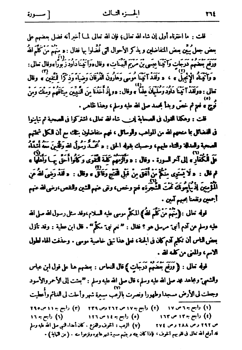 قُلْتُ: مَا اخْتَرْنَاهُ أَوْلَى إِنْ شَاءَ اللَّهُ تَعَالَى، فَإِنَّ اللَّهَ تَعَالَى لَمَّا أَخْبَرَ أَنَّهُ فَضَّلَ بَعْضَهُمْ عَلَى بَعْضٍ جَعَلَ يُبَيِّنُ بَعْضَ الْمُتَفَاضِلِينَ وَيَذْكُرُ الْأَحْوَالَ الَّتِي فُضِّلُوا بِهَا فَقَالَ:" مِنْهُمْ مَنْ كَلَّمَ اللَّهُ وَرَفَعَ بَعْضَهُمْ دَرَجاتٍ وَآتَيْنا عِيسَى ابْنَ مَرْيَمَ الْبَيِّناتِ" وَقَالَ" وَآتَيْنا داوُدَ زَبُوراً «١» " وَقَالَ تَعَالَى:" وَآتَيْناهُ الْإِنْجِيلَ «٢» "،" وَلَقَدْ آتَيْنا مُوسى وَهارُونَ الْفُرْقانَ وَضِياءً وَذِكْراً لِلْمُتَّقِينَ «٣» " وَقَالَ تَعَالَى:" وَلَقَدْ آتَيْنا داوُدَ وَسُلَيْمانَ عِلْماً «٤» " وَقَالَ:" وَإِذْ أَخَذْنا مِنَ النَّبِيِّينَ مِيثاقَهُمْ وَمِنْكَ وَمِنْ نُوحٍ «٥» " فَعَمَّ ثُمَّ خَصَّ وَبَدَأَ بِمُحَمَّدٍ صَلَّى اللَّهُ عَلَيْهِ وَسَلَّمَ، وَهَذَا ظَاهِرٌ. قُلْتُ: وَهَكَذَا الْقَوْلُ فِي الصَّحَابَةِ إِنْ شَاءَ اللَّهُ تَعَالَى، اشْتَرَكُوا فِي الصُّحْبَةِ ثُمَّ تَبَايَنُوا فِي الْفَضَائِلِ بِمَا مَنَحَهُمُ اللَّهُ مِنَ الْمَوَاهِبِ وَالْوَسَائِلِ، فَهُمْ مُتَفَاضِلُونَ بِتِلْكَ مَعَ أَنَّ الْكُلَّ شَمَلَتْهُمُ الصُّحْبَةُ وَالْعَدَالَةُ وَالثَّنَاءُ عَلَيْهِمْ، وَحَسْبُكَ بِقَوْلِهِ الْحَقِّ:" مُحَمَّدٌ رَسُولُ اللَّهِ وَالَّذِينَ مَعَهُ أَشِدَّاءُ عَلَى الْكُفَّارِ «٦» " إِلَى آخِرِ السُّورَةِ. وَقَالَ:" وَأَلْزَمَهُمْ كَلِمَةَ التَّقْوى وَكانُوا أَحَقَّ بِها وَأَهْلَها «٧» " ثُمَّ قَالَ:" لَا يَسْتَوِي مِنْكُمْ مَنْ أَنْفَقَ مِنْ قَبْلِ الْفَتْحِ وَقاتَلَ «٨» " وَقَالَ:" لَقَدْ رَضِيَ اللَّهُ عَنِ الْمُؤْمِنِينَ إِذْ يُبايِعُونَكَ تَحْتَ الشَّجَرَةِ «٩» " فَعَمَّ وَخَصَّ، وَنَفَى عَنْهُمُ الشَّيْنَ وَالنَّقْصَ، رَضِيَ اللَّهُ عَنْهُمْ أَجْمَعِينَ وَنَفَعَنَا بِحُبِّهِمْ آمِينَ. قَوْلُهُ تَعَالَى: (مِنْهُمْ مَنْ كَلَّمَ اللَّهُ) الْمُكَلَّمُ مُوسَى عَلَيْهِ السَّلَامُ، وَقَدْ سُئِلَ رسوله اللَّهِ صَلَّى اللَّهُ عَلَيْهِ وَسَلَّمَ عَنْ آدَمَ أَنَبِيٌّ مُرْسَلٌ هُوَ؟ فَقَالَ:" نَعَمْ نَبِيٌّ مُكَلَّمٌ". قَالَ ابْنُ عَطِيَّةَ: وَقَدْ تَأَوَّلَ بَعْضُ النَّاسِ أَنَّ تَكْلِيمَ آدَمَ كَانَ فِي الْجَنَّةِ، فَعَلَى هَذَا تَبْقَى خَاصِّيَّةُ مُوسَى. وَحُذِفَتِ الْهَاءُ لِطُولِ الِاسْمِ، وَالْمَعْنَى مَنْ كَلَّمَهُ اللَّهُ. قَوْلُهُ تَعَالَى: (وَرَفَعَ بَعْضَهُمْ دَرَجاتٍ) قَالَ النَّحَّاسُ: بَعْضَهُمْ هُنَا عَلَى قَوْلِ ابْنِ عَبَّاسٍ وَالشَّعْبِيِّ وَمُجَاهِدٍ مُحَمَّدٌ صَلَّى اللَّهُ عَلَيْهِ وَسَلَّمَ، قَالَ صَلَّى اللَّهُ عَلَيْهِ وَسَلَّمَ:" بُعِثْتُ إِلَى الْأَحْمَرِ وَالْأَسْوَدِ وَجُعِلَتْ لِيَ الْأَرْضُ مَسْجِدًا وَطَهُورًا وَنُصِرْتُ بِالرُّعْبِ «١٠» مَسِيرَةَ شهر وأحلت لي الغنائم وأعطيت