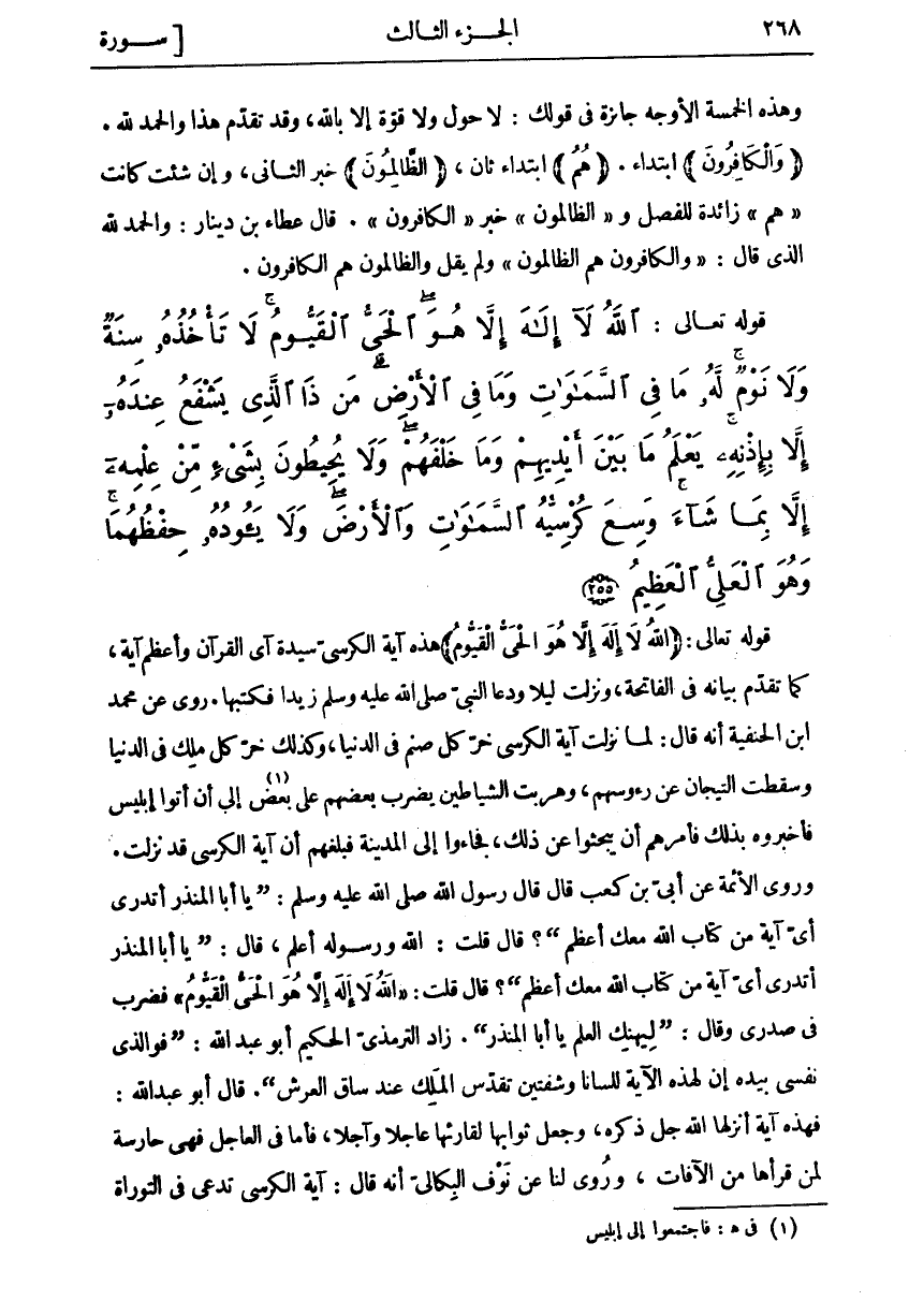 اللَّهُ لَا إِلهَ إِلاَّ هُوَ الْحَيُّ الْقَيُّومُ لَا تَأْخُذُهُ سِنَةٌ وَلا نَوْمٌ لَهُ مَا فِي السَّماواتِ وَما فِي الْأَرْضِ مَنْ ذَا الَّذِي يَشْفَعُ عِنْدَهُ إِلاَّ بِإِذْنِهِ يَعْلَمُ مَا بَيْنَ أَيْدِيهِمْ وَما خَلْفَهُمْ وَلا يُحِيطُونَ بِشَيْءٍ مِنْ عِلْمِهِ إِلاَّ بِما شاءَ وَسِعَ كُرْسِيُّهُ السَّماواتِ وَالْأَرْضَ وَلا يَؤُدُهُ حِفْظُهُما وَهُوَ الْعَلِيُّ الْعَظِيمُ (٢٥٥)