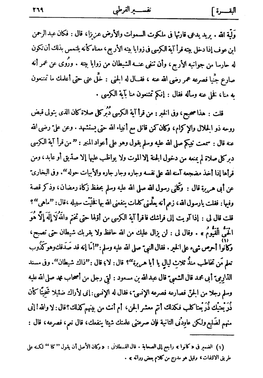 وَلِيَّةُ اللَّهِ. يُرِيدُ يُدْعَى قَارِئُهَا فِي مَلَكُوتِ السموات والأرض عزيزا، قال: فكان عبد الرحمن ابن عَوْفٍ إِذَا دَخَلَ بَيْتَهُ قَرَأَ آيَةَ الْكُرْسِيِّ فِي زَوَايَا بَيْتِهِ الْأَرْبَعِ، مَعْنَاهُ كَأَنَّهُ يَلْتَمِسُ بِذَلِكَ أَنْ تَكُونَ لَهُ حَارِسًا مِنْ جَوَانِبِهِ الْأَرْبَعِ، وَأَنْ تَنْفِيَ عَنْهُ الشَّيْطَانَ مِنْ زَوَايَا بَيْتِهِ. وَرُوِيَ عَنْ عُمَرَ أَنَّهُ صَارَعَ جِنِّيًّا فَصَرَعَهُ عُمَرُ رَضِيَ اللَّهُ عَنْهُ، فَقَالَ لَهُ الْجِنِّيُّ: خَلِّ عَنِّي حَتَّى أُعَلِّمَكَ مَا تَمْتَنِعُونَ بِهِ مِنَّا، فَخَلَّى عَنْهُ وَسَأَلَهُ فَقَالَ: إِنَّكُمْ تَمْتَنِعُونَ مِنَّا بِآيَةِ الْكُرْسِيِّ. قُلْتُ: هَذَا صَحِيحٌ، وفى الخبر: مَنْ قَرَأَ آيَةَ الْكُرْسِيِّ دُبُرَ كُلِّ صَلَاةٍ كَانَ الَّذِي يَتَوَلَّى قَبْضَ رُوحِهِ ذُو الْجَلَالِ وَالْإِكْرَامِ، وَكَانَ كَمَنْ قَاتَلَ مَعَ أَنْبِيَاءِ اللَّهِ حَتَّى يُسْتَشْهَدَ. وَعَنْ عَلِيٍّ رَضِيَ اللَّهُ عَنْهُ قَالَ: سَمِعْتُ نَبِيَّكُمْ صَلَّى اللَّهُ عَلَيْهِ وَسَلَّمَ يَقُولُ وَهُوَ عَلَى أَعْوَادِ الْمِنْبَرِ:" مَنْ قَرَأَ آيَةَ الْكُرْسِيِّ دُبُرَ كُلِّ صَلَاةٍ لَمْ يَمْنَعْهُ مِنْ دُخُولِ الْجَنَّةِ إِلَّا الْمَوْتُ وَلَا يُوَاظِبُ عَلَيْهَا إِلَّا صِدِّيقٌ أَوْ عَابِدٌ، وَمَنْ قَرَأَهَا إِذَا أَخَذَ مَضْجَعَهُ آمَنَهُ اللَّهُ عَلَى نَفْسِهِ وَجَارِهِ وَجَارِ جَارِهِ وَالْأَبْيَاتِ حَوْلَهُ". وَفِي الْبُخَارِيِّ عَنْ أَبِي هُرَيْرَةَ قَالَ: وَكَّلَنِي رَسُولُ اللَّهِ صَلَّى اللَّهُ عَلَيْهِ وَسَلَّمَ بِحِفْظِ زَكَاةِ رَمَضَانَ، وَذَكَرَ قِصَّةً وَفِيهَا: فَقُلْتُ يَا رَسُولَ اللَّهِ، زَعَمَ أَنَّهُ يُعَلِّمُنِي كَلِمَاتٍ يَنْفَعُنِي اللَّهُ بِهَا فَخَلَّيْتُ سَبِيلَهُ، قَالَ:" مَا هِيَ"؟ قُلْتُ قَالَ لِي: إِذَا آوَيْتَ إِلَى فِرَاشِكَ فَاقْرَأْ آيَةَ الْكُرْسِيِّ مِنْ أَوَّلِهَا حَتَّى تَخْتِمَ" اللَّهُ لَا إِلهَ إِلَّا هُوَ الْحَيُّ الْقَيُّومُ". وَقَالَ لِي: لَنْ يَزَالَ عَلَيْكَ مِنَ اللَّهِ حَافِظٌ وَلَا يقربك شيطان حتى تصبح، وكانوا «١» أحرص شي عَلَى الْخَيْرِ. فَقَالَ النَّبِيُّ صَلَّى اللَّهُ عَلَيْهِ وَسَلَّمَ:" أَمَّا إِنَّهُ قَدْ صَدَقَكَ وَهُوَ كَذُوبٌ تَعْلَمُ مَنْ تُخَاطِبُ مُنْذُ ثَلَاثِ لَيَالٍ يَا أَبَا هُرَيْرَةَ"؟ قَالَ: لَا، قَالَ:" ذَاكَ شَيْطَانٌ". وَفِي مُسْنَدِ الدَّارِمِيِّ أَبِي مُحَمَّدٍ قَالَ الشَّعْبِيُّ قَالَ عَبْدُ اللَّهِ بْنُ مَسْعُودٍ: لَقِيَ رَجُلٌ مِنْ أَصْحَابِ مُحَمَّدٍ صَلَّى اللَّهُ عَلَيْهِ وَسَلَّمَ رَجُلًا مِنَ الْجِنِّ فَصَارَعَهُ فَصَرَعَهُ الْإِنْسِيُّ، فَقَالَ لَهُ الْإِنْسِيُّ: إِنِّي لَأَرَاكَ ضَئِيلًا شَخِيتًا كَأَنَّ ذُرَيْعَتَيْكَ ذُرَيْعَتَا كَلْبٍ فَكَذَلِكَ أَنْتُمْ مَعْشَرَ الْجِنِّ، أَمْ أَنْتَ مِنْ بَيْنِهِمْ كَذَلِكَ؟ قَالَ: لَا وَاللَّهِ! إِنِّي مِنْهُمْ لَضَلِيعٌ وَلَكِنْ عَاوِدْنِي الثَّانِيَةَ فَإِنْ صَرَعْتَنِي عَلَّمْتُكَ شَيْئًا يَنْفَعُكَ، قَالَ نَعَمْ، فصرعه، قال: