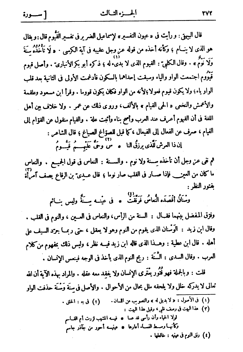 قَالَ الْبَيْهَقِيُّ: وَرَأَيْتُ فِي" عُيُونِ التَّفْسِيرِ" لِإِسْمَاعِيلَ الضرير تَفْسِيرِ الْقَيُّومِ قَالَ: وَيُقَالُ هُوَ الَّذِي لَا يَنَامُ، وَكَأَنَّهُ أَخَذَهُ مِنْ قَوْلِهِ عَزَّ وَجَلَّ عَقِيبَهُ فِي آيَةِ الْكُرْسِيِّ:" لَا تَأْخُذُهُ سِنَةٌ وَلا نَوْمٌ". وَقَالَ الْكَلْبِيُّ: الْقَيُّومُ الَّذِي لَا بدئ «١» لَهُ، ذَكَرَهُ أَبُو بَكْرٍ الْأَنْبَارِيُّ. وَأَصْلُ قَيُّومٍ قَيْوُومٌ اجْتَمَعَتِ الْوَاوُ وَالْيَاءُ وَسُبِقَتْ إِحْدَاهُمَا بِالسُّكُونِ فَأُدْغِمَتِ الْأُولَى فِي الثَّانِيَةِ بَعْدَ قَلْبِ الْوَاوِ يَاءً، وَلَا يَكُونُ قَيُّومٌ فَعُّولًا، لِأَنَّهُ مِنَ الواو فكان يكون قيووما. وَقَرَأَ ابْنُ مَسْعُودٍ وَعَلْقَمَةُ وَالْأَعْمَشُ وَالنَّخَعِيُّ" الْحَيُّ الْقَيَّامُ" بِالْأَلِفِ، وَرُوِيَ ذَلِكَ عَنْ عُمَرَ. وَلَا خِلَافَ بَيْنِ أَهْلِ اللُّغَةِ فِي أَنَّ الْقَيُّومَ أَعْرَفُ عِنْدَ الْعَرَبِ وَأَصَحُّ بِنَاءً وَأَثْبَتُ عِلَّةً. والقيام مَنْقُولٌ عَنِ الْقَوَّامِ إِلَى الْقَيَّامِ، صُرِفَ عَنِ الْفَعَّالِ إِلَى الْفَيْعَالِ، كَمَا قِيلَ لِلصَّوَّاغِ الصَّيَّاغُ، قَالَ الشَّاعِرُ: