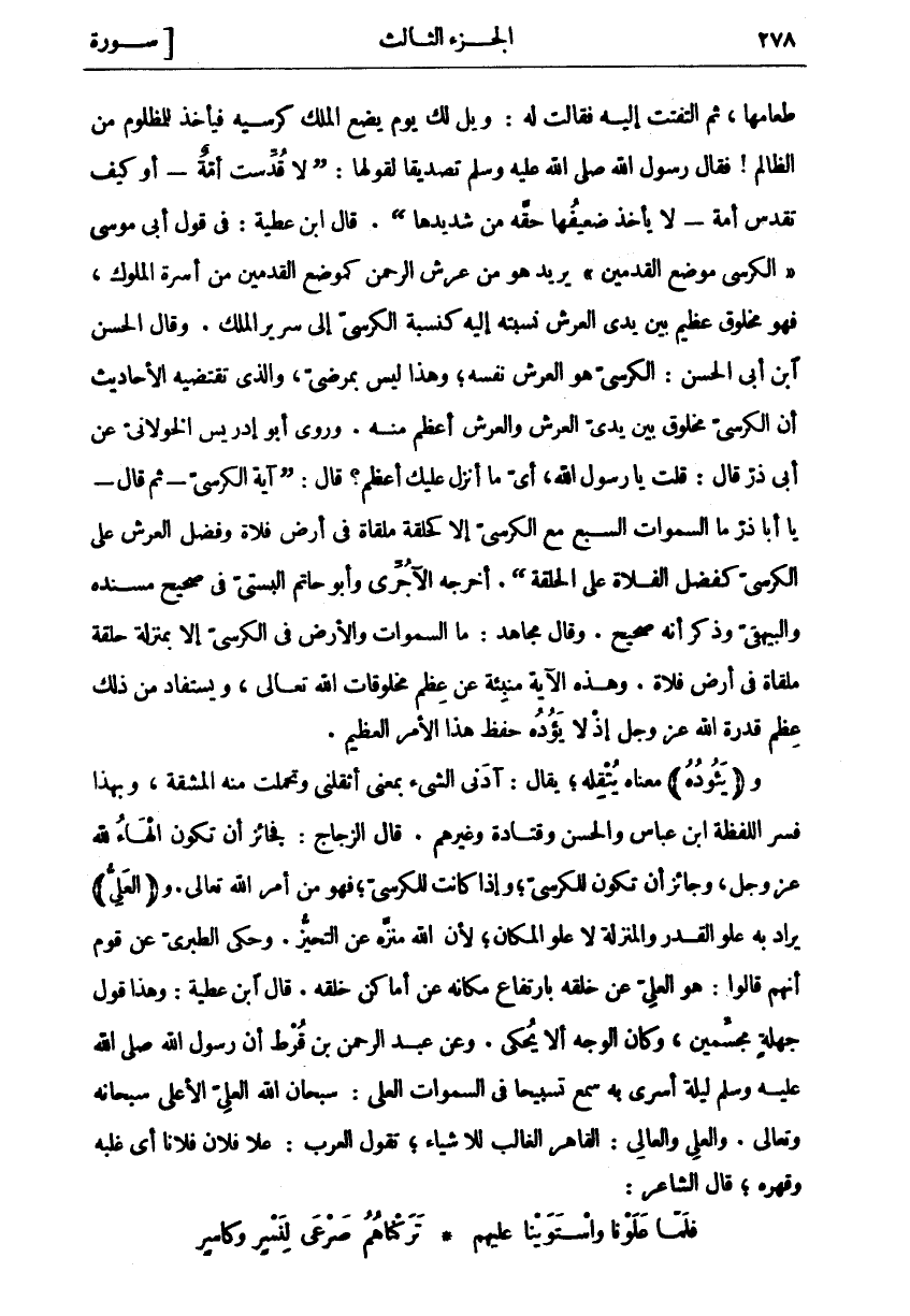طَعَامَهَا، ثُمَّ الْتَفَتَتْ إِلَيْهِ فَقَالَتْ لَهُ: وَيْلٌ لَكَ يَوْمَ يَضَعُ الْمَلِكُ كُرْسِيَّهُ فَيَأْخُذُ لِلْمَظْلُومِ مِنَ الظَّالِمِ! فَقَالَ رَسُولُ اللَّهِ صَلَّى اللَّهُ عَلَيْهِ وَسَلَّمَ تَصْدِيقًا لِقَوْلِهَا:" لَا قُدِّسَتْ أُمَّةٌ- أَوْ كَيْفَ تُقَدَّسُ أُمَّةٌ- لَا يَأْخُذُ ضَعِيفُهَا حَقَّهُ مِنْ شَدِيدِهَا". قَالَ ابْنُ عَطِيَّةَ: فِي قَوْلِ أَبِي مُوسَى" الْكُرْسِيُّ مَوْضِعُ الْقَدَمَيْنِ" يُرِيدُ هُوَ مِنْ عَرْشِ الرَّحْمَنِ كَمَوْضِعِ الْقَدَمَيْنِ مِنْ أَسِرَّةِ الْمُلُوكِ، فَهُوَ مَخْلُوقٌ عَظِيمٌ بَيْنَ يَدَيِ الْعَرْشِ نِسْبَتُهُ إِلَيْهِ كَنِسْبَةِ الْكُرْسِيِّ إِلَى سَرِيرِ الْمَلِكِ. وَقَالَ الْحَسَنُ بْنُ أَبِي الْحَسَنِ: الْكُرْسِيُّ هُوَ الْعَرْشُ نَفْسُهُ، وَهَذَا لَيْسَ بِمُرْضِيٍّ، وَالَّذِي تَقْتَضِيهِ الْأَحَادِيثُ أَنَّ الْكُرْسِيَّ مَخْلُوقٌ بَيْنَ يَدَيِ الْعَرْشِ وَالْعَرْشُ أَعْظَمُ مِنْهُ. وَرَوَى أَبُو إِدْرِيسَ الْخَوْلَانِيُّ عَنْ أَبِي ذَرٍّ قَالَ: قُلْتُ يَا رَسُولَ اللَّهِ، أَيُّ مَا أُنْزِلَ عَلَيْكَ أَعْظَمُ؟ قَالَ:" آيَةُ الْكُرْسِيِّ- ثُمَّ قَالَ- يَا أَبَا ذر ما السموات السبع مع الكرسي إلا كخلقة مُلْقَاةٍ فِي أَرْضِ فَلَاةٍ وَفَضْلُ الْعَرْشِ عَلَى الْكُرْسِيِّ كَفَضْلِ الْفَلَاةِ عَلَى الْحَلْقَةِ". أَخْرَجَهُ الْآجُرِّيُّ وَأَبُو حَاتِمٍ الْبُسْتِيُّ فِي صَحِيحِ مُسْنَدِهِ وَالْبَيْهَقِيُّ وذكر أنه صحيح. وقال مجاهد: ما السموات وَالْأَرْضُ فِي الْكُرْسِيِّ إِلَّا بِمَنْزِلَةِ حَلْقَةٍ مُلْقَاةٍ فِي أَرْضٍ فَلَاةٍ. وَهَذِهِ الْآيَةُ مُنْبِئَةٌ عَنْ عِظَمِ مَخْلُوقَاتِ اللَّهِ تَعَالَى، وَيُسْتَفَادُ مِنْ ذَلِكَ عِظَمُ قُدْرَةِ اللَّهِ عَزَّ وَجَلَّ إِذْ لَا يؤده حفظ هذا الامر العظيم. و (يَؤُدُهُ) مَعْنَاهُ يُثْقِلُهُ، يُقَالُ: آدَنِي الشَّيْءُ بِمَعْنَى أَثْقَلَنِي وَتَحَمَّلْتُ مِنْهُ الْمَشَقَّةَ، وَبِهَذَا فَسَّرَ اللَّفْظَةَ ابْنُ عَبَّاسٍ وَالْحَسَنُ وَقَتَادَةُ وَغَيْرُهُمْ. قَالَ الزَّجَّاجُ: فَجَائِزٌ أَنْ تَكُونَ الْهَاءُ لِلَّهِ عَزَّ وَجَلَّ، وَجَائِزٌ أَنْ تَكُونَ لِلْكُرْسِيِّ، وَإِذَا كَانَتْ لِلْكُرْسِيِّ، فَهُوَ مِنْ أَمْرِ اللَّهِ تَعَالَى. وَ (الْعَلِيُّ) يُرَادُ بِهِ عُلُوُّ الْقَدْرِ وَالْمَنْزِلَةِ لَا عُلُوُّ الْمَكَانِ، لِأَنَّ اللَّهَ مُنَزَّهٌ عَنِ التَّحَيُّزِ. وَحَكَى الطَّبَرِيُّ عَنْ قَوْمٍ أَنَّهُمْ قَالُوا: هُوَ الْعَلِيُّ عَنْ خَلْقِهِ بِارْتِفَاعِ مَكَانِهِ عَنْ أَمَاكِنِ خَلْقِهِ. قَالَ ابْنُ عَطِيَّةَ: وَهَذَا قَوْلُ جَهَلَةٍ مُجَسِّمِينَ، وَكَانَ الْوَجْهُ أَلَّا يُحْكَى. وَعَنْ عَبْدِ الرَّحْمَنِ بْنِ قُرْطٍ أَنَّ رَسُولَ اللَّهِ صَلَّى اللَّهُ عَلَيْهِ وَسَلَّمَ لَيْلَةَ أُسْرِيَ بِهِ سَمِعَ تَسْبِيحًا فِي السموات الْعُلَى: سُبْحَانَ اللَّهِ الْعَلِيِّ الْأَعْلَى سُبْحَانَهُ وَتَعَالَى. وَالْعَلِيُّ وَالْعَالِي: الْقَاهِرُ الْغَالِبُ لِلْأَشْيَاءِ، تَقُولُ الْعَرَبُ: عَلَا فُلَانٌ فُلَانًا أَيْ غَلَبَهُ وَقَهَرَهُ، قَالَ الشَّاعِرُ:
