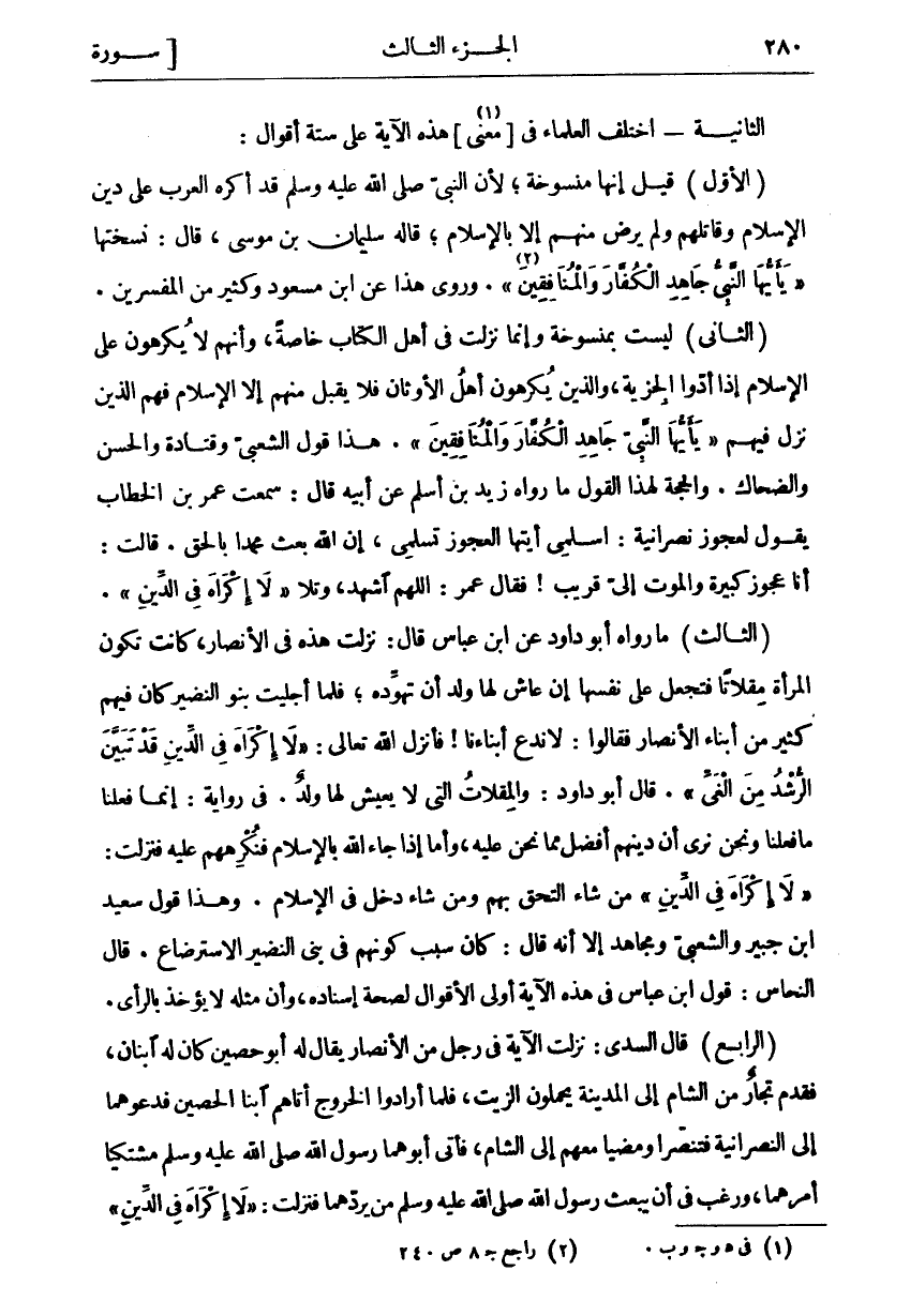 الثَّانِيَةُ- اخْتَلَفَ الْعُلَمَاءُ فِي [مَعْنَى «١»] هَذِهِ الْآيَةِ عَلَى سِتَّةِ أَقْوَالٍ: (الْأَوَّلُ) قِيلَ إِنَّهَا مَنْسُوخَةٌ، لِأَنَّ النَّبِيَّ صَلَّى اللَّهُ عَلَيْهِ وَسَلَّمَ قَدْ أَكْرَهَ الْعَرَبَ عَلَى دِينِ الْإِسْلَامِ وَقَاتَلَهُمْ وَلَمْ يَرْضَ مِنْهُمْ إِلَّا بِالْإِسْلَامِ، قَالَهُ سُلَيْمَانُ بْنُ مُوسَى، قَالَ: نَسَخَتْهَا" يَا أَيُّهَا النَّبِيُّ جاهِدِ الْكُفَّارَ وَالْمُنافِقِينَ «٢» ". وَرُوِيَ هَذَا عَنِ ابْنِ مَسْعُودٍ وَكَثِيرٍ مِنَ الْمُفَسِّرِينَ. (الثَّانِي) لَيْسَتْ بِمَنْسُوخَةٍ وَإِنَّمَا نَزَلَتْ فِي أَهْلِ الْكِتَابِ خَاصَّةً، وَأَنَّهُمْ لَا يُكْرَهُونَ عَلَى الْإِسْلَامِ إِذَا أَدَّوُا الْجِزْيَةَ، وَالَّذِينَ يُكْرَهُونَ أَهْلُ الْأَوْثَانِ فَلَا يُقْبَلُ مِنْهُمْ إِلَّا الْإِسْلَامُ فَهُمُ الَّذِينَ نَزَلَ فِيهِمْ" يَا أَيُّهَا النَّبِيُّ جاهِدِ الْكُفَّارَ وَالْمُنافِقِينَ". هَذَا قَوْلُ الشَّعْبِيِّ وَقَتَادَةَ وَالْحَسَنِ وَالضَّحَّاكِ. وَالْحُجَّةُ لِهَذَا الْقَوْلِ مَا رَوَاهُ زَيْدُ بْنُ أَسْلَمَ عَنْ أَبِيهِ قَالَ: سَمِعْتُ عُمَرَ بْنَ الْخَطَّابِ يَقُولُ لِعَجُوزٍ نَصْرَانِيَّةٍ: أَسْلِمِي أَيَّتُهَا الْعَجُوزُ تَسْلَمِي، إِنَّ اللَّهَ بَعَثَ مُحَمَّدًا بِالْحَقِّ. قَالَتْ: أَنَا عَجُوزٌ كَبِيرَةٌ وَالْمَوْتُ إِلَيَّ قَرِيبٌ! فَقَالَ عُمَرُ: اللَّهُمَّ اشْهَدْ، وَتَلَا" لَا إِكْراهَ فِي الدِّينِ". (الثَّالِثُ) مَا رَوَاهُ أَبُو دَاوُدَ عَنِ ابْنِ عَبَّاسٍ قَالَ: نَزَلَتْ هَذِهِ فِي الْأَنْصَارِ، كَانَتْ تَكُونُ الْمَرْأَةُ مِقْلَاتًا فَتَجْعَلُ عَلَى نَفْسِهَا إِنْ عَاشَ لَهَا وَلَدٌ أَنْ تُهَوِّدَهُ، فَلَمَّا أُجْلِيَتْ بَنُو النَّضِيرِ كَانَ فِيهِمْ كَثِيرٌ مِنْ أَبْنَاءِ الْأَنْصَارِ فَقَالُوا: لَا نَدَعُ أَبْنَاءَنَا! فَأَنْزَلَ اللَّهُ تَعَالَى:" لَا إِكْراهَ فِي الدِّينِ قَدْ تَبَيَّنَ الرُّشْدُ مِنَ الْغَيِّ". قَالَ أَبُو دَاوُدَ: وَالْمِقْلَاتُ الَّتِي لَا يَعِيشُ لَهَا وَلَدٌ. فِي رِوَايَةٍ: إِنَّمَا فَعَلْنَا مَا فَعَلْنَا وَنَحْنُ نَرَى أَنَّ دِينَهُمْ أَفْضَلُ مِمَّا نَحْنُ عَلَيْهِ، وَأَمَّا إِذَا جَاءَ اللَّهُ بِالْإِسْلَامِ فَنُكْرِهُهُمْ عَلَيْهِ فَنَزَلَتْ:" لَا إِكْراهَ فِي الدِّينِ" مَنْ شَاءَ الْتَحَقَ بِهِمْ وَمَنْ شَاءَ دَخَلَ في الإسلام. وهذا قول سعيد ابن جُبَيْرٍ وَالشَّعْبِيِّ وَمُجَاهِدٍ إِلَّا أَنَّهُ قَالَ: كَانَ سَبَبَ كَوْنِهِمْ فِي بَنِي النَّضِيرِ الِاسْتِرْضَاعُ. قَالَ النَّحَّاسُ: قَوْلُ ابْنِ عَبَّاسٍ فِي هَذِهِ الْآيَةِ أَوْلَى الْأَقْوَالِ لِصِحَّةِ إِسْنَادِهِ، وَأَنَّ مِثْلَهُ لَا يُؤْخَذُ بِالرَّأْيِ. (الرَّابِعُ) قَالَ السُّدِّيُّ: نَزَلَتِ الْآيَةُ فِي رَجُلٍ مِنَ الْأَنْصَارِ يُقَالُ لَهُ أَبُو حُصَيْنٍ كَانَ لَهُ ابْنَانِ، فَقَدِمَ تُجَّارٌ مِنَ الشَّامِ إِلَى الْمَدِينَةِ يَحْمِلُونَ الزَّيْتَ، فَلَمَّا أَرَادُوا الْخُرُوجَ أَتَاهُمُ ابْنَا الْحُصَيْنِ فَدَعَوْهُمَا إِلَى النَّصْرَانِيَّةِ فَتَنَصَّرَا وَمَضَيَا مَعَهُمْ إِلَى الشَّامِ، فَأَتَى أَبُوهُمَا رَسُولَ اللَّهِ صَلَّى اللَّهُ عَلَيْهِ وَسَلَّمَ مُشْتَكِيًا أَمْرَهُمَا، وَرَغِبَ فِي أَنْ يَبْعَثَ رَسُولُ اللَّهِ صَلَّى اللَّهُ عَلَيْهِ وَسَلَّمَ مَنْ يَرُدُّهُمَا فَنَزَلَتْ:" لا إِكْراهَ فِي الدِّينِ"