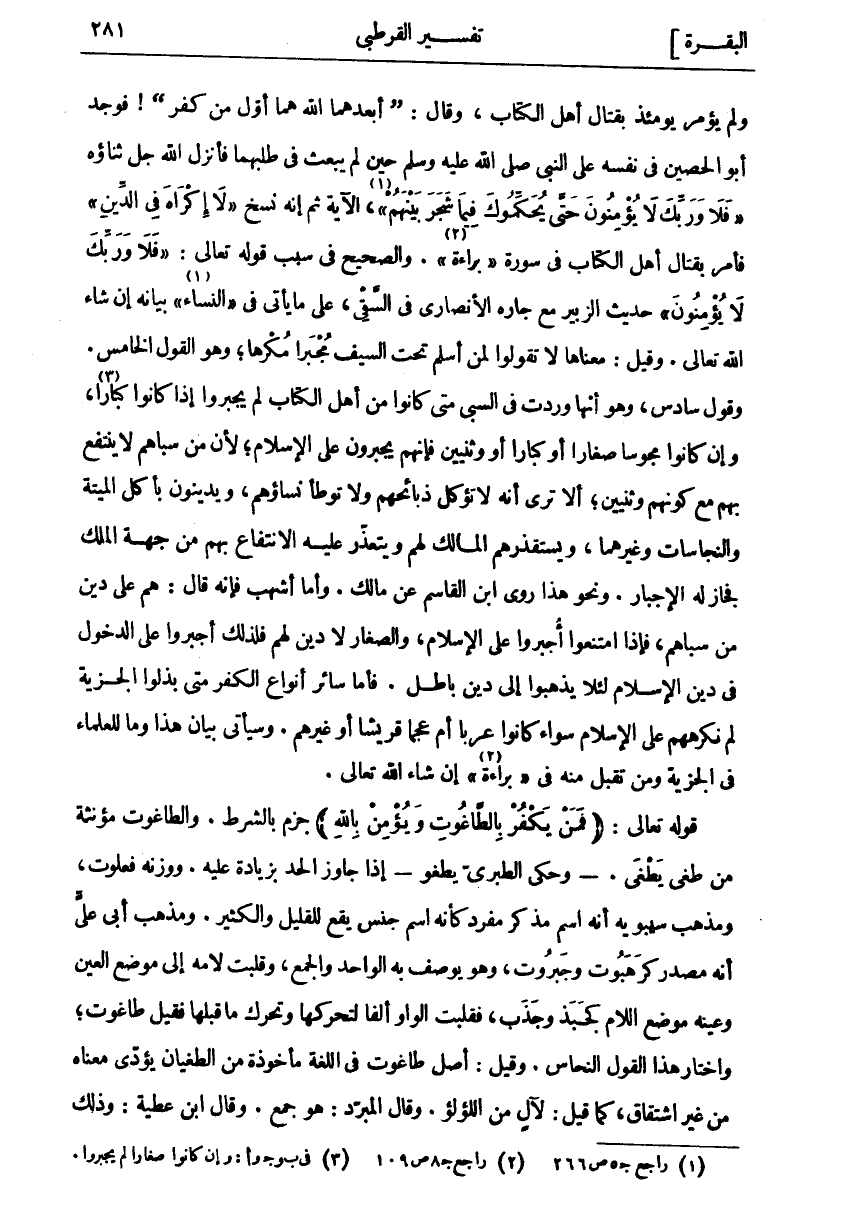وَلَمْ يُؤْمَرْ يَوْمَئِذٍ بِقِتَالِ أَهْلِ الْكِتَابِ، وَقَالَ:" أَبْعَدَهُمَا اللَّهُ هُمَا أَوَّلُ مَنْ كَفَرَ"! فَوَجَدَ أَبُو الْحُصَيْنِ فِي نَفْسِهِ عَلَى النَّبِيِّ صَلَّى اللَّهُ عَلَيْهِ وَسَلَّمَ حِينَ لَمْ يَبْعَثْ فِي طَلَبِهِمَا فَأَنْزَلَ اللَّهُ جَلَّ ثَنَاؤُهُ" فَلا وَرَبِّكَ لَا يُؤْمِنُونَ حَتَّى يُحَكِّمُوكَ فِيما شَجَرَ بَيْنَهُمْ «١» "، الْآيَةَ ثُمَّ إِنَّهُ نَسَخَ" لَا إِكْراهَ فِي الدِّينِ" فَأَمَرَ بِقِتَالِ أَهْلِ الْكِتَابِ فِي سُورَةِ" بَرَاءَةٌ «٢» ". وَالصَّحِيحُ فِي سَبَبِ قَوْلِهِ تَعَالَى:" فَلا وَرَبِّكَ لَا يُؤْمِنُونَ" حَدِيثُ الزُّبَيْرِ مَعَ جَارِهِ الْأَنْصَارِيِّ فِي السَّقْيِ، عَلَى مَا يَأْتِي فِي" النِّسَاءِ «٣» " بَيَانُهُ إِنْ شَاءَ اللَّهُ تَعَالَى. وَقِيلَ: مَعْنَاهَا لَا تَقُولُوا لِمَنْ أَسْلَمَ تَحْتَ السَّيْفِ مُجْبَرًا مُكْرَهًا، وَهُوَ الْقَوْلُ الْخَامِسُ. وَقَوْلٌ سَادِسٌ، وَهُوَ أَنَّهَا وَرَدَتْ فِي السَّبْيِ مَتَى كَانُوا مِنْ أَهْلِ الْكِتَابِ لَمْ يُجْبَرُوا إِذَا كَانُوا كِبَارًا «٤»، وَإِنْ كَانُوا مَجُوسًا صِغَارًا أَوْ كِبَارًا أَوْ وَثَنِيِّينَ فَإِنَّهُمْ يُجْبَرُونَ عَلَى الْإِسْلَامِ، لِأَنَّ مَنْ سَبَاهُمْ لَا يَنْتَفِعُ بِهِمْ مَعَ كَوْنِهِمْ وَثَنِيِّينَ، أَلَا تَرَى أَنَّهُ لَا تُؤْكَلُ ذَبَائِحُهُمْ وَلَا تُوطَأُ نِسَاؤُهُمْ، وَيَدِينُونَ بِأَكْلِ الْمَيْتَةِ وَالنَّجَاسَاتِ وَغَيْرِهِمَا، وَيَسْتَقْذِرُهُمُ الْمَالِكُ لَهُمْ وَيَتَعَذَّرُ عَلَيْهِ الِانْتِفَاعُ بِهِمْ مِنْ جِهَةِ الْمِلْكِ فَجَازَ لَهُ الْإِجْبَارُ. وَنَحْوَ هَذَا رَوَى ابْنُ الْقَاسِمِ عَنْ مَالِكٍ. وَأَمَّا أَشْهَبُ فَإِنَّهُ قَالَ: هُمْ عَلَى دِينِ مَنْ سَبَاهُمْ، فَإِذَا امْتَنَعُوا أُجْبِرُوا عَلَى الْإِسْلَامِ، وَالصِّغَارُ لَا دِينَ لَهُمْ فَلِذَلِكَ أُجْبِرُوا عَلَى الدُّخُولِ فِي دِينِ الْإِسْلَامِ لِئَلَّا يَذْهَبُوا إِلَى دِينٍ بَاطِلٍ. فَأَمَّا سَائِرُ أَنْوَاعِ الْكُفْرِ مَتَى بَذَلُوا الْجِزْيَةَ لَمْ نُكْرِهْهُمْ عَلَى الْإِسْلَامِ سَوَاءٌ كَانُوا عَرَبًا أَمْ عَجَمًا قُرَيْشًا أَوْ غَيْرَهُمْ. وَسَيَأْتِي بَيَانُ هَذَا وَمَا لِلْعُلَمَاءِ فِي الْجِزْيَةِ وَمَنْ تُقْبَلُ مِنْهُ فِي" بَرَاءَةٌ «٥» " إِنْ شَاءَ اللَّهُ تَعَالَى. قَوْلُهُ تَعَالَى: (فَمَنْ يَكْفُرْ بِالطَّاغُوتِ وَيُؤْمِنْ بِاللَّهِ) جَزْمٌ بِالشَّرْطِ. وَالطَّاغُوتُ مُؤَنَّثَةٌ مِنْ طغى يطغى.- وحكى الطبري يطغوإذا جَاوَزَ الْحَدَّ بِزِيَادَةٍ عَلَيْهِ. وَوَزْنُهُ فَعْلُوتُ، وَمَذْهَبُ سِيبَوَيْهِ أَنَّهُ اسْمٌ مُذَكَّرٌ مُفْرَدٌ كَأَنَّهُ اسْمُ جِنْسٍ يَقَعُ لِلْقَلِيلِ وَالْكَثِيرِ. وَمَذْهَبُ أَبِي عَلِيٍّ أَنَّهُ مَصْدَرٌ كَرَهَبُوتٍ وَجَبَرُوتٍ، وَهُوَ يُوصَفُ بِهِ الْوَاحِدُ وَالْجَمْعُ، وَقُلِبَتْ لَامُهُ إِلَى مَوْضِعِ الْعَيْنِ وَعَيْنُهُ مَوْضِعَ اللَّامِ كَجَبَذَ وَجَذَبَ، فَقُلِبَتِ الْوَاوُ أَلِفًا لِتَحَرُّكِهَا وَتَحَرُّكِ مَا قَبْلَهَا فَقِيلَ طَاغُوتُ، وَاخْتَارَ هَذَا الْقَوْلَ النَّحَّاسُ. وَقِيلَ: أَصْلُ طَاغُوتٍ فِي اللُّغَةِ مَأْخُوذَةٌ مِنَ الطُّغْيَانِ يُؤَدِّي مَعْنَاهُ مِنْ غَيْرِ اشْتِقَاقٍ، كَمَا قِيلَ: لَآلٍ مِنَ اللُّؤْلُؤِ. وَقَالَ الْمُبَرِّدُ: هُوَ جَمْعٌ. وَقَالَ ابْنُ عطية: وذلك