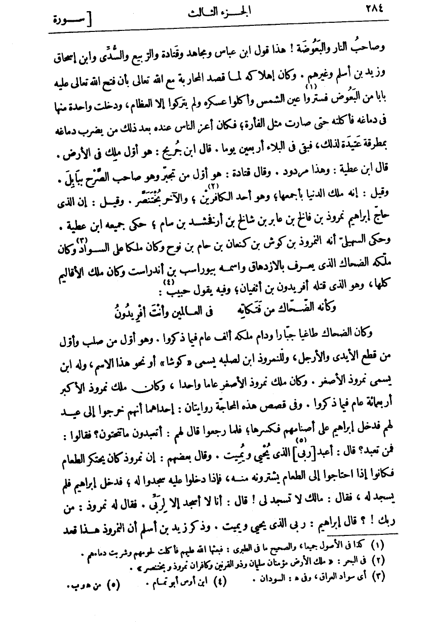 وَكَانَ الضَّحَّاكُ طَاغِيًا جَبَّارًا وَدَامَ مُلْكُهُ أَلْفَ عَامٍ فِيمَا ذَكَرُوا. وَهُوَ أَوَّلُ مَنْ صَلَبَ وَأَوَّلُ مَنْ قَطَعَ الْأَيْدِيَ وَالْأَرْجُلَ، وَلِلنُّمْرُوذِ ابْنٌ لِصُلْبِهِ يُسَمَّى" كُوشَا" أَوْ نَحْوَ هَذَا الِاسْمِ، وَلَهُ ابْنٌ يُسَمَّى نُمْرُوذَ الْأَصْغَرَ. وَكَانَ ملك نمروذ الأصغر عاما واحد ا، وَكَانَ مُلْكُ نُمْرُوذَ الْأَكْبَرِ أَرْبَعَمِائَةِ عَامٍ فِيمَا ذَكَرُوا. وَفِي قَصَصِ هَذِهِ الْمُحَاجَّةِ رِوَايَتَانِ: إِحْدَاهُمَا أنهم خرجوا إلى عيد لهم فدخله إِبْرَاهِيمُ عَلَى أَصْنَامِهِمْ فَكَسَّرَهَا، فَلَمَّا رَجَعُوا قَالَ لَهُمْ: أَتَعْبُدُونَ مَا تَنْحِتُونَ؟ فَقَالُوا: فَمَنْ تَعْبُدُ؟ قَالَ: أَعْبُدُ [رَبِّي «٥»] الَّذِي يُحْيِي وَيُمِيتُ. وَقَالَ بَعْضُهُمْ: إِنَّ نُمْرُوذَ كَانَ يَحْتَكِرُ الطَّعَامَ فَكَانُوا إِذَا احْتَاجُوا إِلَى الطَّعَامِ يَشْتَرُونَهُ مِنْهُ، فَإِذَا دَخَلُوا عَلَيْهِ سَجَدُوا لَهُ، فَدَخَلَ إِبْرَاهِيمُ فَلَمْ يسجد له، فقال: مالك لَا تَسْجُدُ لِي! قَالَ: أَنَا لَا أَسْجُدُ إِلَّا لِرَبِّي. فَقَالَ لَهُ نُمْرُوذُ: مَنْ رَبُّكَ!؟ قَالَ إِبْرَاهِيمُ: رَبِّيَ الَّذِي يُحْيِي وَيُمِيتُ. وَذَكَرَ زيد ابن أسلم أن النمروذ هذا قعد