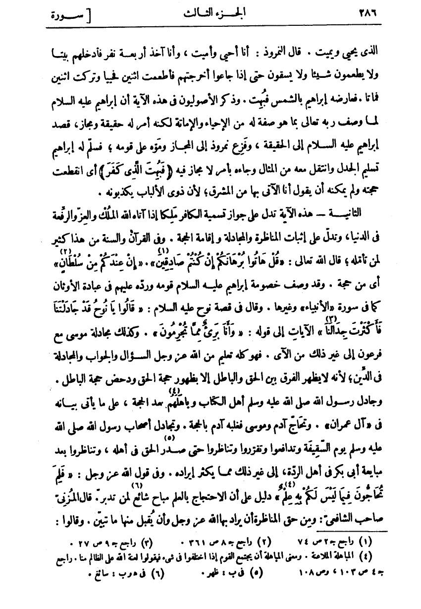 رَبِّيَ الَّذِي يُحْيِي وَيُمِيتُ. قَالَ النُّمْرُوذُ: أَنَا أُحْيِي وَأُمِيتُ، وَأَنَا آخُذُ أَرْبَعَةَ نَفَرٍ فَأُدْخِلُهُمْ بَيْتًا وَلَا يُطْعَمُونَ شَيْئًا وَلَا يُسْقَوْنَ حَتَّى إِذَا جَاعُوا أَخْرَجْتُهُمْ فَأَطْعَمْتُ اثْنَيْنِ فَحَيِيَا وَتَرَكْتُ اثْنَيْنِ فَمَاتَا. فَعَارَضَهُ إِبْرَاهِيمُ بِالشَّمْسِ فَبُهِتَ. وَذَكَرَ الْأُصُولِيُّونَ فِي هَذِهِ الْآيَةِ أَنَّ إِبْرَاهِيمَ عَلَيْهِ السَّلَامُ لَمَّا وَصَفَ رَبَّهُ تَعَالَى بِمَا هُوَ صِفَةٌ لَهُ مِنَ الْإِحْيَاءِ وَالْإِمَاتَةِ لَكِنَّهُ أَمْرٌ لَهُ حَقِيقَةٌ وَمَجَازٌ، قَصَدَ إِبْرَاهِيمُ عَلَيْهِ السَّلَامُ إِلَى الْحَقِيقَةِ، وَفَزِعَ نُمْرُوذُ إِلَى الْمَجَازِ وَمَوَّهَ عَلَى قَوْمِهِ، فَسَلَّمَ لَهُ إِبْرَاهِيمُ تَسْلِيمَ الْجَدَلِ وَانْتَقَلَ مَعَهُ مِنَ الْمِثَالِ وَجَاءَهُ بِأَمْرٍ لَا مَجَازَ فِيهِ (فَبُهِتَ الَّذِي كَفَرَ) أَيِ انْقَطَعَتْ حُجَّتُهُ وَلَمْ يُمْكِنْهُ أَنْ يَقُولَ أَنَا الْآتِي بِهَا مِنَ الْمَشْرِقِ، لِأَنَّ ذَوِي الْأَلْبَابِ يُكَذِّبُونَهُ. الثَّانِيَةُ- هَذِهِ الْآيَةُ تَدُلُّ عَلَى جَوَازِ تَسْمِيَةِ الكافر ملكا إذا آتاه الْمُلْكَ وَالْعِزَّ وَالرِّفْعَةَ فِي الدُّنْيَا، وَتَدُلُّ عَلَى إِثْبَاتِ الْمُنَاظَرَةِ وَالْمُجَادَلَةِ وَإِقَامَةِ الْحُجَّةِ. وَفِي الْقُرْآنِ وَالسُّنَّةِ مِنْ هَذَا كَثِيرٌ لِمَنْ تَأَمَّلَهُ، قَالَ اللَّهُ تَعَالَى:" قُلْ هاتُوا بُرْهانَكُمْ إِنْ كُنْتُمْ صادِقِينَ»