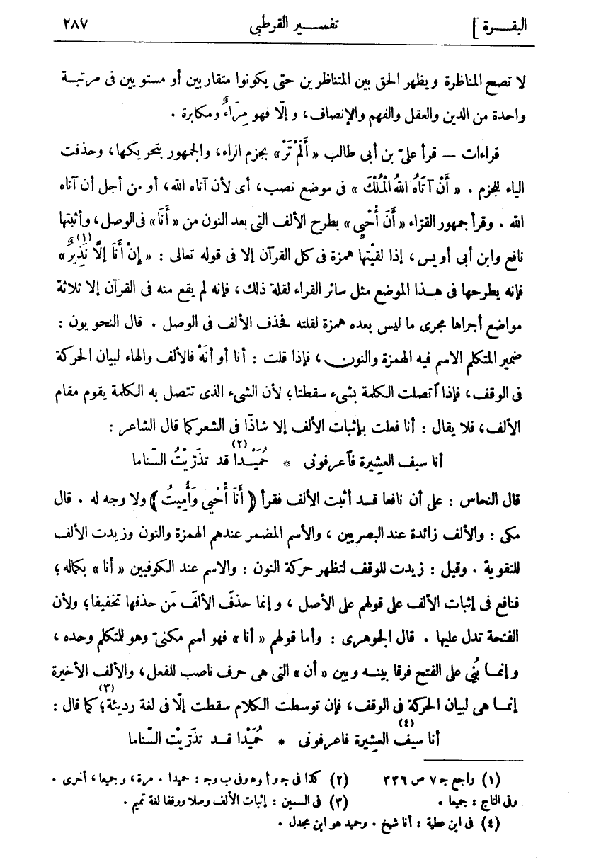 لَا تَصِحُّ الْمُنَاظَرَةُ وَيَظْهَرُ الْحَقُّ بَيْنَ الْمُتَنَاظِرِينَ حَتَّى يَكُونُوا مُتَقَارِبِينَ أَوْ مُسْتَوِيِينَ فِي مَرْتَبَةٍ وَاحِدَةٍ مِنَ الدِّينِ وَالْعَقْلِ وَالْفَهْمِ وَالْإِنْصَافِ، وَإِلَّا فهو مراء ومكابرة. قراءات- قرأ على ابن أَبِي طَالِبٍ" أَلَمْ تَرْ" بِجَزْمِ الرَّاءِ، وَالْجُمْهُورُ بِتَحْرِيكِهَا، وَحُذِفَتِ الْيَاءُ لِلْجَزْمِ." أَنْ آتاهُ اللَّهُ الْمُلْكَ" فِي مَوْضِعِ نَصْبٍ، أَيْ لِأَنْ آتَاهُ اللَّهُ، أَوْ مِنْ أَجْلِ أَنْ آتَاهُ اللَّهُ. وَقَرَأَ جُمْهُورُ الْقُرَّاءِ" أَنَ أُحْيِي" بِطَرْحِ الْأَلِفِ الَّتِي بَعْدَ النُّونِ مِنْ" أَنَا" فِي الْوَصْلِ، وَأَثْبَتَهَا نَافِعٌ وَابْنُ أَبِي أُوَيْسٍ، إِذَا لَقِيَتْهَا هَمْزَةٌ فِي كُلِّ الْقُرْآنِ إِلَّا فِي قَوْلِهِ تَعَالَى:" إِنْ أَنَا إِلَّا نَذِيرٌ «١» " فَإِنَّهُ يَطْرَحُهَا فِي هَذَا الْمَوْضِعِ مِثْلَ سَائِرِ الْقُرَّاءِ لِقِلَّةِ ذَلِكَ، فَإِنَّهُ لَمْ يَقَعْ مِنْهُ فِي الْقُرْآنِ إِلَّا ثَلَاثَةُ مَوَاضِعَ أَجْرَاهَا مَجْرَى مَا لَيْسَ بَعْدَهُ هَمْزَةٌ لِقِلَّتِهِ فَحَذَفَ الْأَلِفَ فِي الْوَصْلِ. قَالَ النَّحْوِيُّونَ: ضَمِيرُ الْمُتَكَلِّمِ الِاسْمُ فِيهِ الْهَمْزَةُ وَالنُّونُ، فَإِذَا قُلْتُ: أَنَا أَوْ أَنَّهُ فَالْأَلِفُ وَالْهَاءُ لِبَيَانِ الْحَرَكَةِ فِي الْوَقْفِ، فَإِذَا اتَّصَلَتِ الْكَلِمَةُ بِشَيْءٍ سَقَطَتَا، لِأَنَّ الشَّيْءَ الَّذِي تَتَّصِلُ بِهِ الْكَلِمَةُ يَقُومُ مَقَامَ الْأَلِفِ، فَلَا يُقَالُ: أَنَا فَعَلْتُ بِإِثْبَاتِ الْأَلِفِ إِلَّا شَاذًّا فِي الشِّعْرِ كَمَا قَالَ الشَّاعِرُ:
